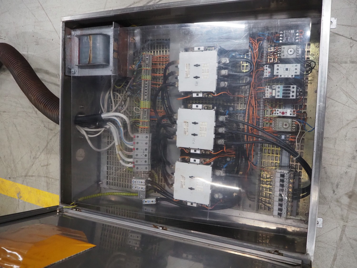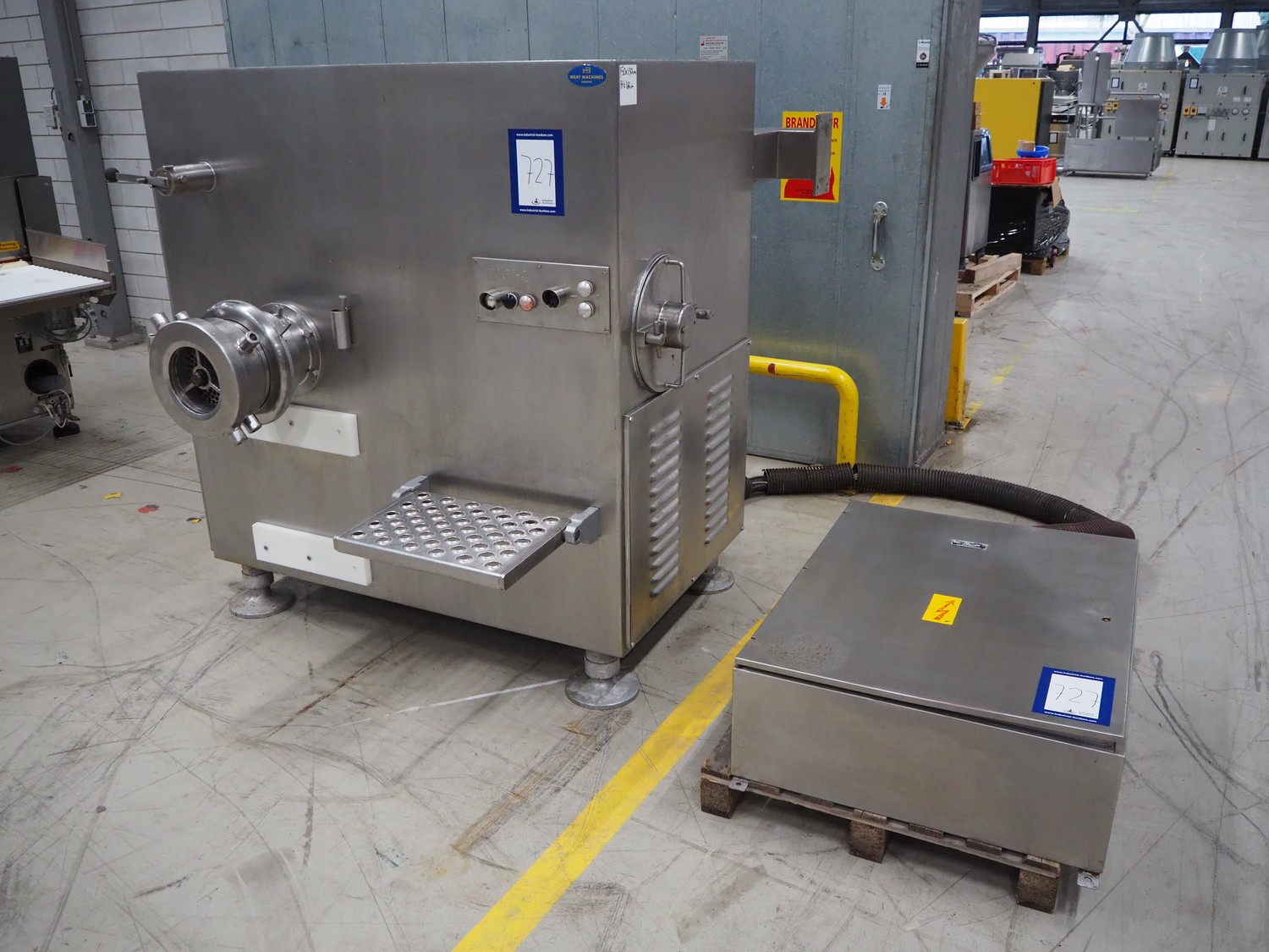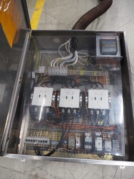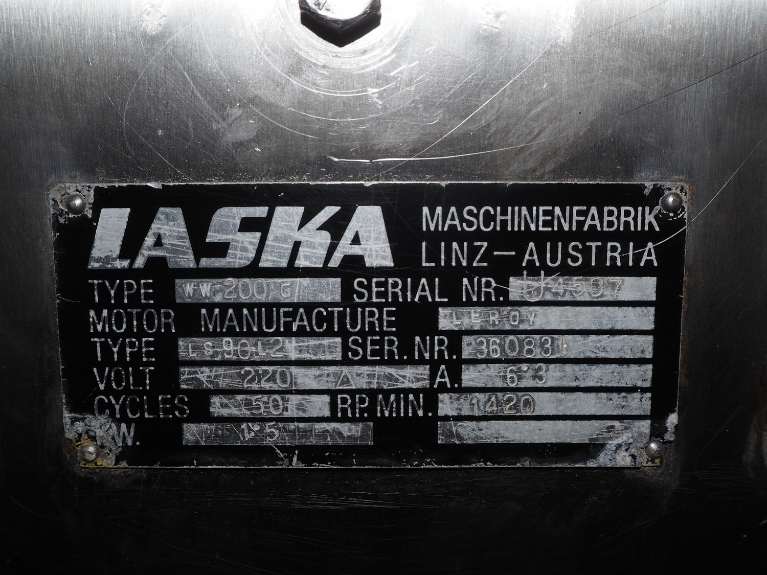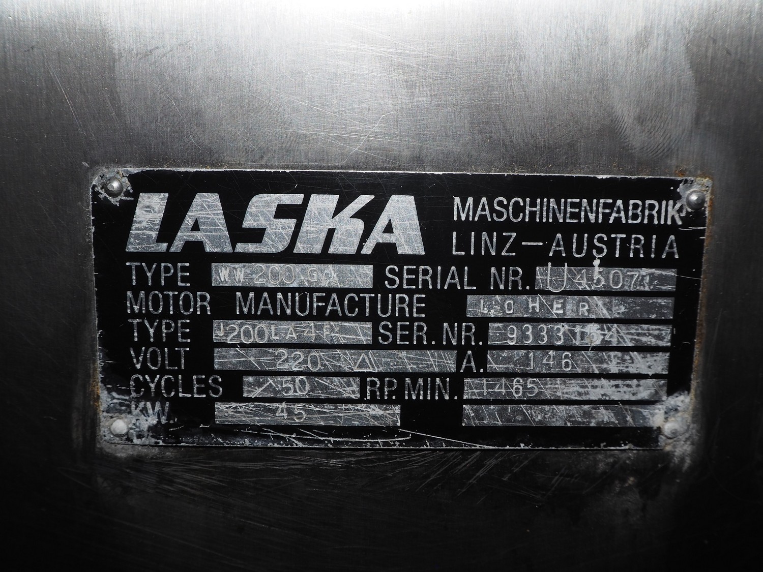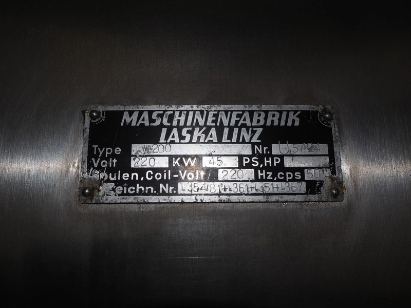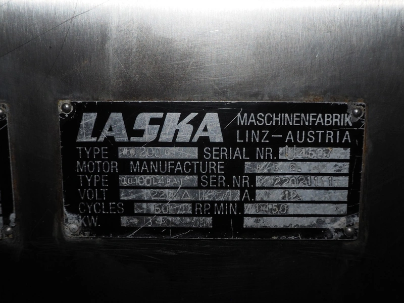 Laska Maschinenfabrik grinder, type: WW 200 G, serial number: U4507, 220 V, 50 Hz, 45 kW, plate diameter: 200 mm, total dimensions: 1630 mm x 1550 mm x 1670 mm. Dimensions switch cabinet: 1000 mm x 800 mm x 320 mm.
