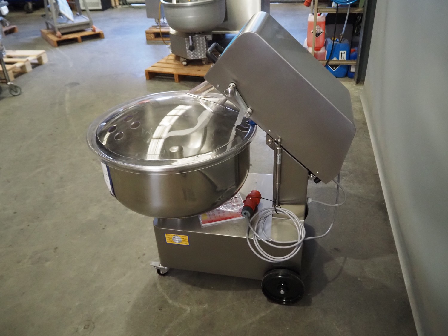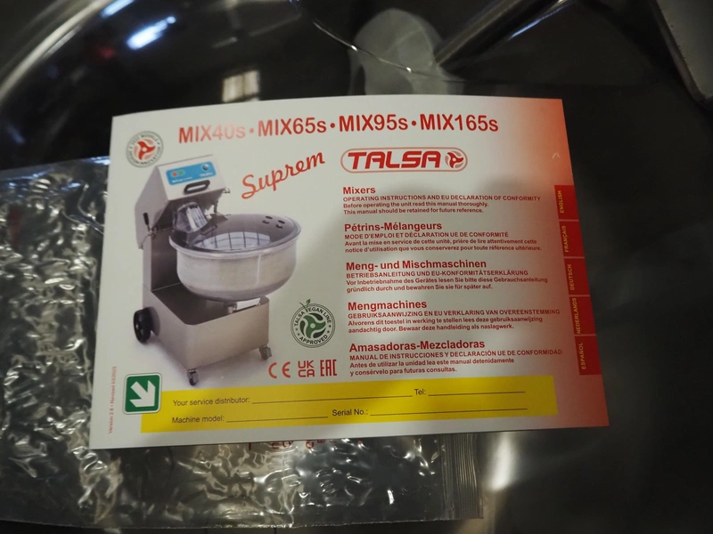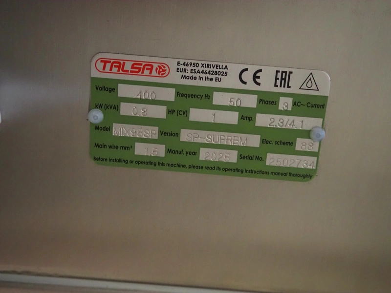 Talsa mobile mixer, model: MIX95SP, version: SP-SUPREM, serial number: 2502734, year of construction: 2025, 400 V, 3 Ph, 50 Hz, 2.3/4.1 A, 0.8 kW, volume: 95 liter, dimensions: 1100 mm x 770 mm x 1170 mm.
