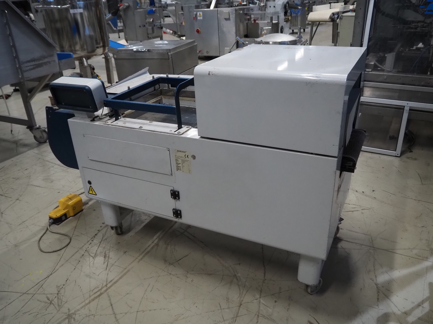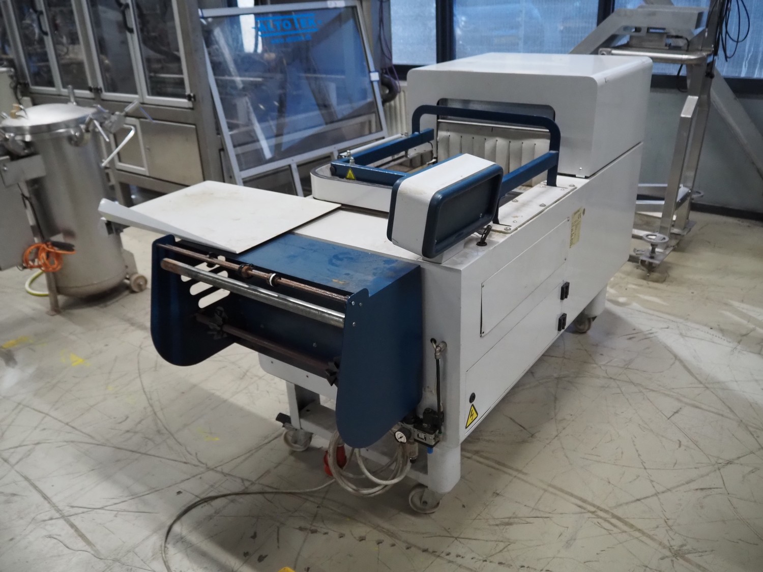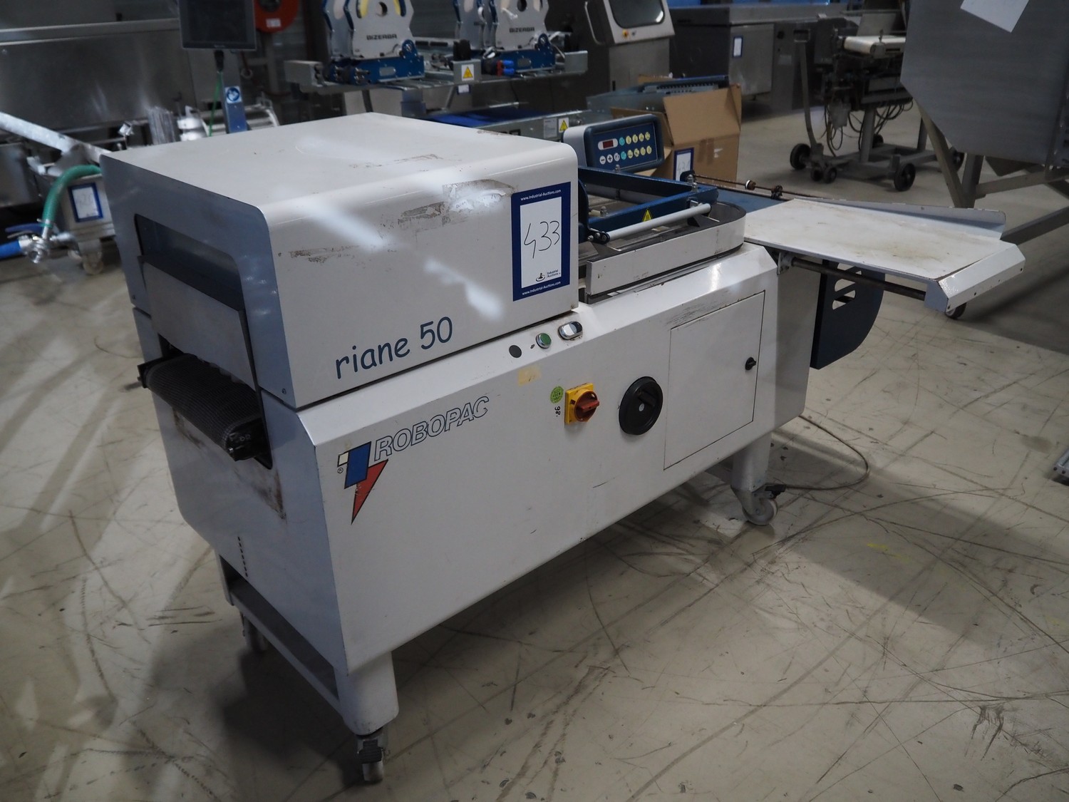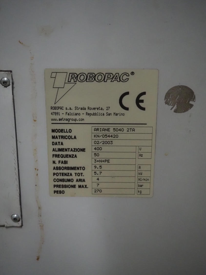 Robopac mobile automatic shrink wrapping machine, model: Ariane 5040 2TA, serial number: KN/054420, year of construction: 02/2003, 400 V, 3 Ph, 50 Hz, 9.5 A, 5.7 kW, seal length: 470 mm and 370 mm, plastic outfeed rollers, roller width: 450 mm, total dimensions: 2200 mm x 2250 mm x 1200 mm.
