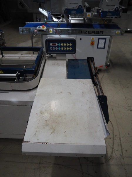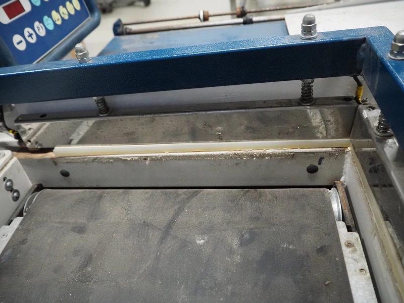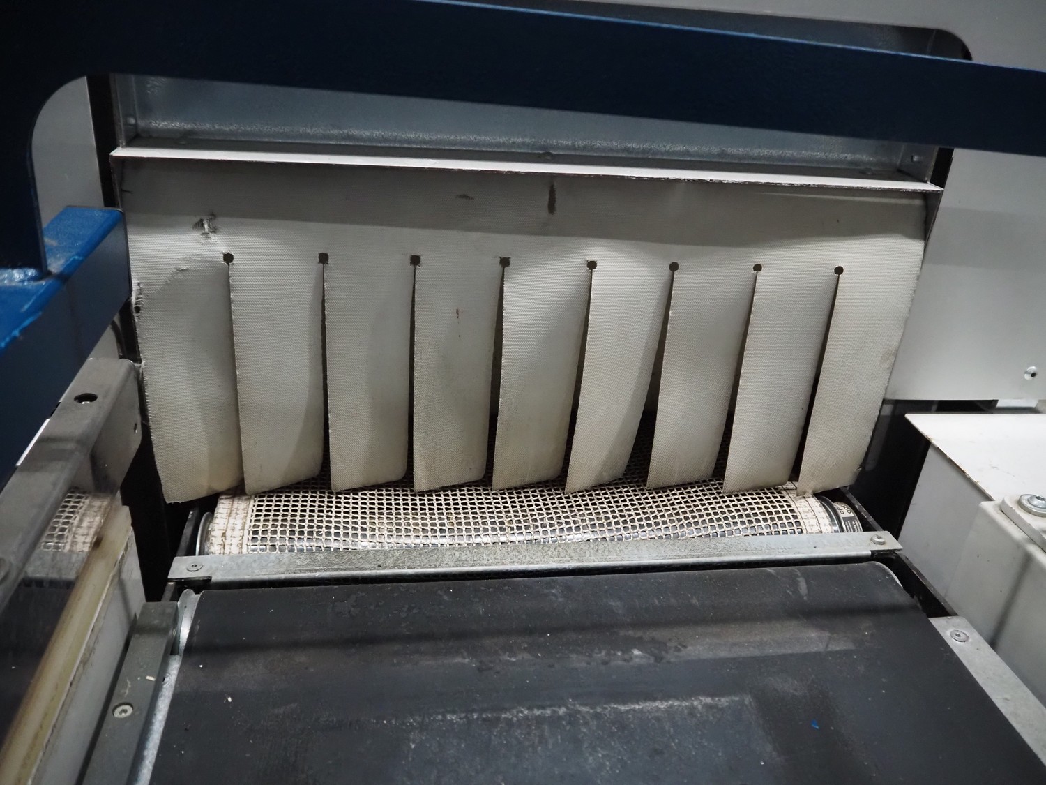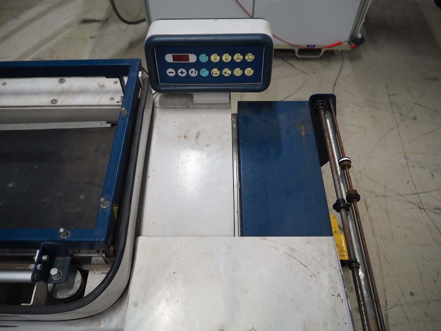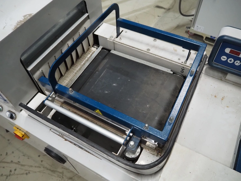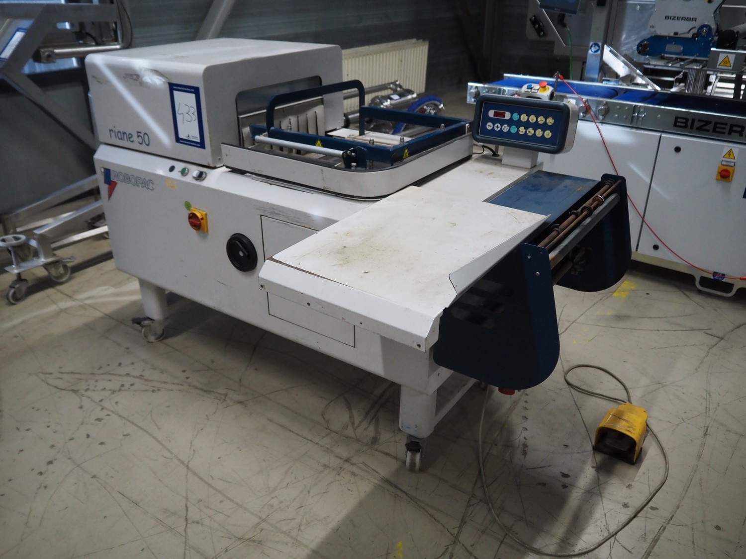 Robopac mobile automatic shrink wrapping machine, model: Ariane 5040 2TA, serial number: KN/054420, year of construction: 02/2003, 400 V, 3 Ph, 50 Hz, 9.5 A, 5.7 kW, seal length: 470 mm and 370 mm, plastic outfeed rollers, roller width: 450 mm, total dimensions: 2200 mm x 2250 mm x 1200 mm.