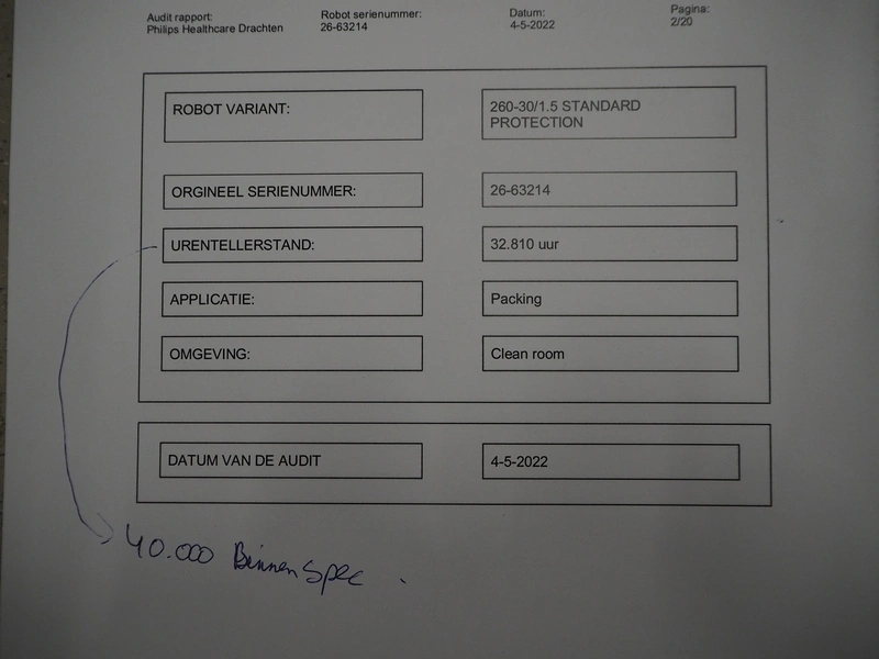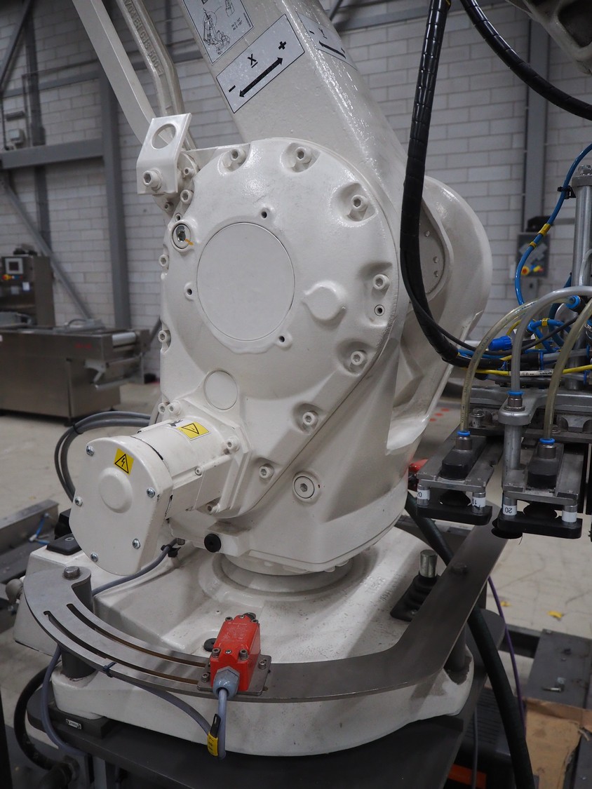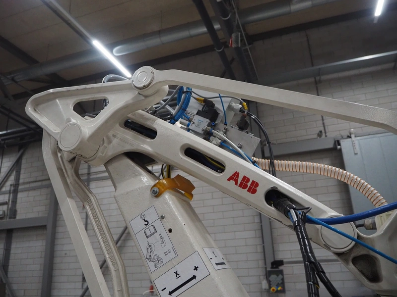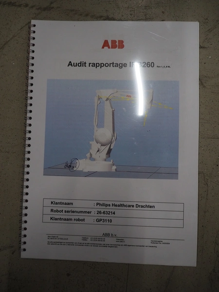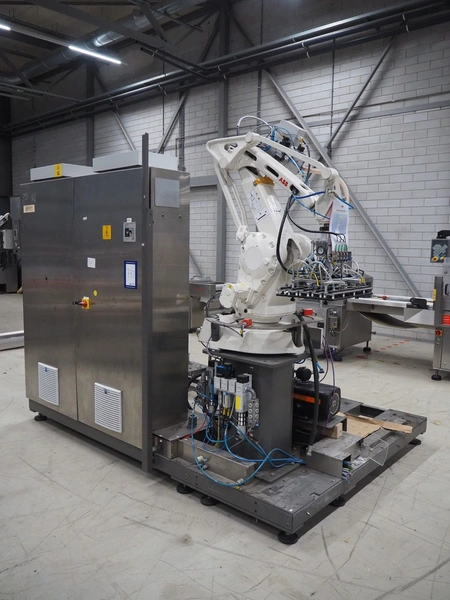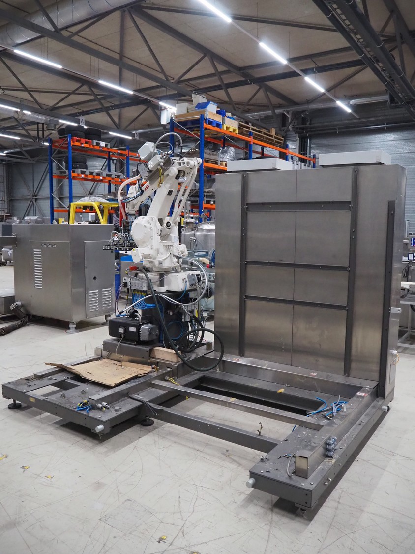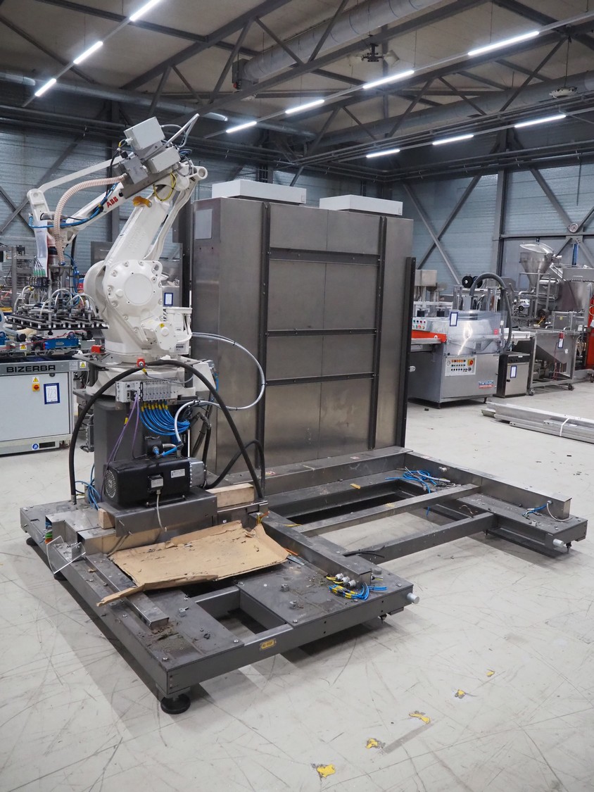 Steel frame with ABB robot, type: IRB 260 M2004, serial number: 26-63214, year of construction: 2011-10-31, weight: 340 kg, Busch vacuum pump, type: SV 1040 D 000 INXX, capacity: 48 m³ per hour, total dimensions: 3000 mm x 2200 mm x 2570 mm.
