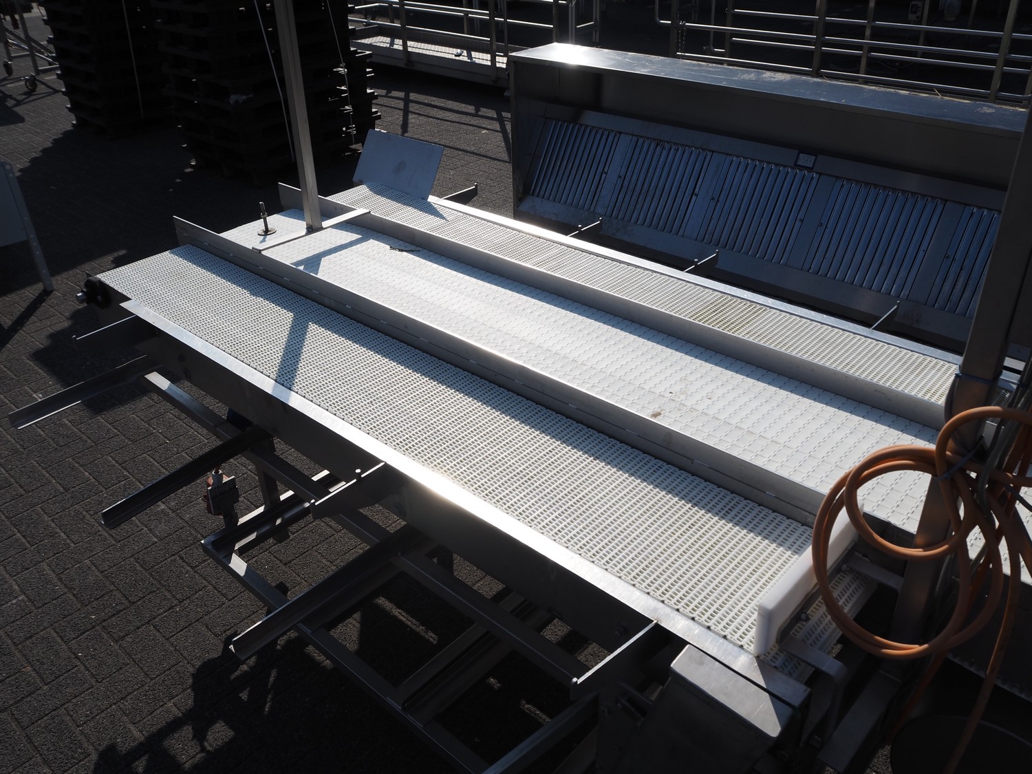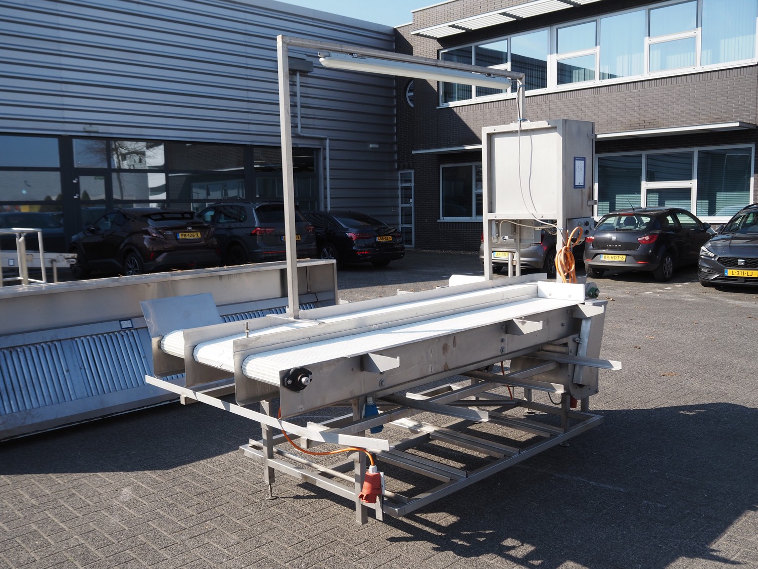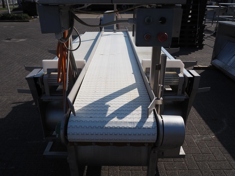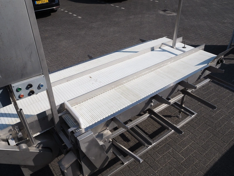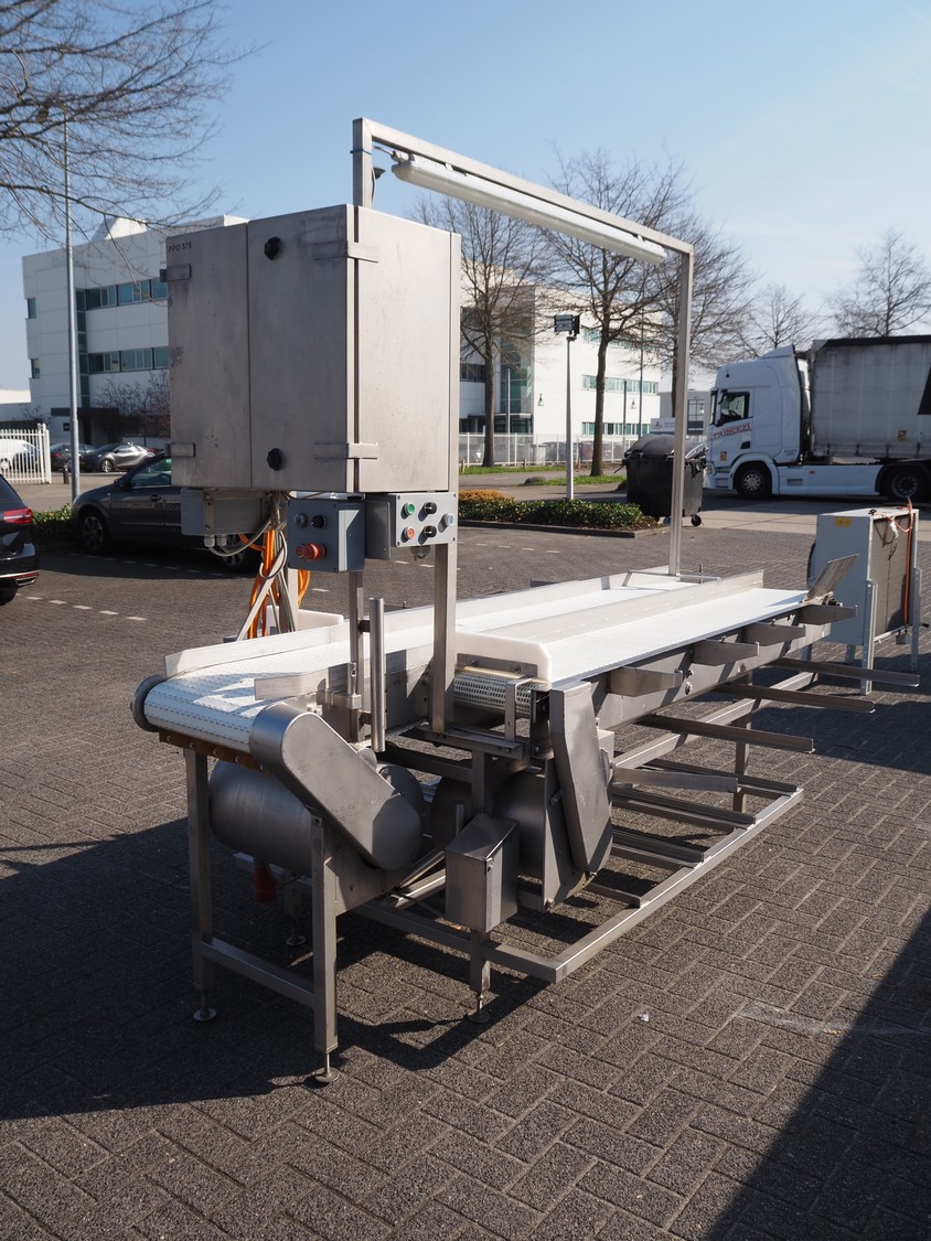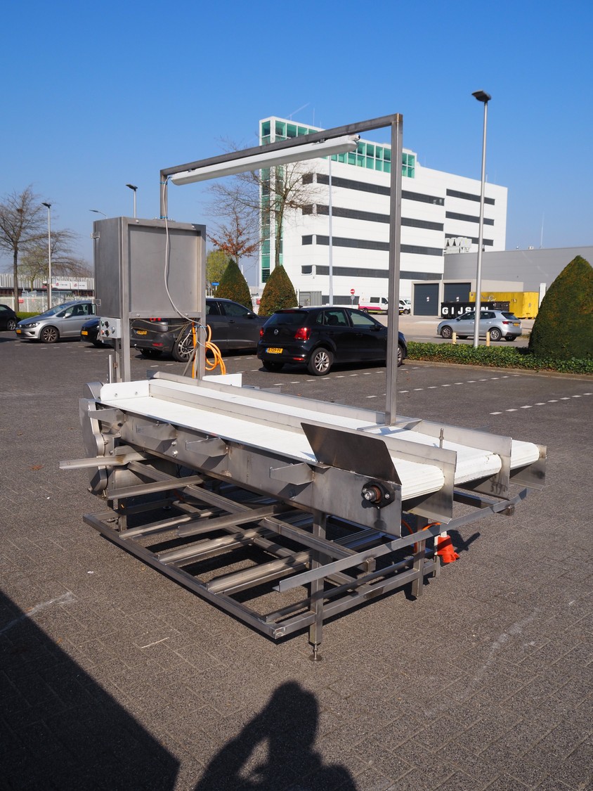 Packaging table, plastic belt, belt width: 300 mm, 2 plastic mesh belts, belt width: (2x) 380 mm, total dimensions: 2900 mm x 1700 mm x 2300 mm.