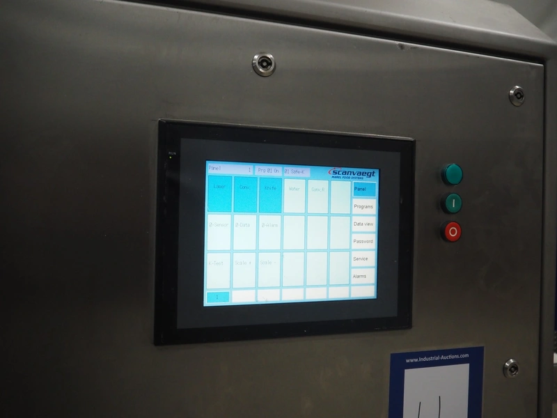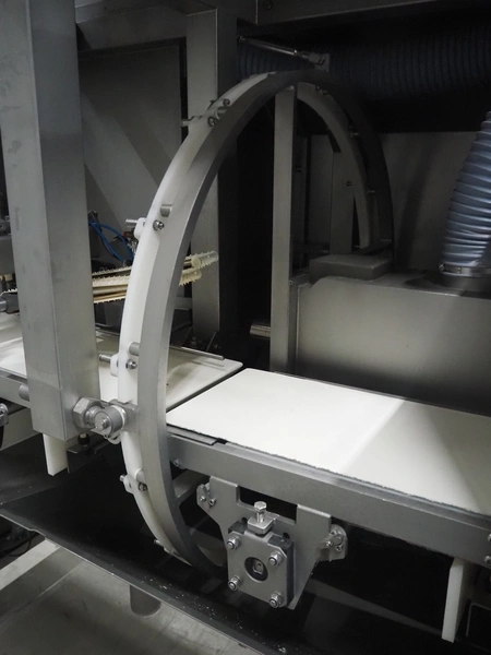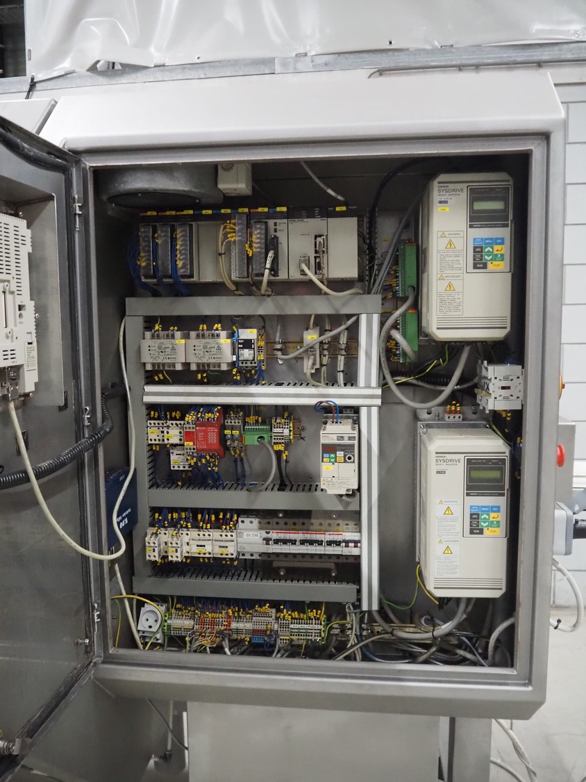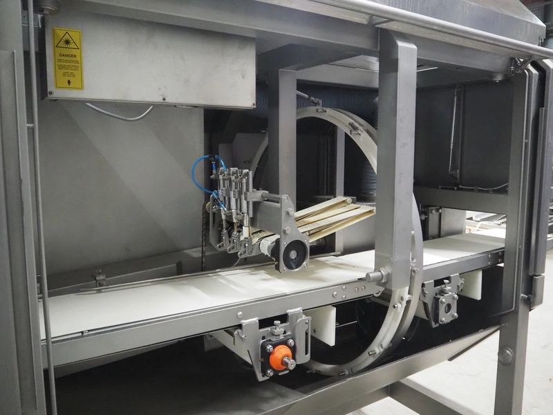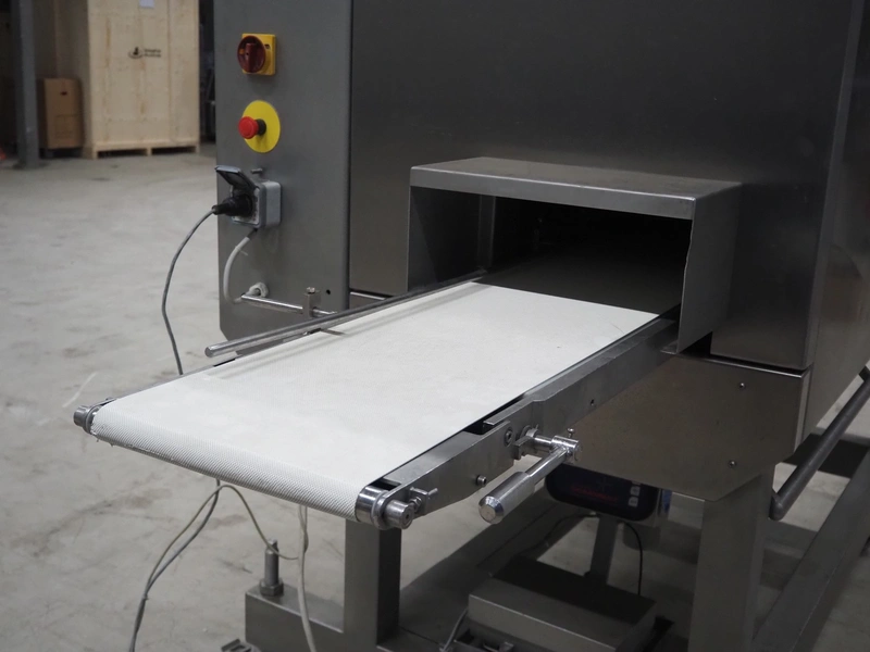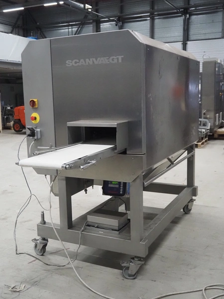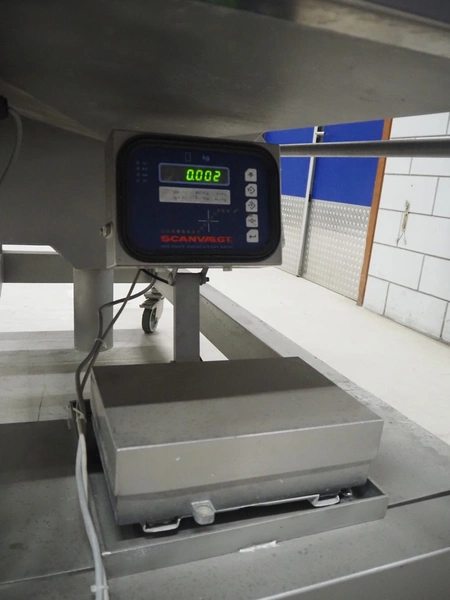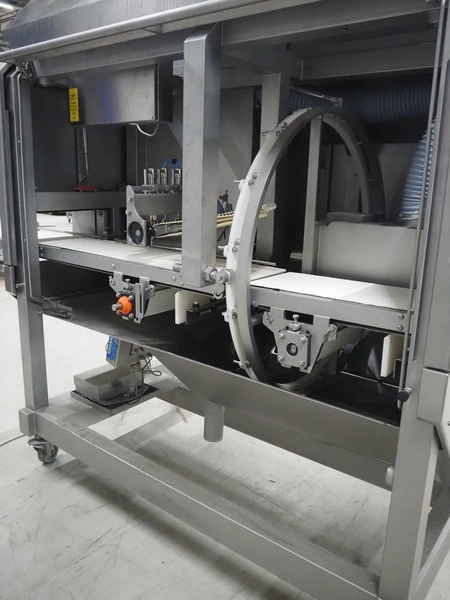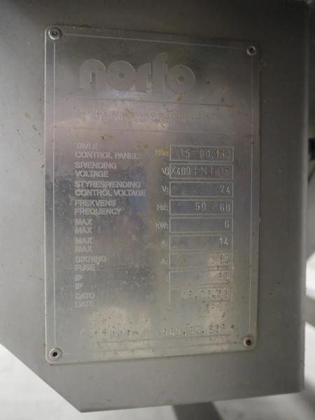 Norfo A/S mobile portion cutter, type: B 34/35, serial number: 1088.80.366, year of construction: 03.06.05, 400 V, 3 Ph, 50/60 Hz, 14/32 A, 6 kW, plastic belt, belt width: 300 mm, total dimensions: 3050 mm x 1320 mm x 1930 mm.