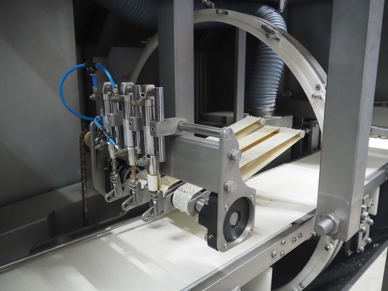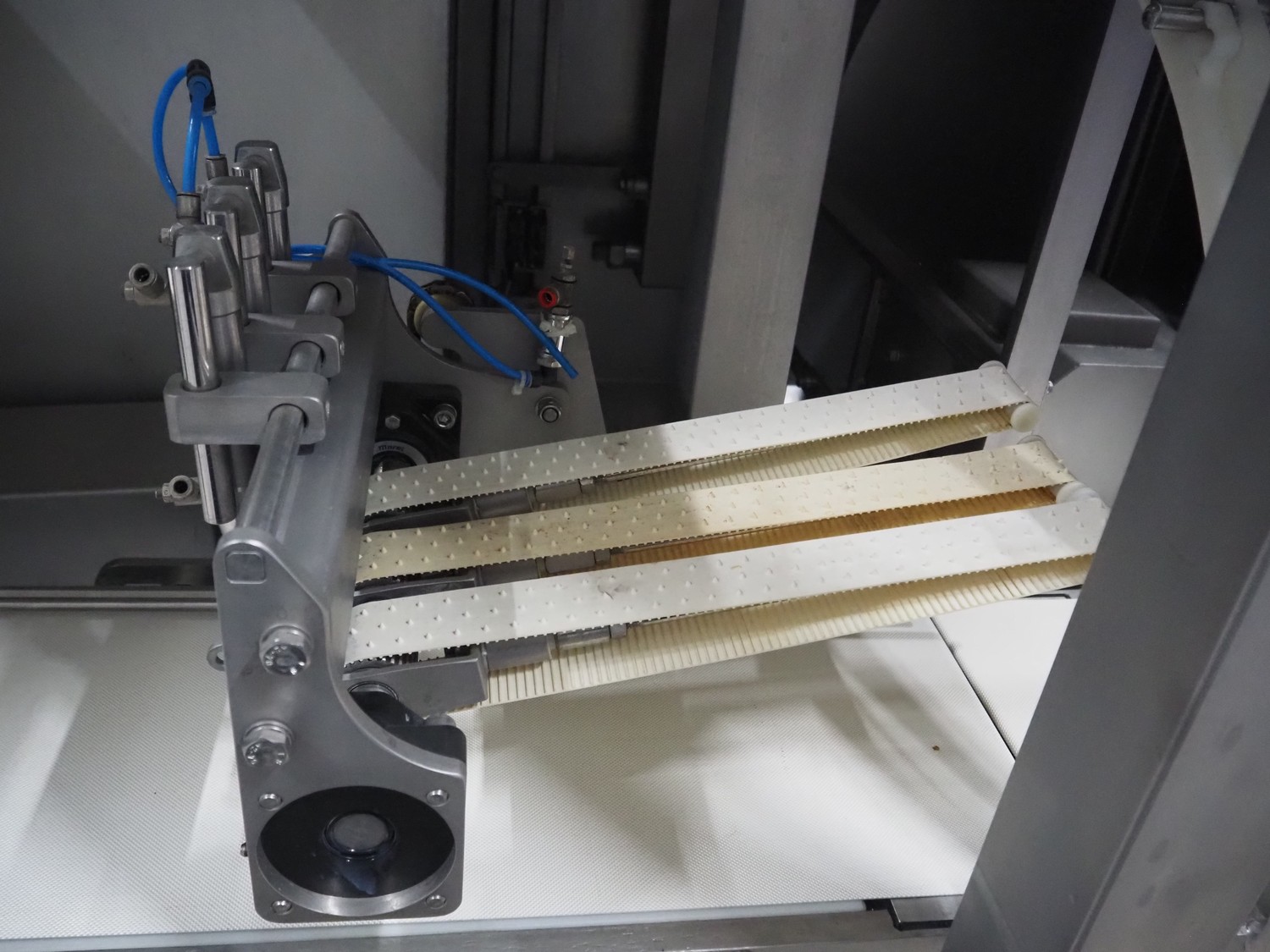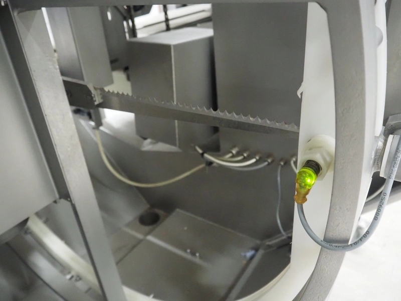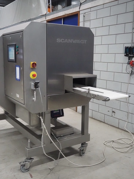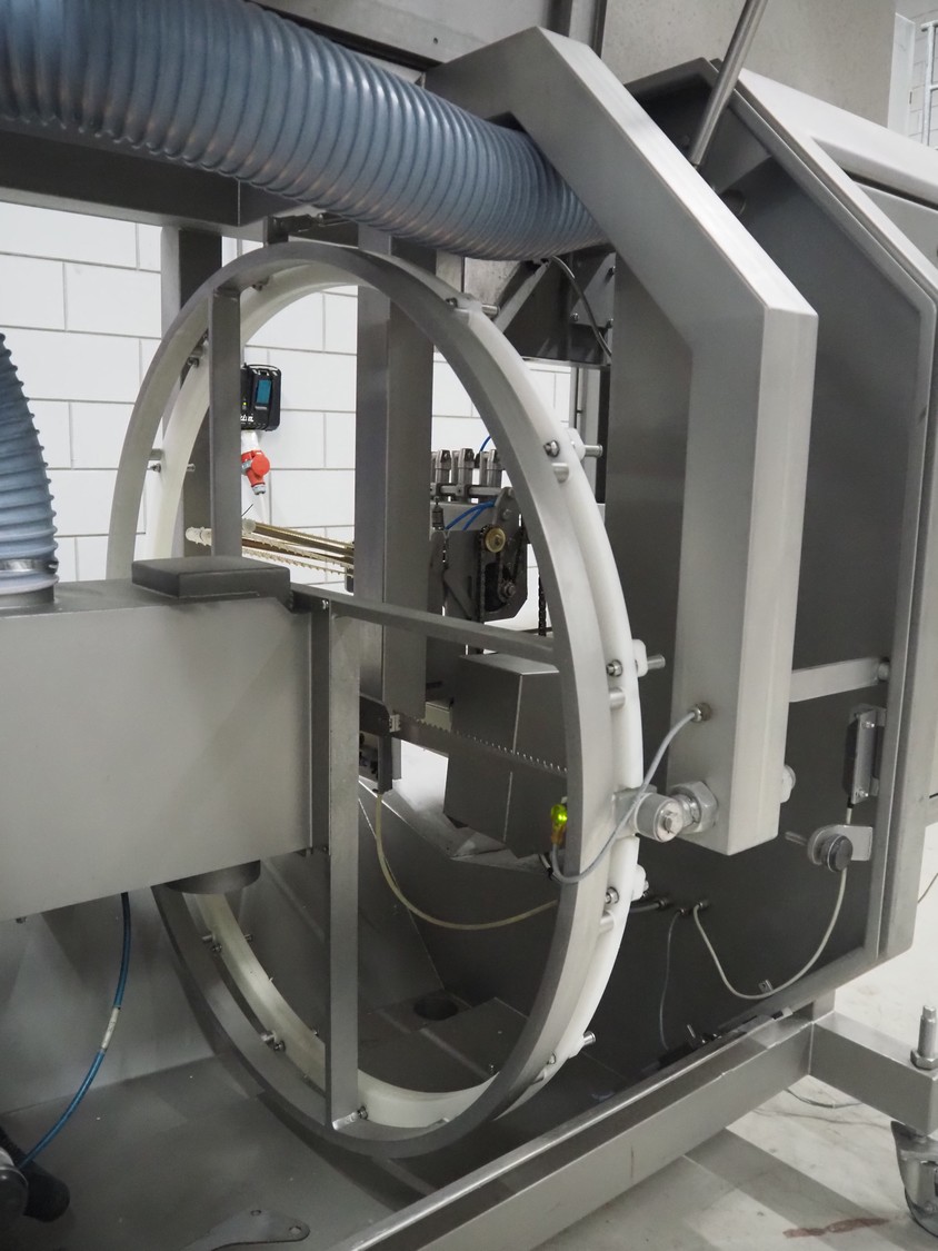 Norfo A/S mobile portion cutter, type: B 34/35, serial number: 1088.80.366, year of construction: 03.06.05, 400 V, 3 Ph, 50/60 Hz, 14/32 A, 6 kW, plastic belt, belt width: 300 mm, total dimensions: 3050 mm x 1320 mm x 1930 mm.