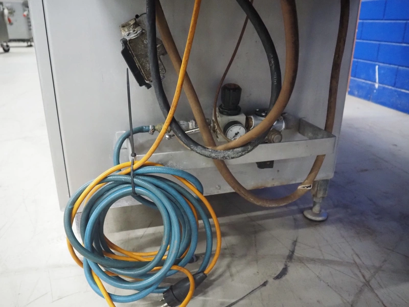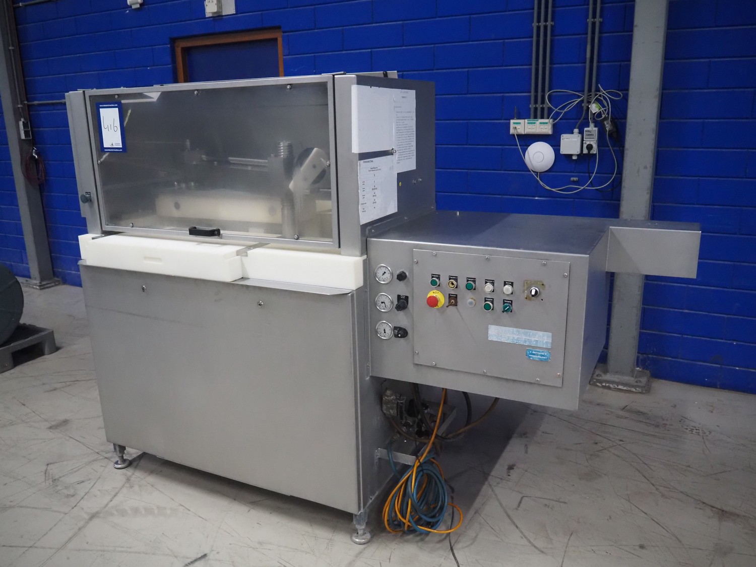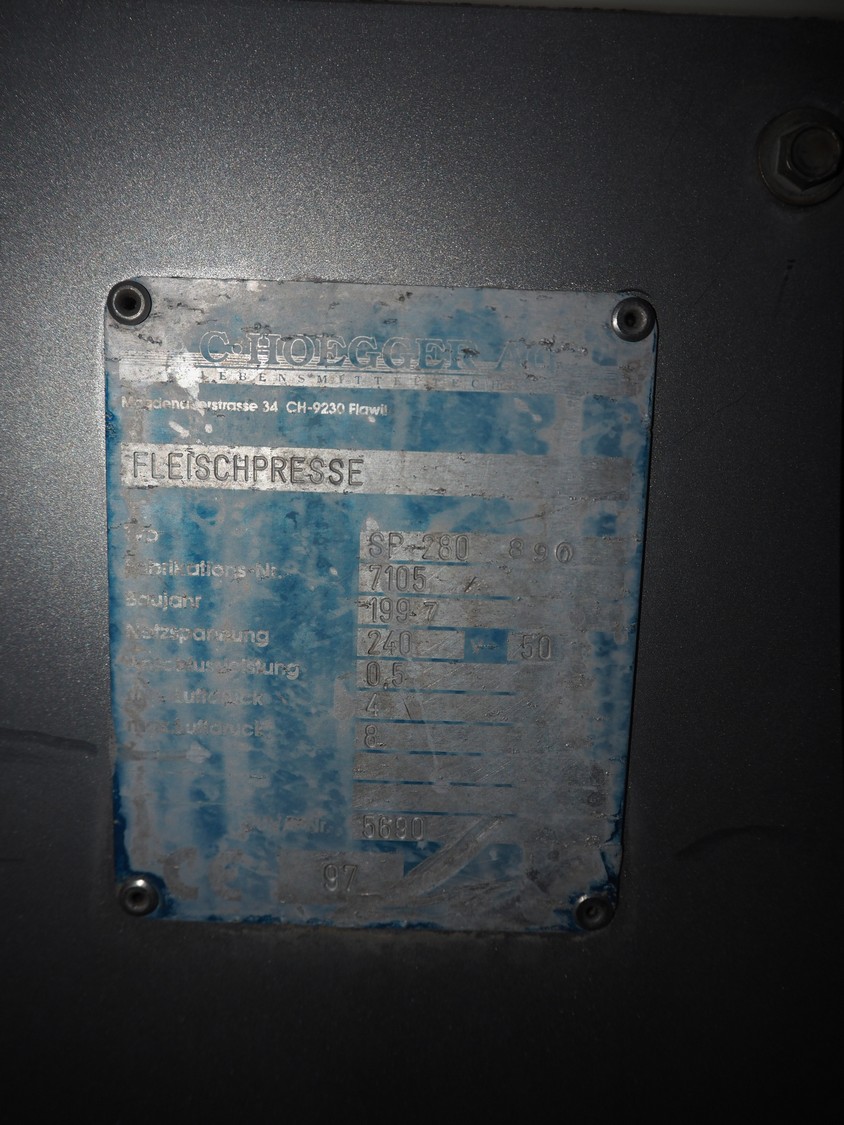 Hoegger AG meat press, type: SP-280 890, machine number: 7105, year of construction: 1997, 240 V, 50 Hz, 0.5 kW, dimensions: 2500 mm x 830 mm x 1700 mm.