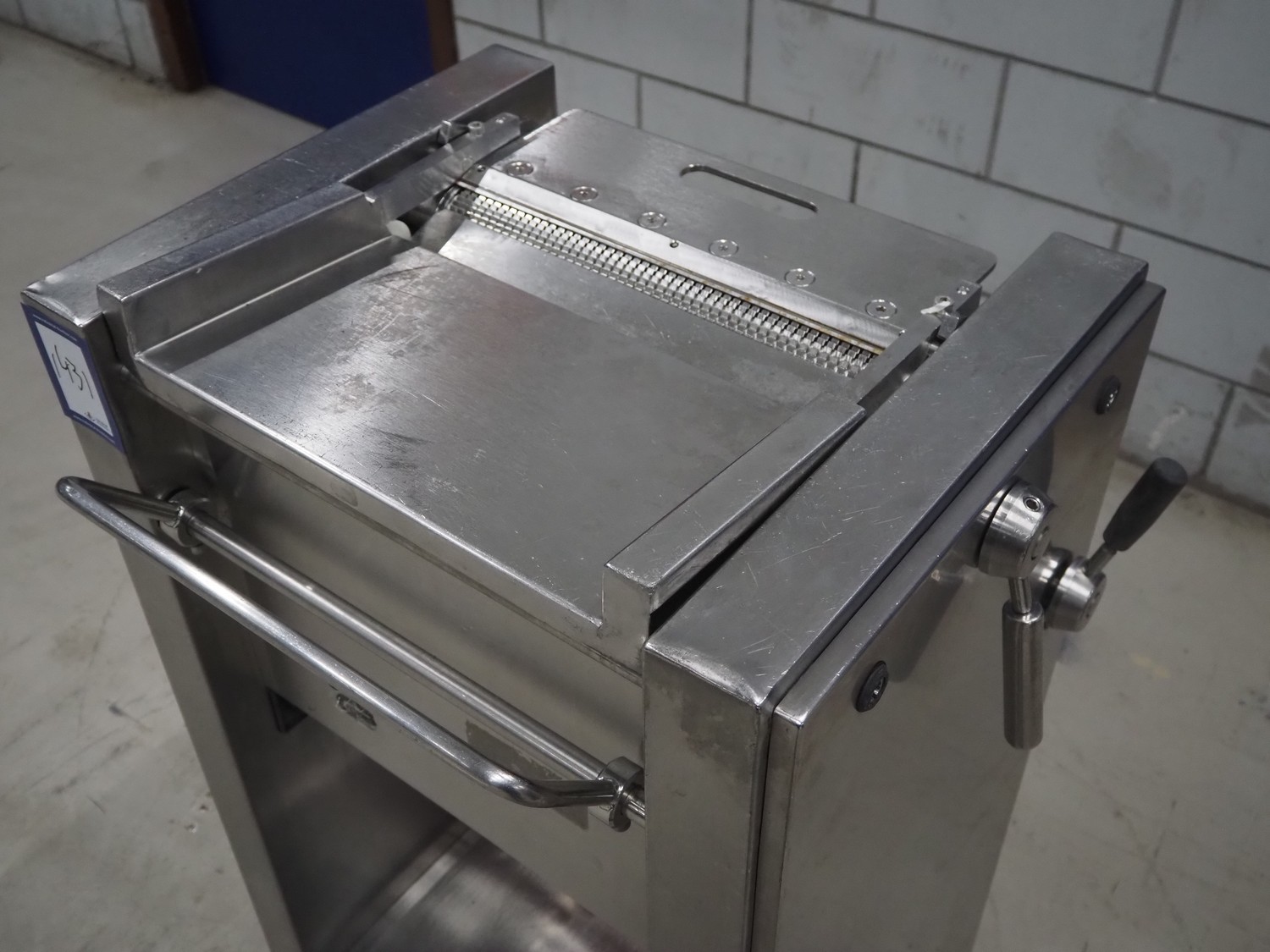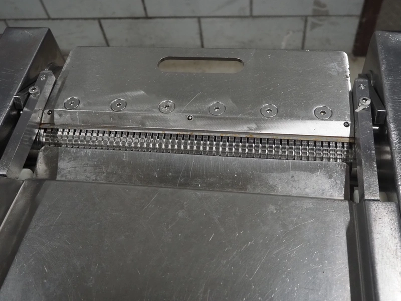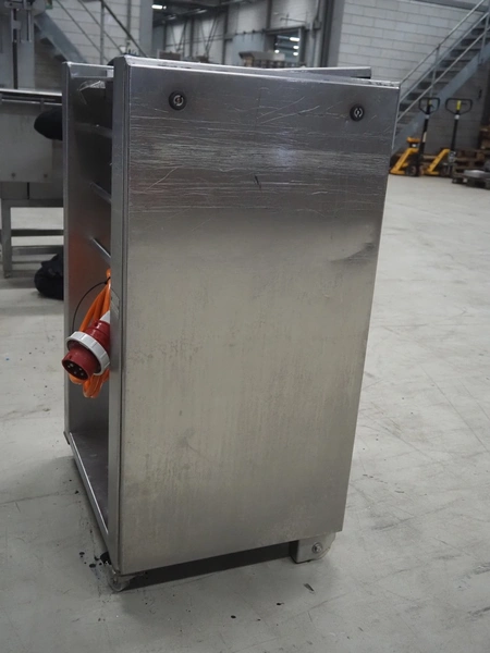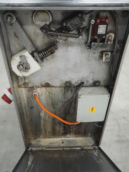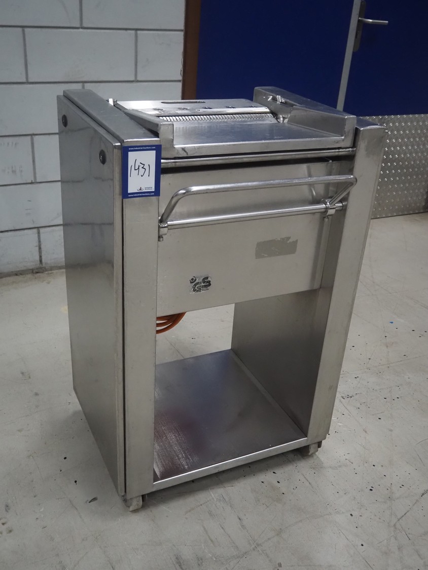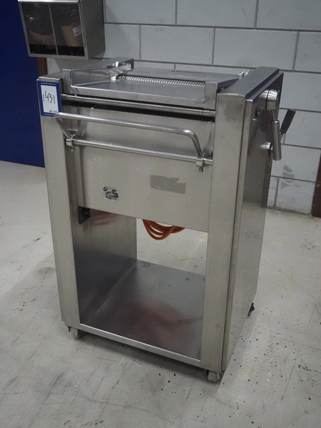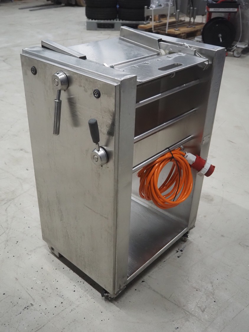 Weber mobile skinning machine, type: AS 450, number: 3247, 380 V, 50 Hz, 0.4 kW, working width: 380 mm, total dimensions: 670 mm x 550 mm x 1000 mm.