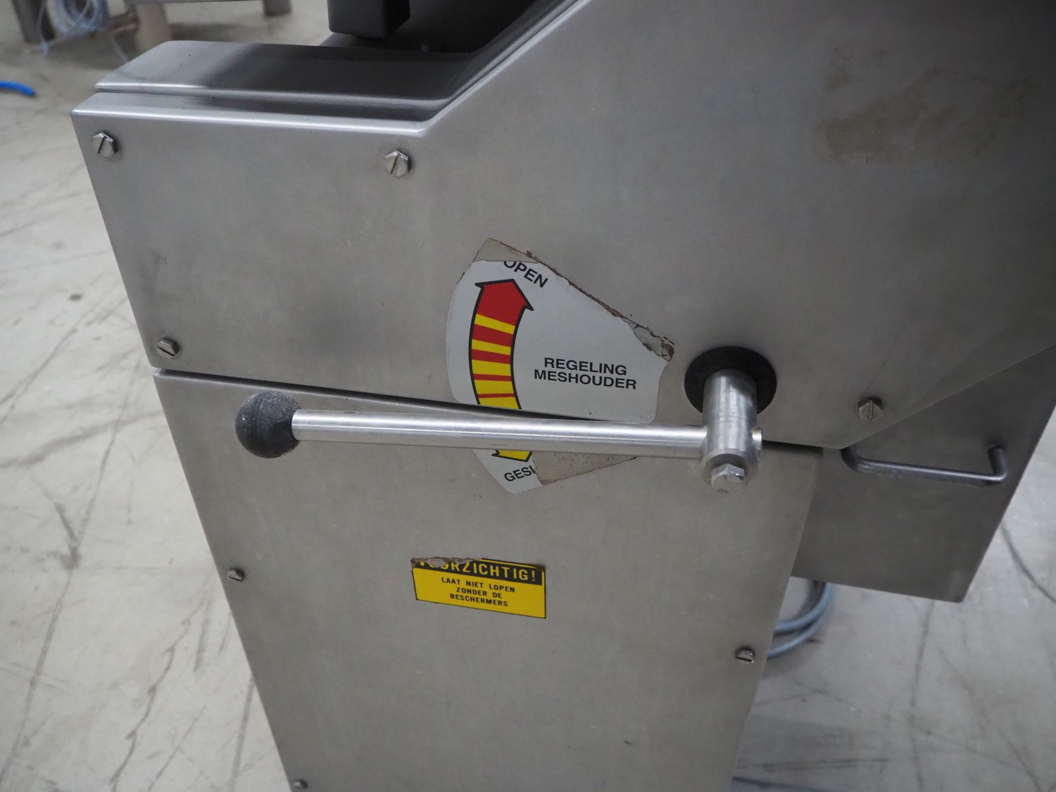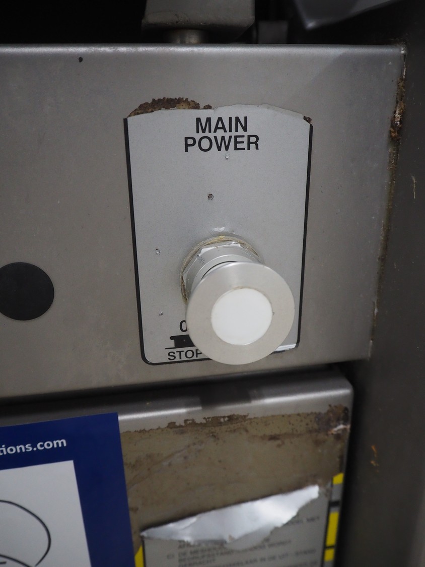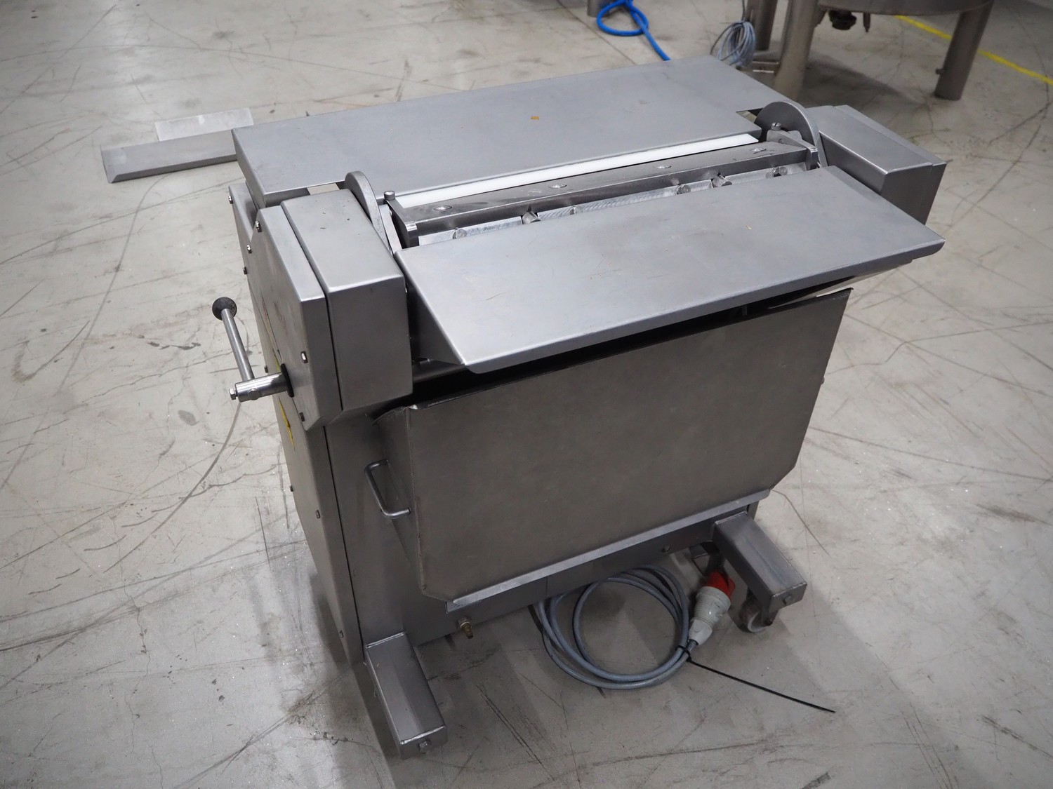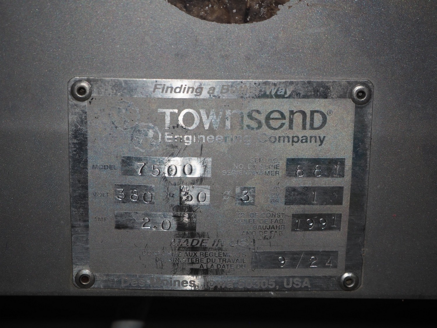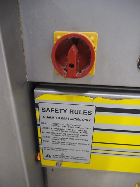 Townsend mobile skinning machine, model: 7500, serial number: 881, year of construction: 1991, 380 V, 3 Ph, 50 Hz, 2.0 A, working width: 510 mm, total dimensions: 820 mm x 660 mm x 1000 mm.
