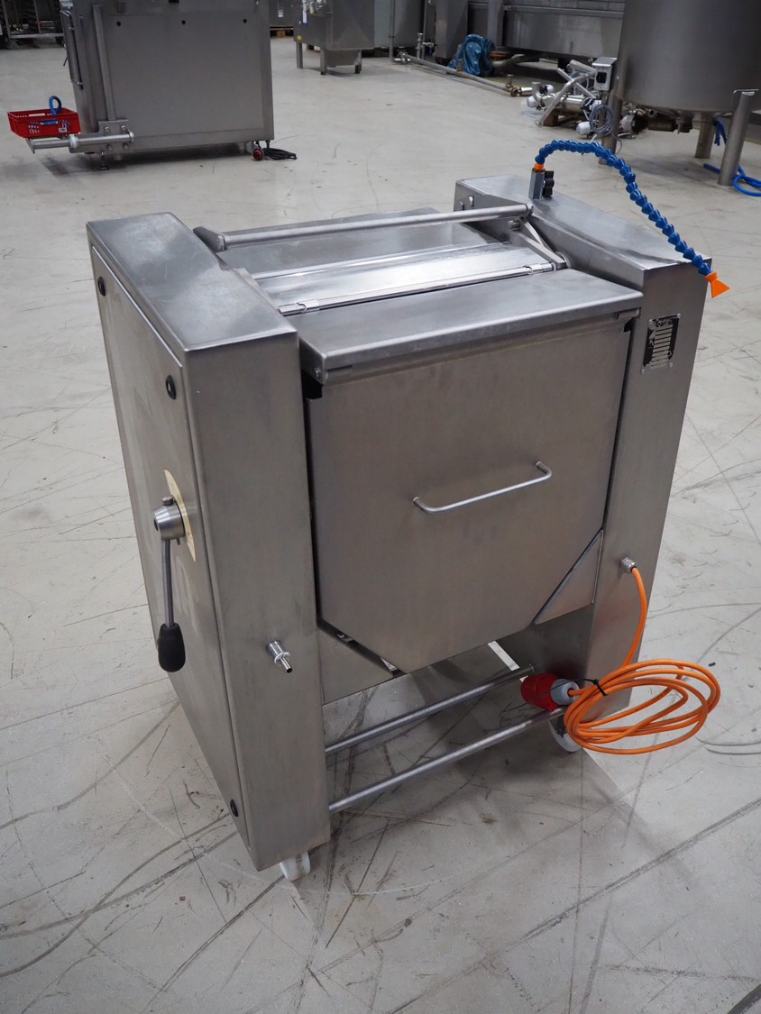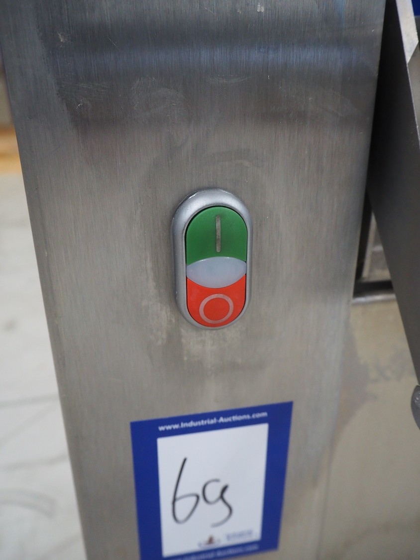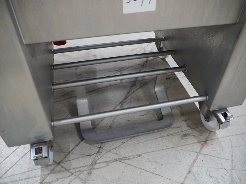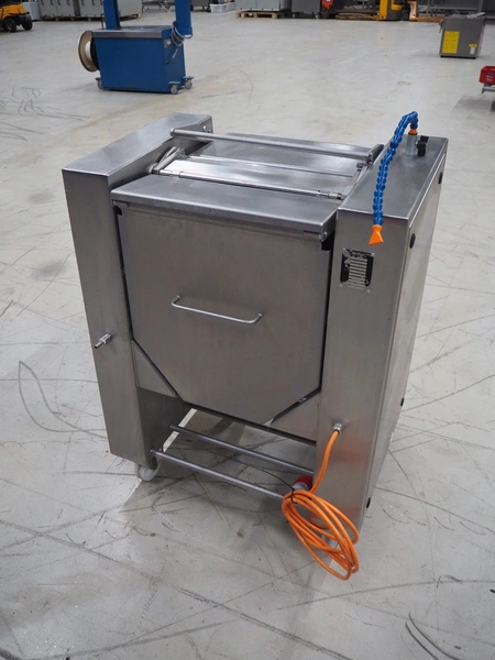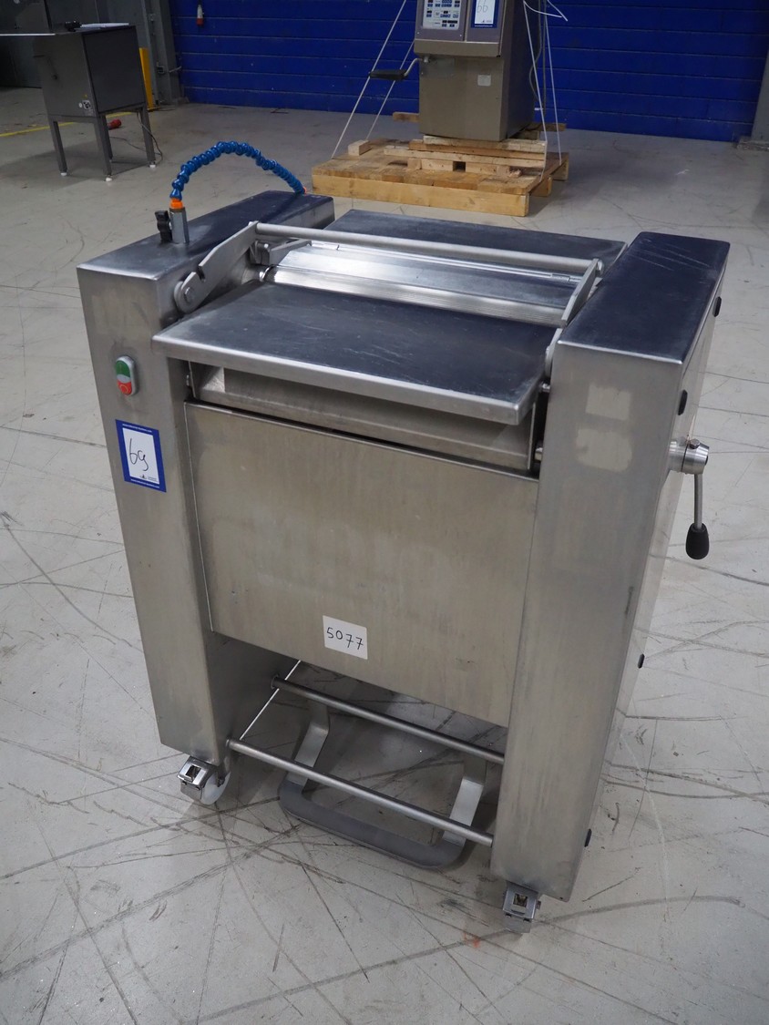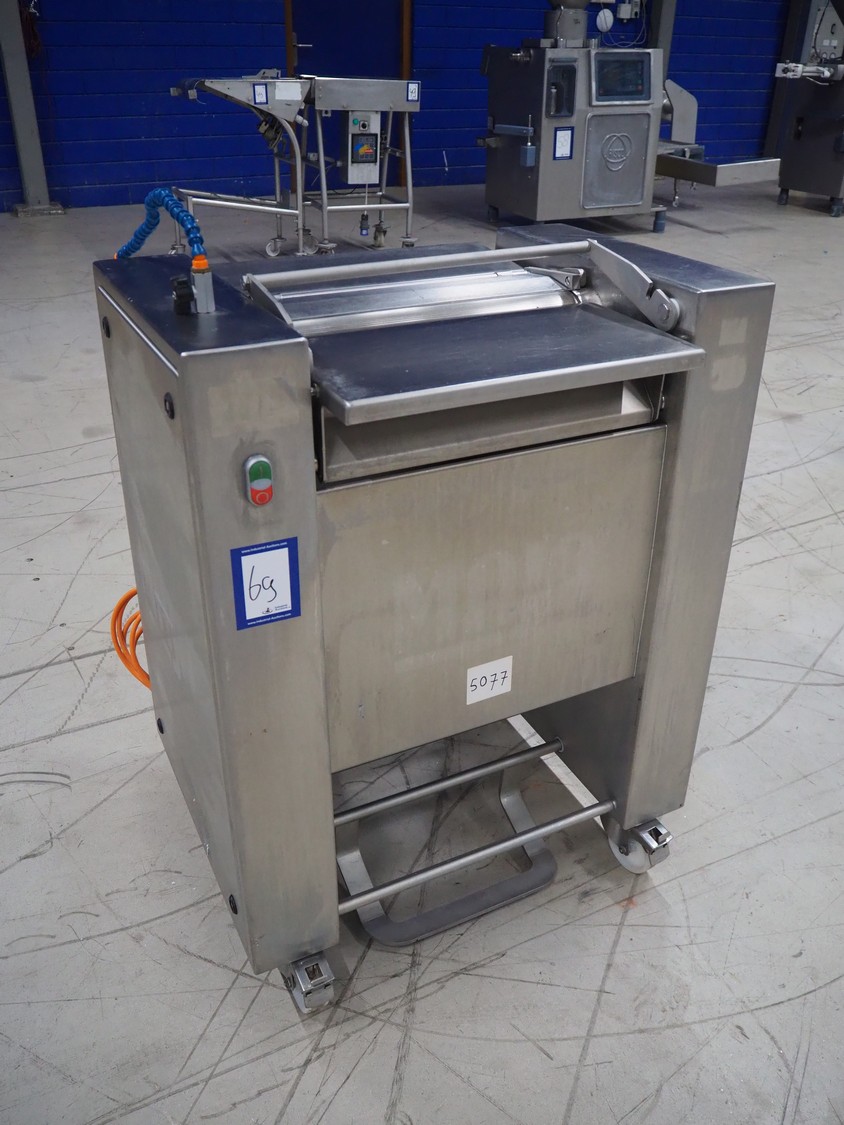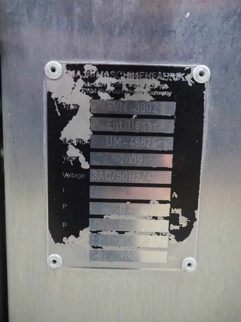 Maja Maschinenfabrik mobile skinning machine, model: EVM 3002, serial number: UM-48626, year of construction: 2009, 400 V, 3 Ph, 50 Hz, 2.15 A, 0.75 kW, weight: 160 kg, working width: 420 mm, total dimensions: 770 mm x 560 mm x 1050 mm.
