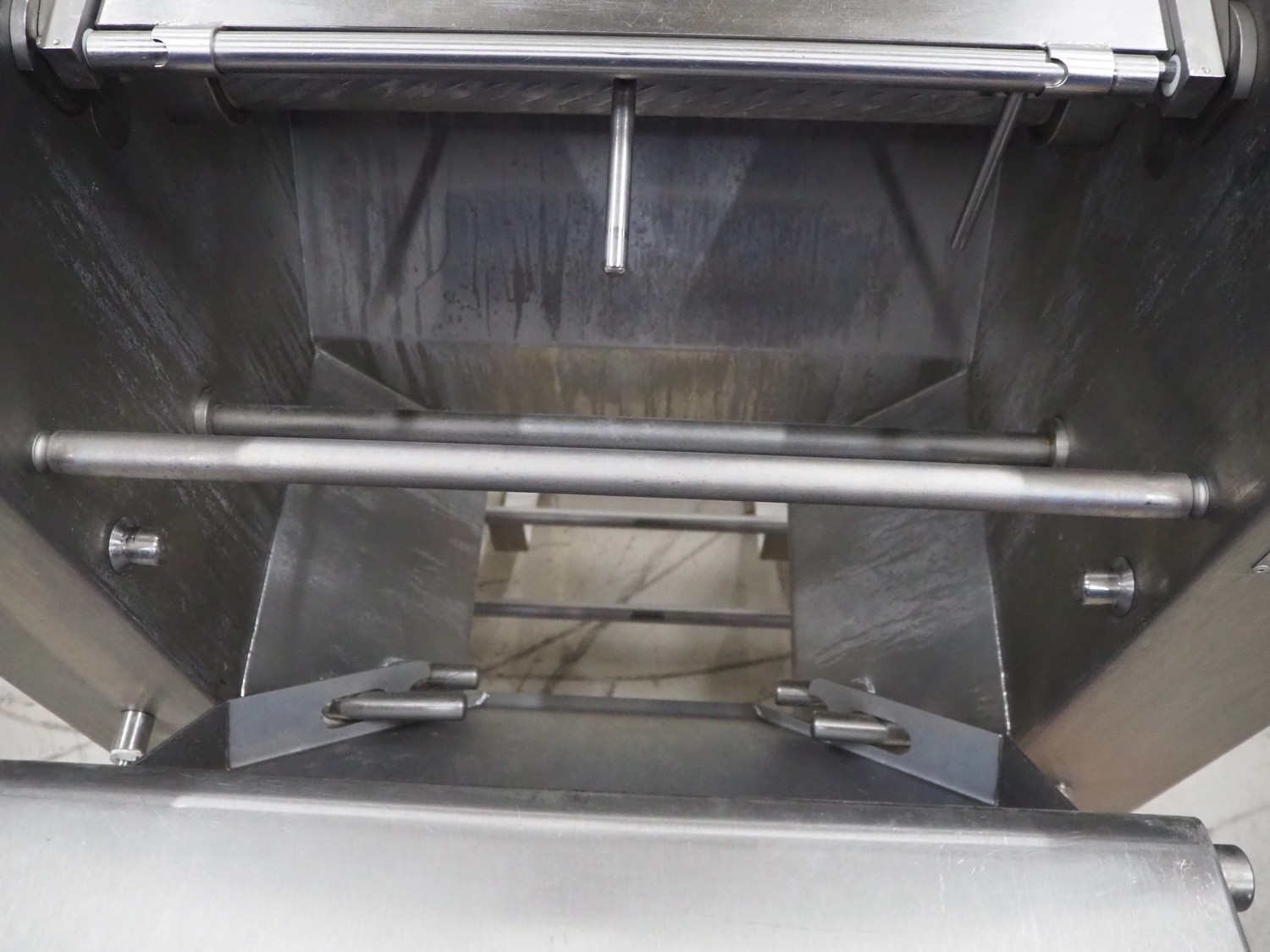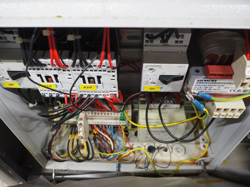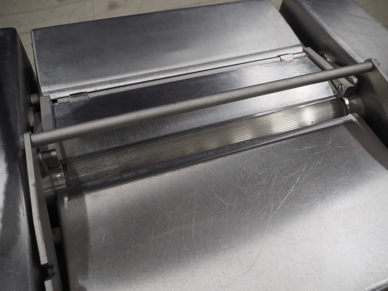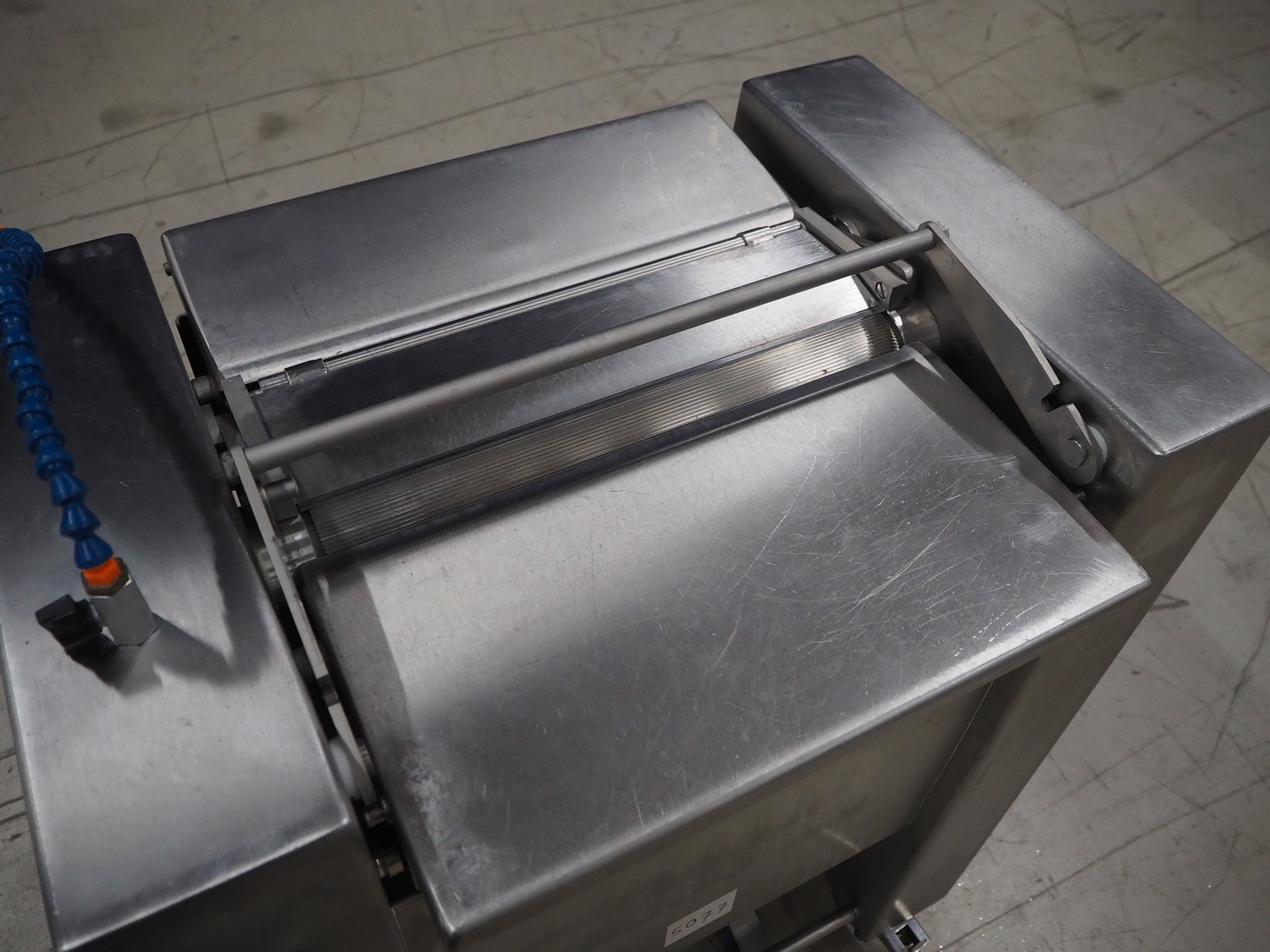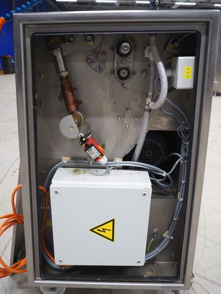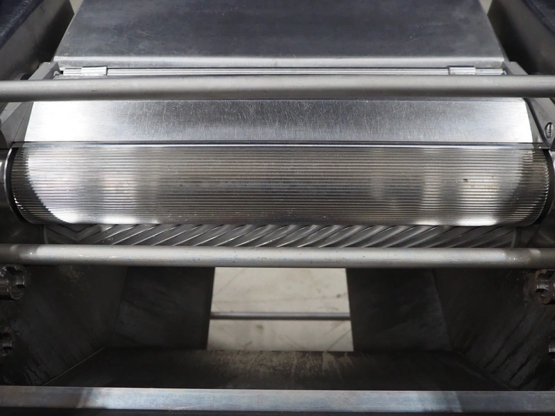 Maja Maschinenfabrik mobile skinning machine, model: EVM 3002, serial number: UM-48626, year of construction: 2009, 400 V, 3 Ph, 50 Hz, 2.15 A, 0.75 kW, weight: 160 kg, working width: 420 mm, total dimensions: 770 mm x 560 mm x 1050 mm.