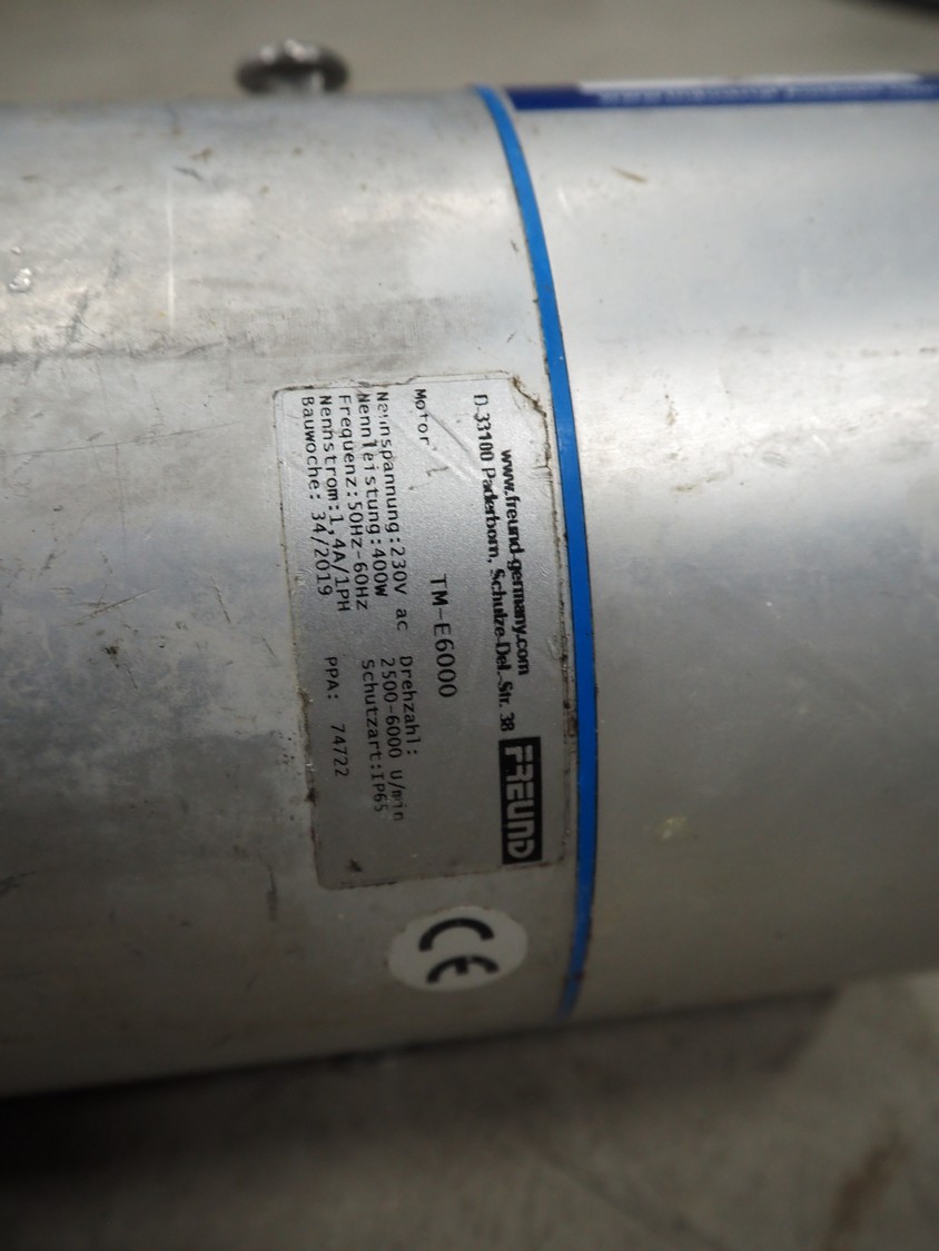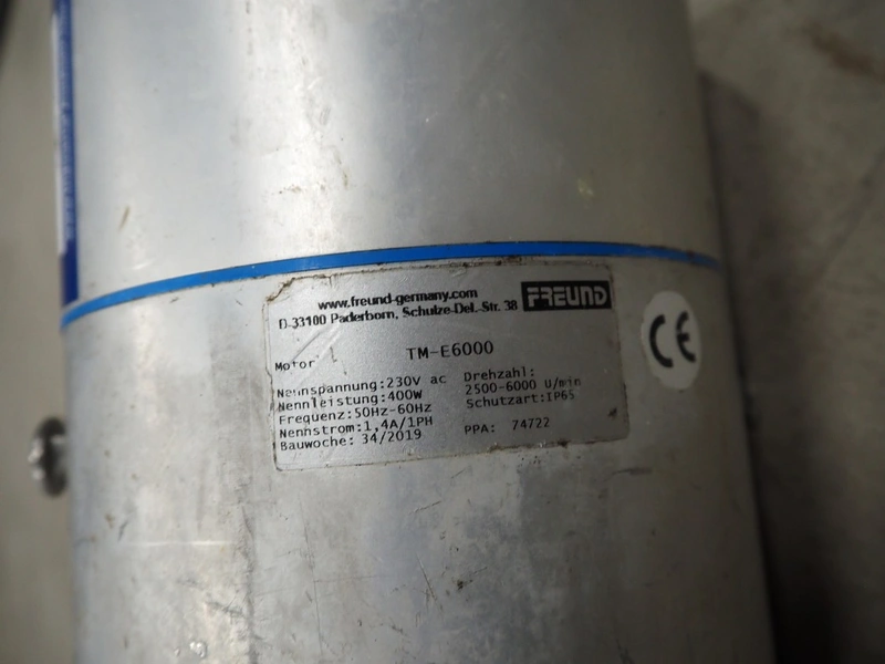 Freund trimmer, model: TM-E6000, year of construction: 2019, 230 V, 1 Ph, 50/60 Hz, 1.4 A, 400 W, 2500/6000 rpm, dimensions trimmer: 400 mm x 200 mm x 250 mm, dimensions motor: 300 mm x 150 mm x 150 mm.