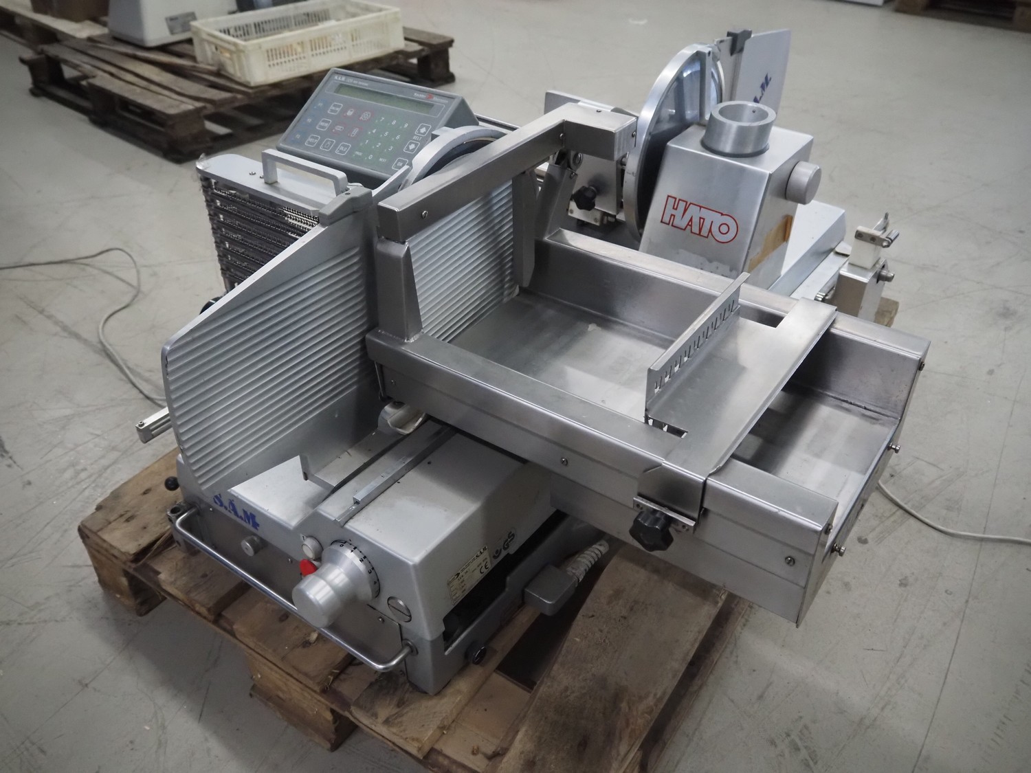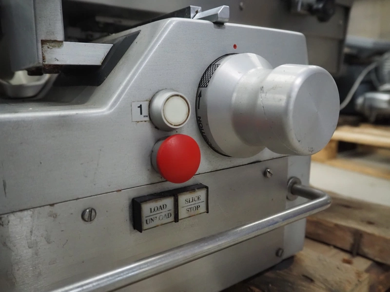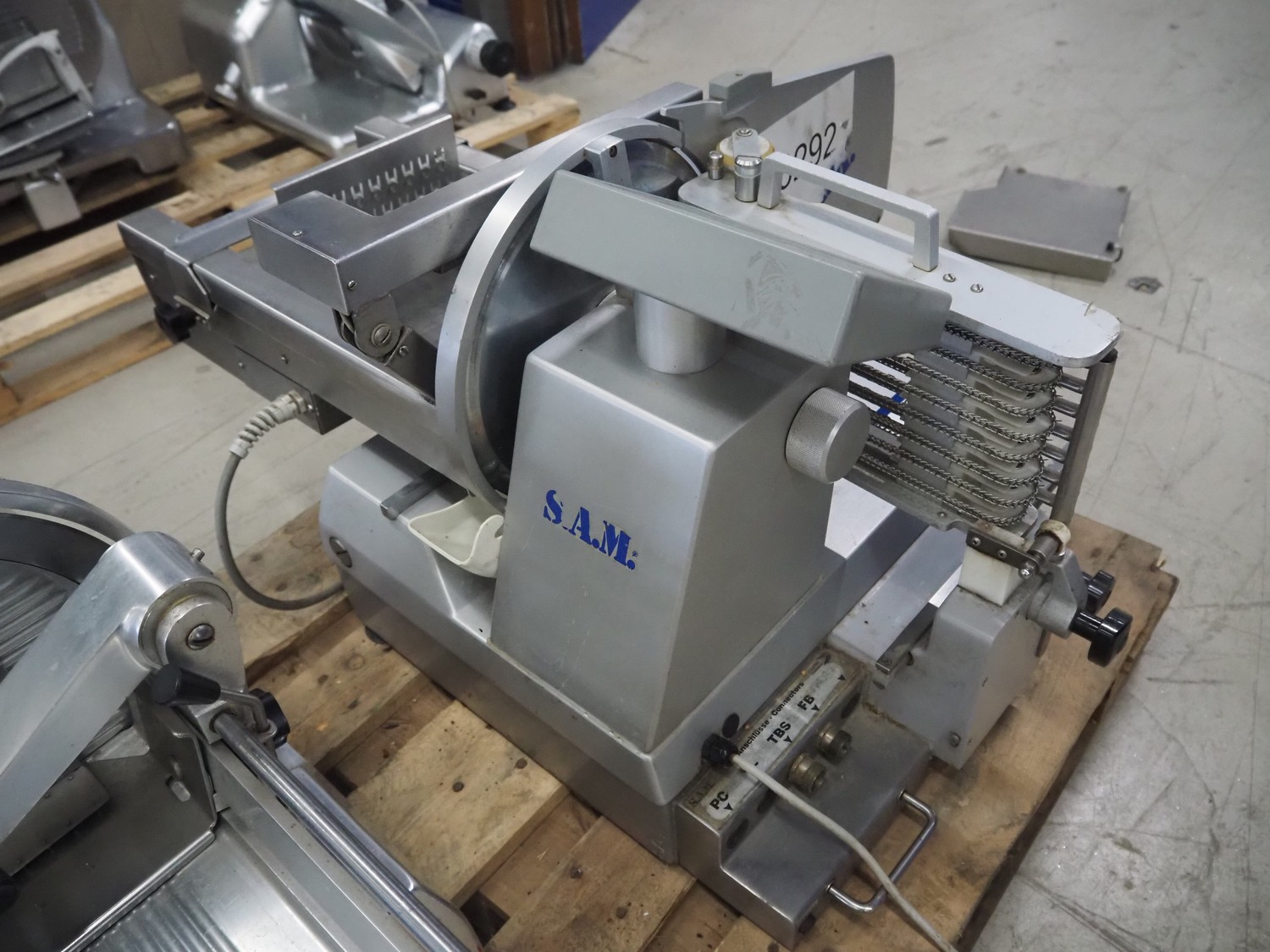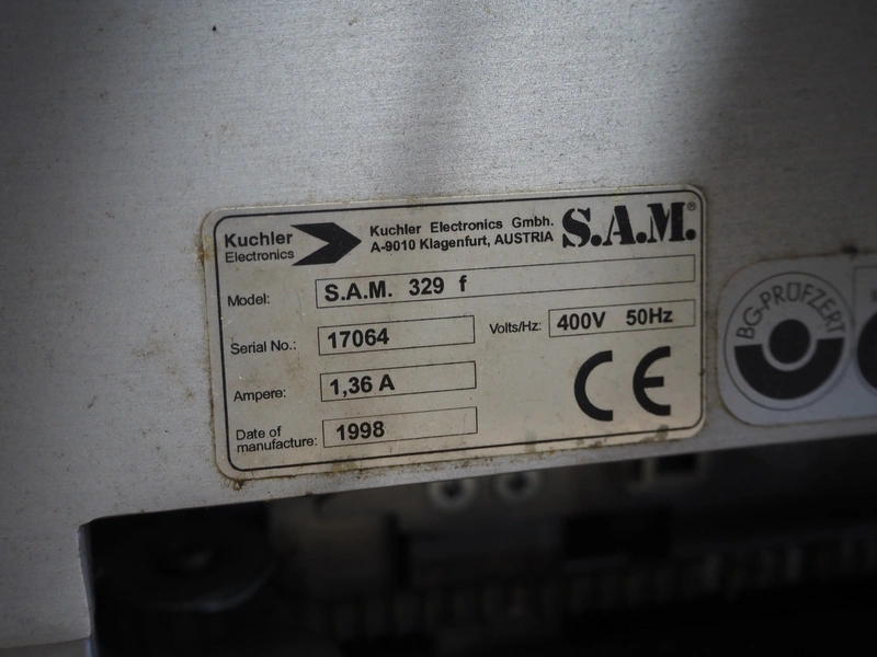 S.A.M. automatic slicer, model: S.A.M. 329 f, serial number: 17064, year of construction: 1998, 400 V, 50 Hz, 1.36 A, dimensions: 950 mm x 620 mm x 550 mm.