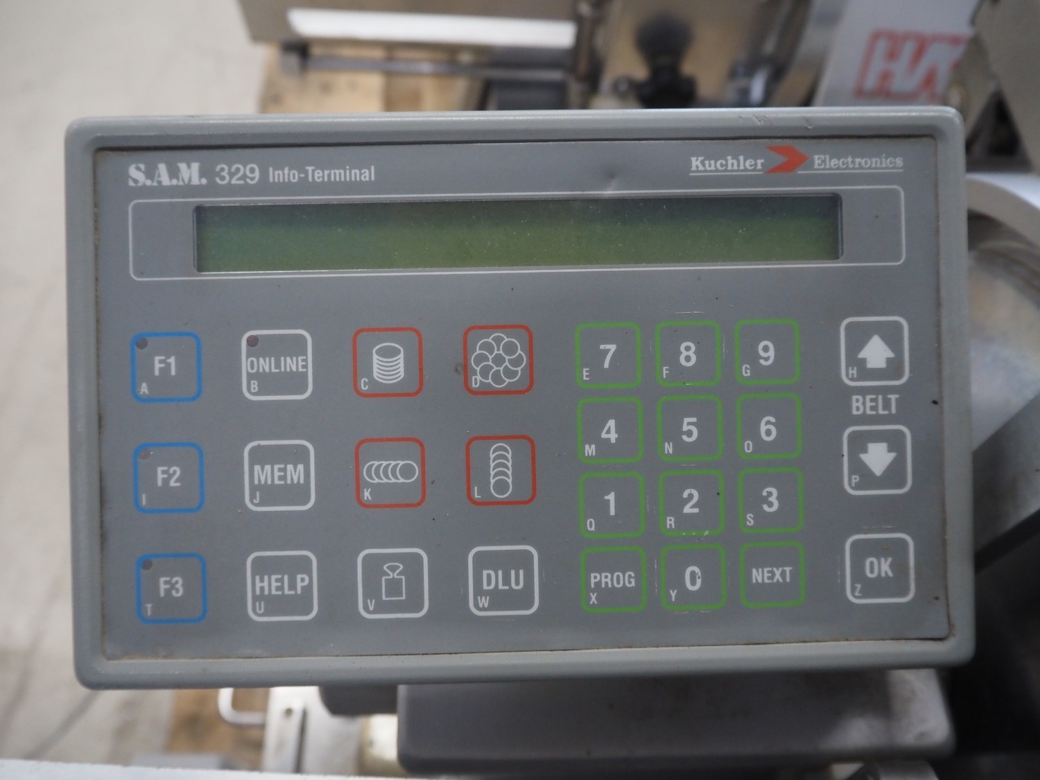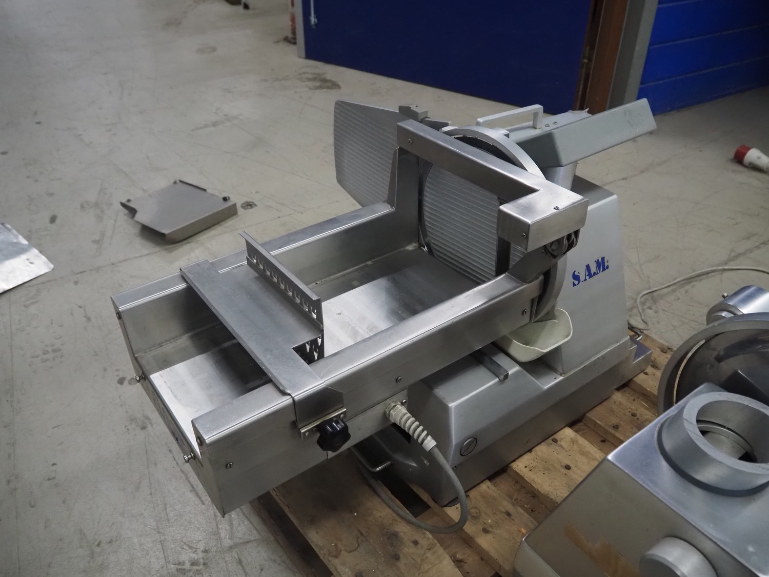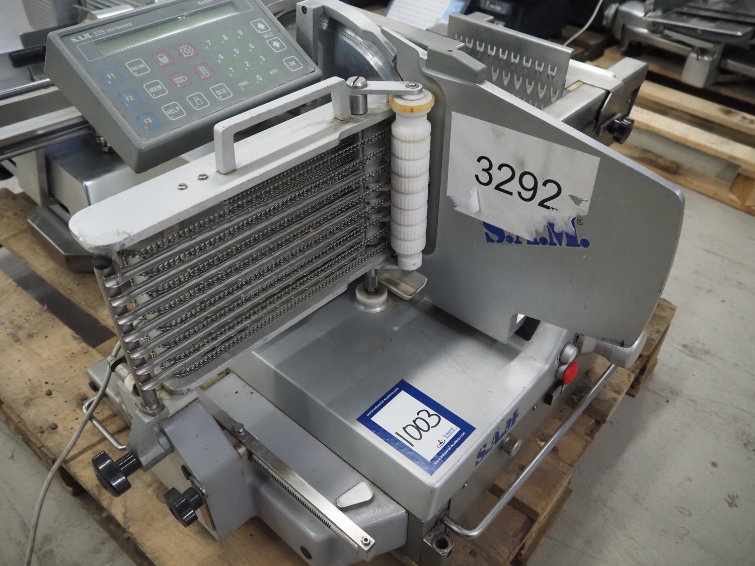 S.A.M. automatic slicer, model: S.A.M. 329 f, serial number: 17064, year of construction: 1998, 400 V, 50 Hz, 1.36 A, dimensions: 950 mm x 620 mm x 550 mm.
