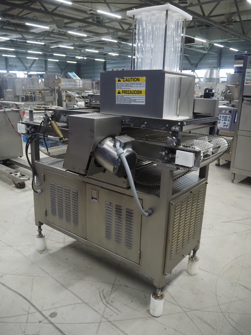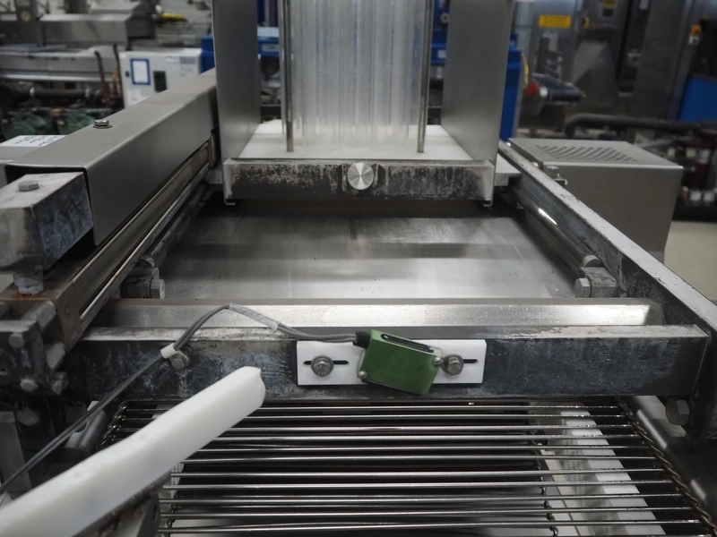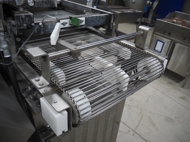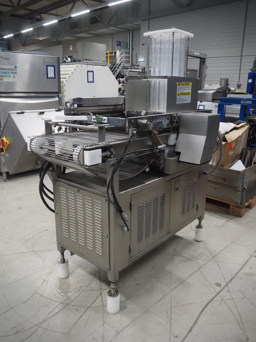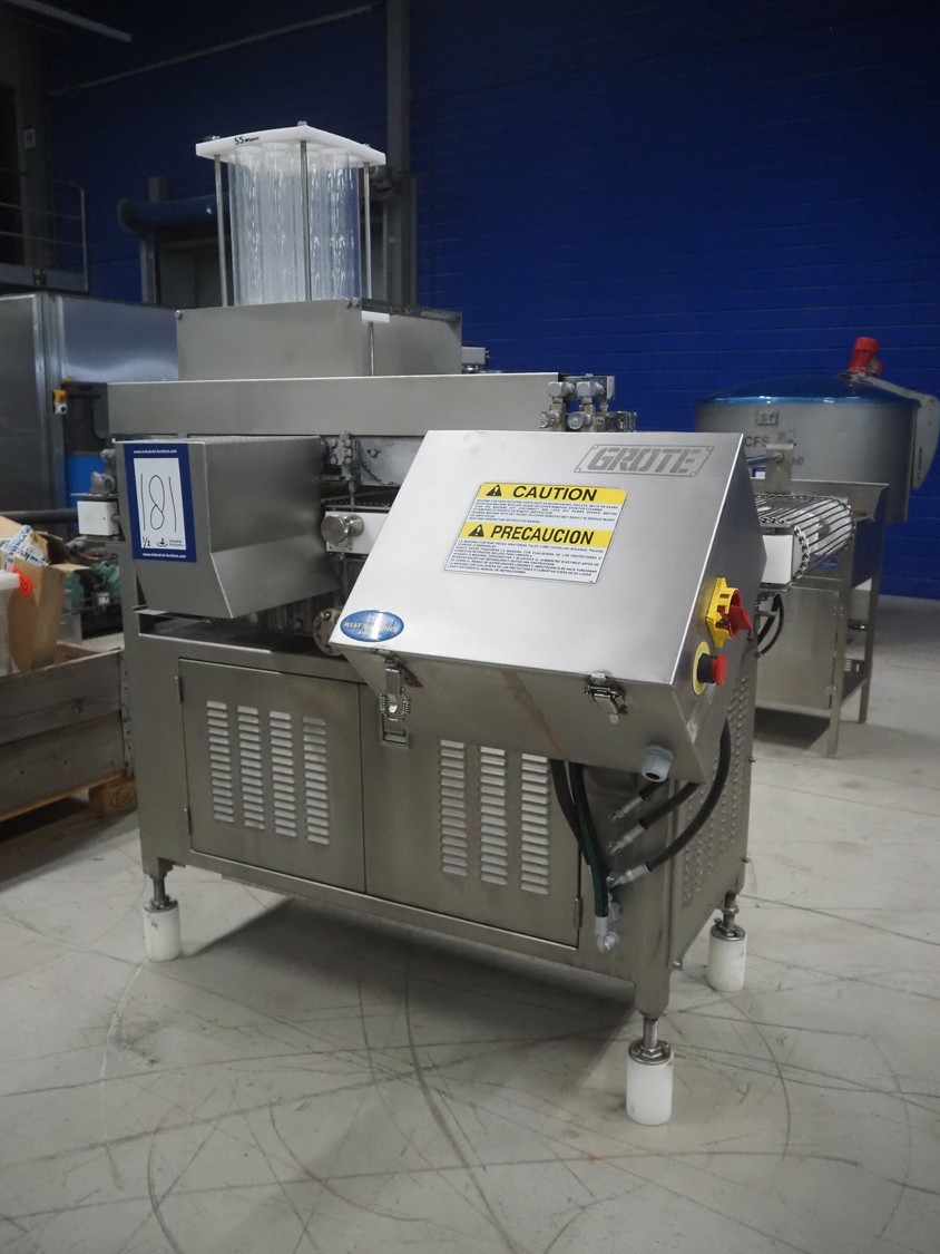 Grote pepperoni slicer, model: FG101-2001, serial number: 1087319, s/s mesh belt, belt width: 460 mm, knife width: 470 mm, diameter pipes: (10x) 50 mm, total dimensions: 1570 mm x 1230 mm x 1840 mm. Including pallet with parts.