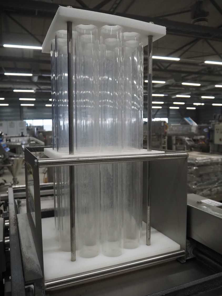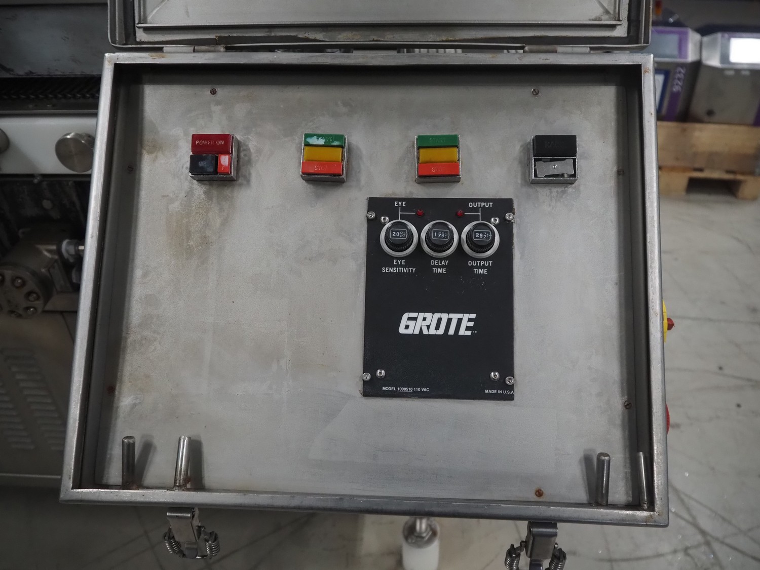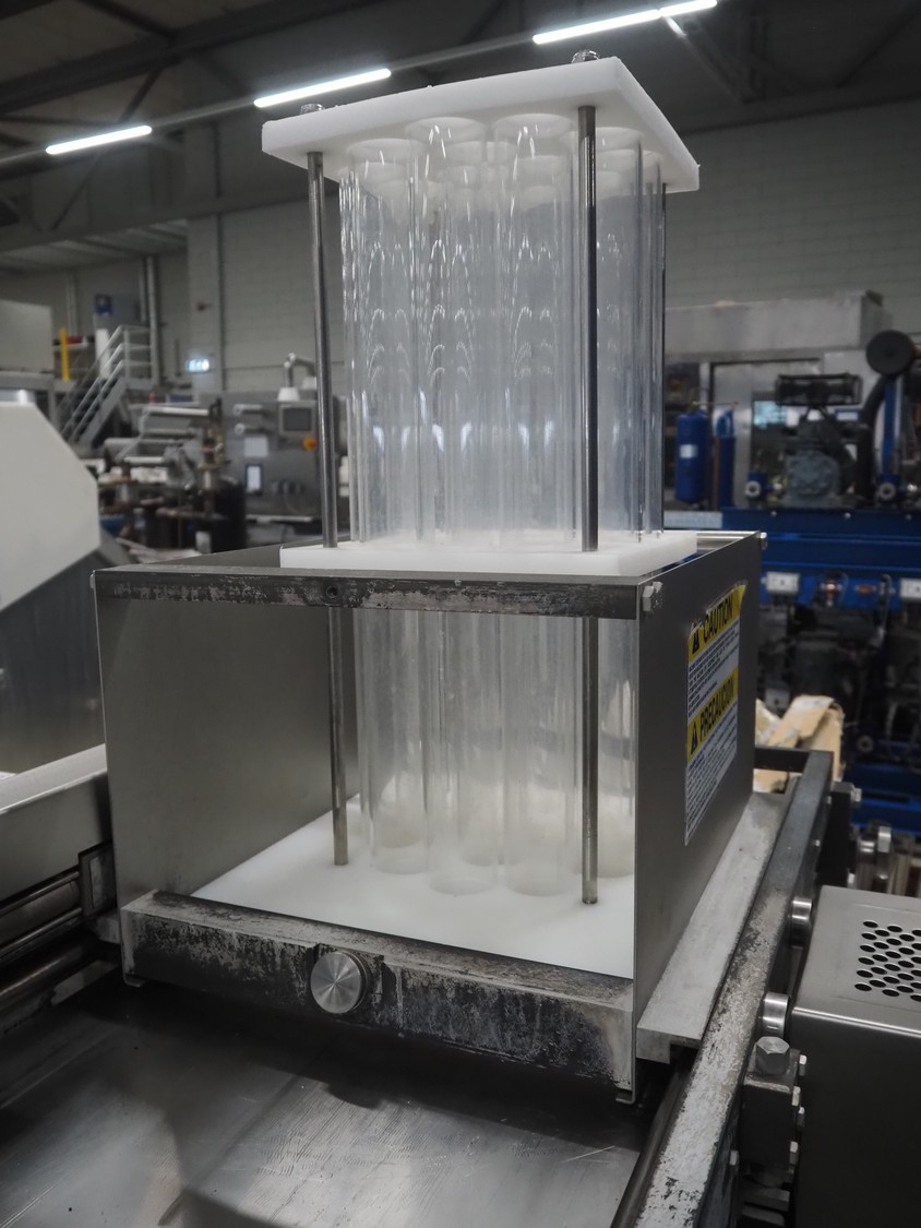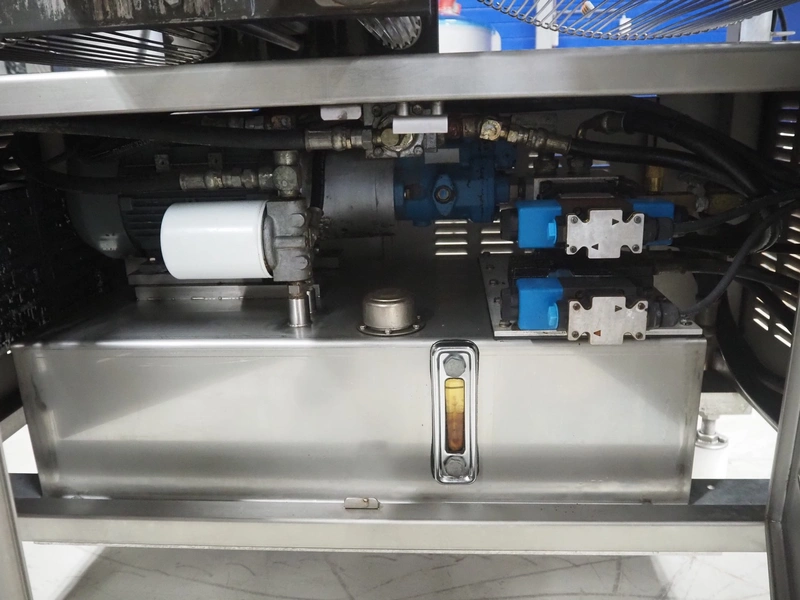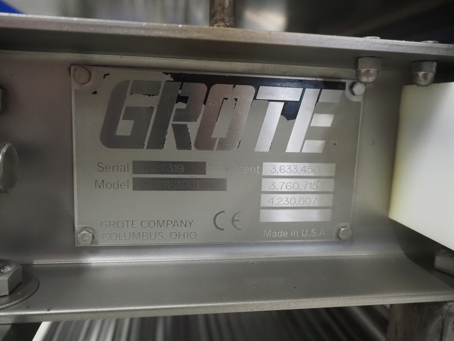 Grote pepperoni slicer, model: FG101-2001, serial number: 1087319, s/s mesh belt, belt width: 460 mm, knife width: 470 mm, diameter pipes: (10x) 50 mm, total dimensions: 1570 mm x 1230 mm x 1840 mm. Including pallet with parts.