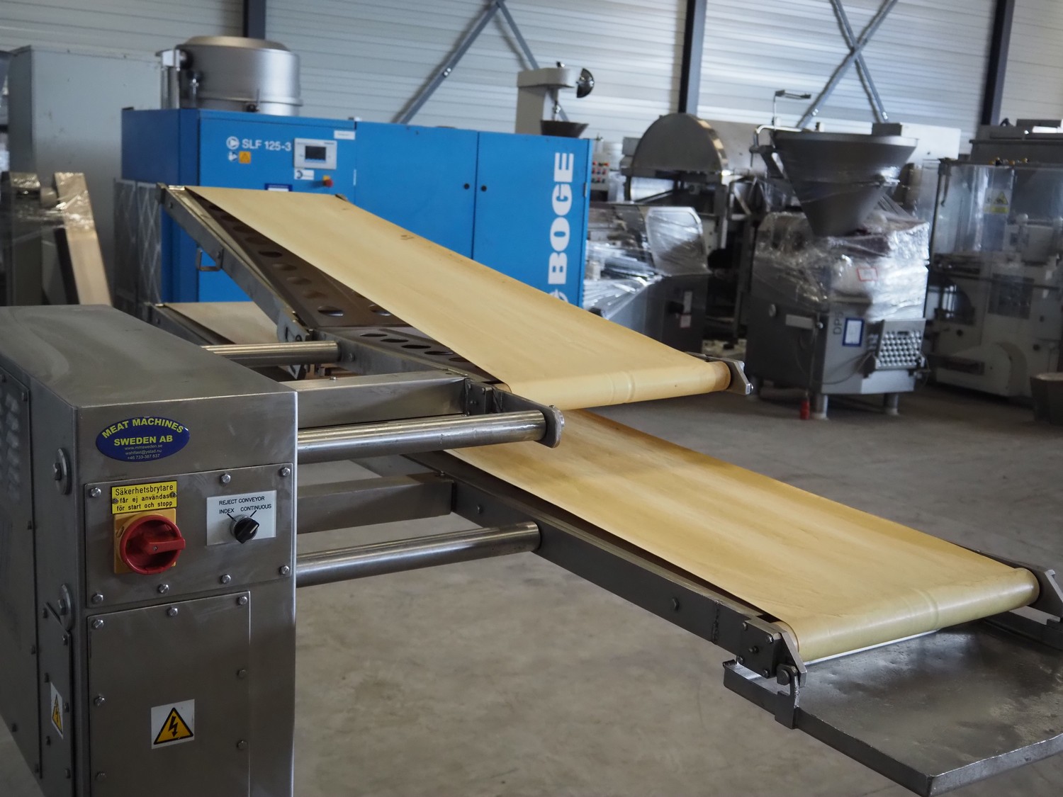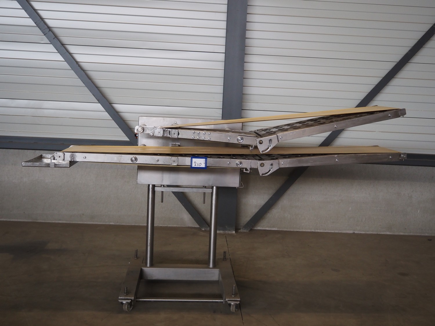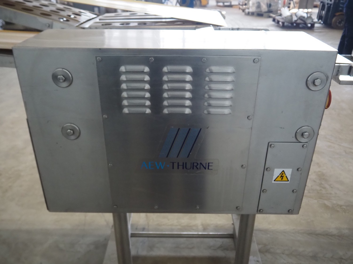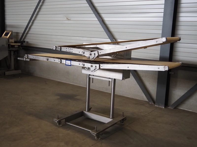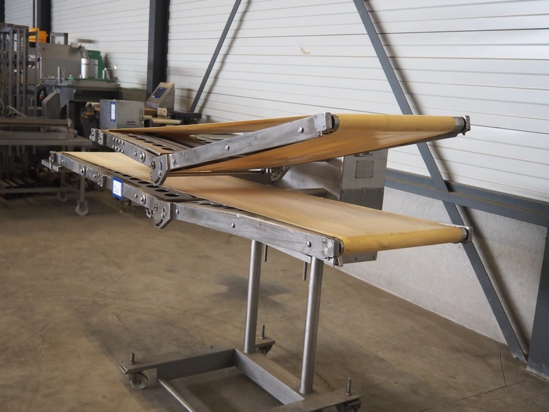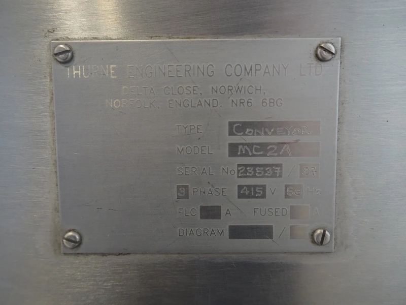Thurne Engineering Company ltd outfeed belt for slicer, type: Conveyor, model: MC2A, serial number: 23537/97, 415 V, 3 Ph, 50 Hz, belt width: 375 mm, 400 mm, total dimensions: 2300 mm x 1100 mm x 1320 mm.