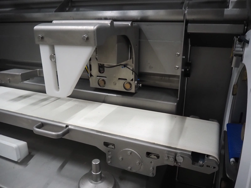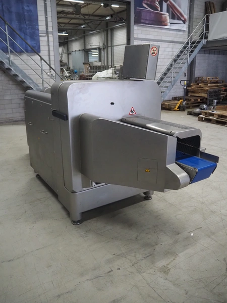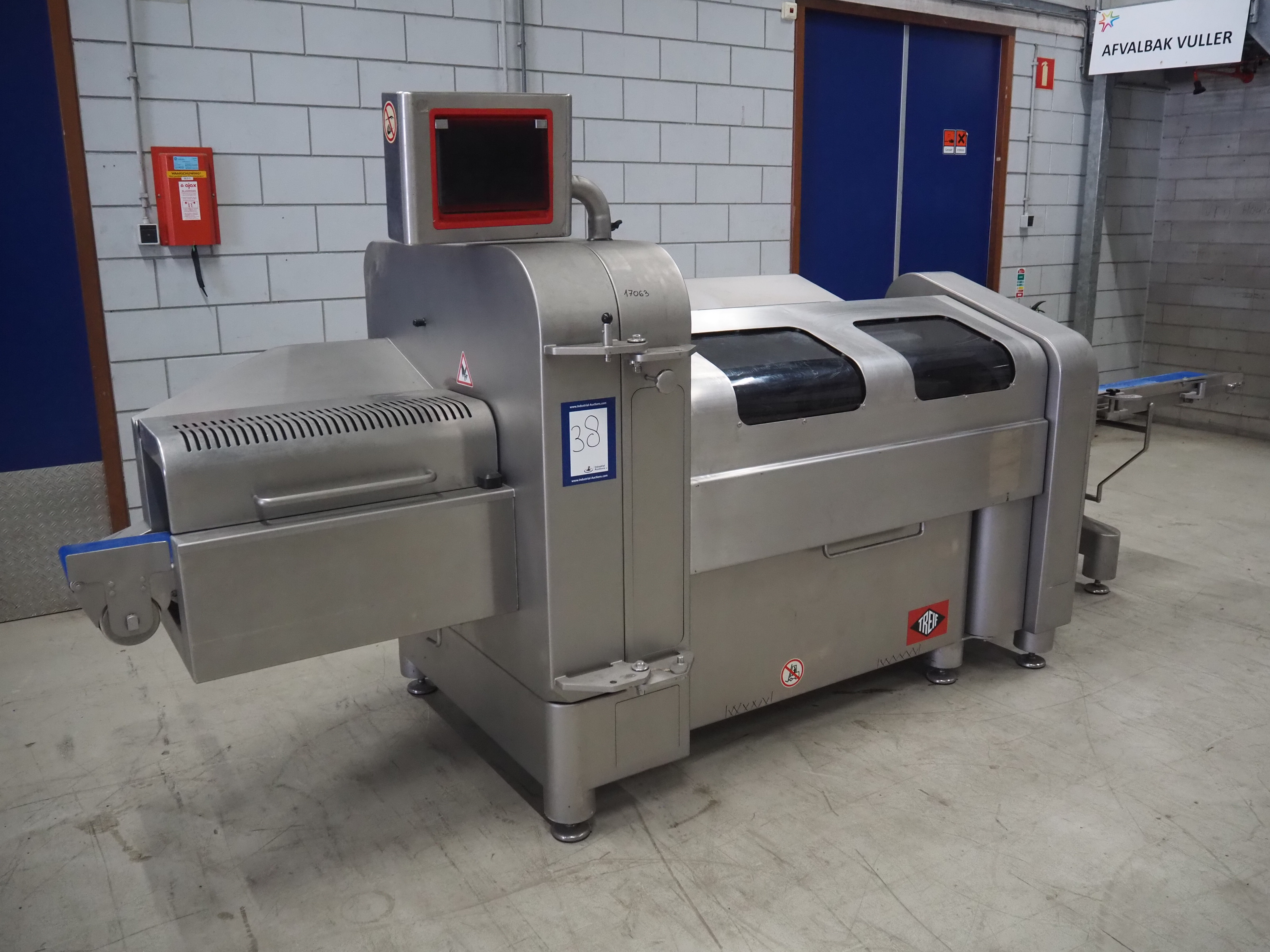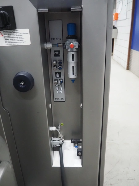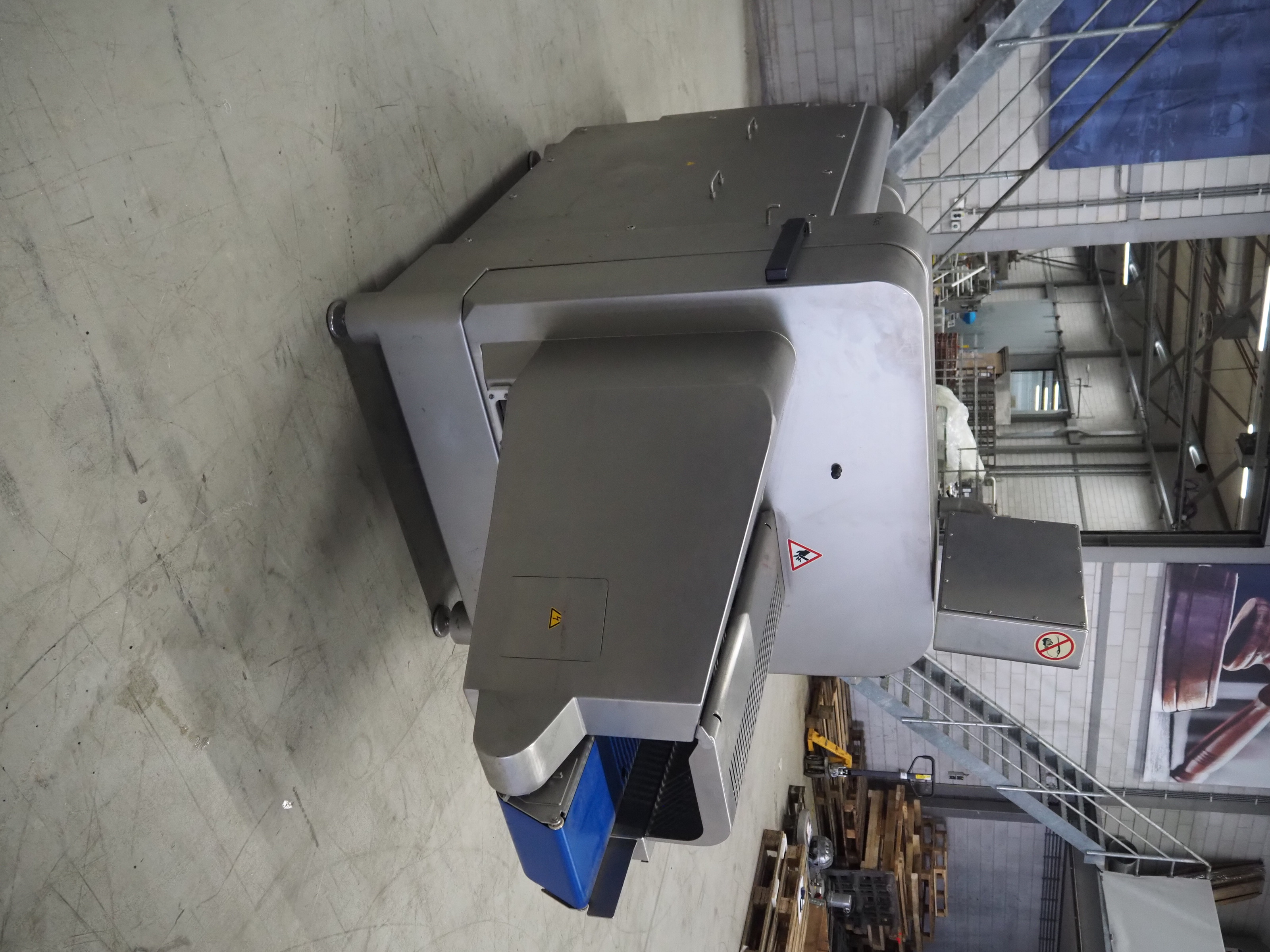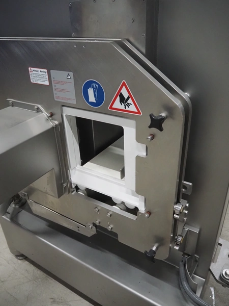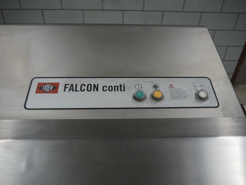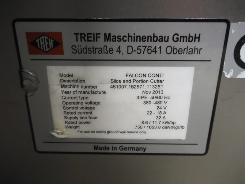 Treif Maschinenbau GmbH slice and portion cutter, model: FALCON CONTI, machine number: 461007.162571.113261, year of construction: 11/2013, 380/480 V, 3 Ph, 50/60 Hz, 22/18/32 A, 8.6/11.7 kW, weight: 750 kg, plastic belts, belt width: 220 mm, clearance: 200 mm x 220 mm, total dimensions: 4600 mm x 1350 mm x 1840 mm. Switch cabinet incomplete.