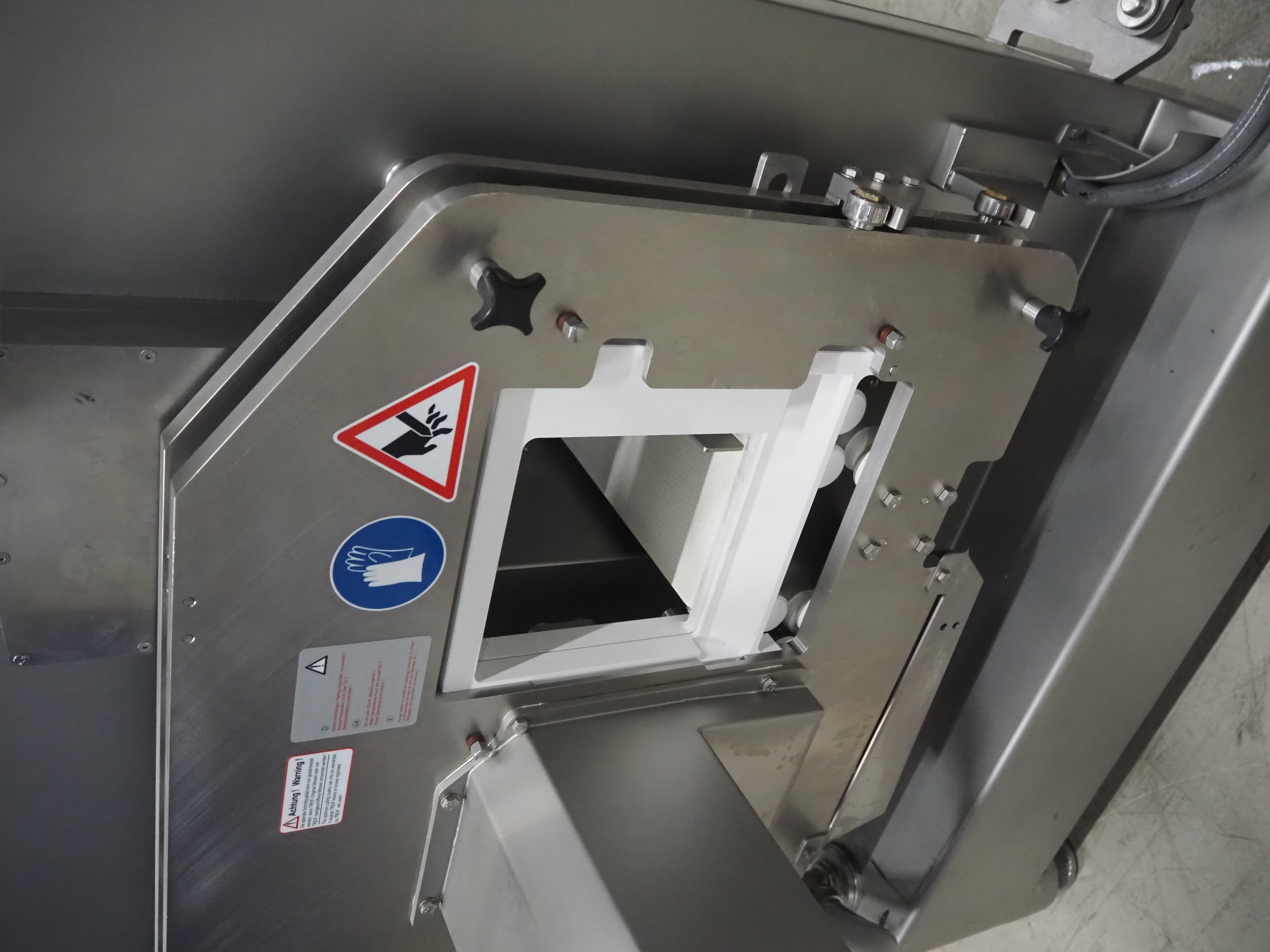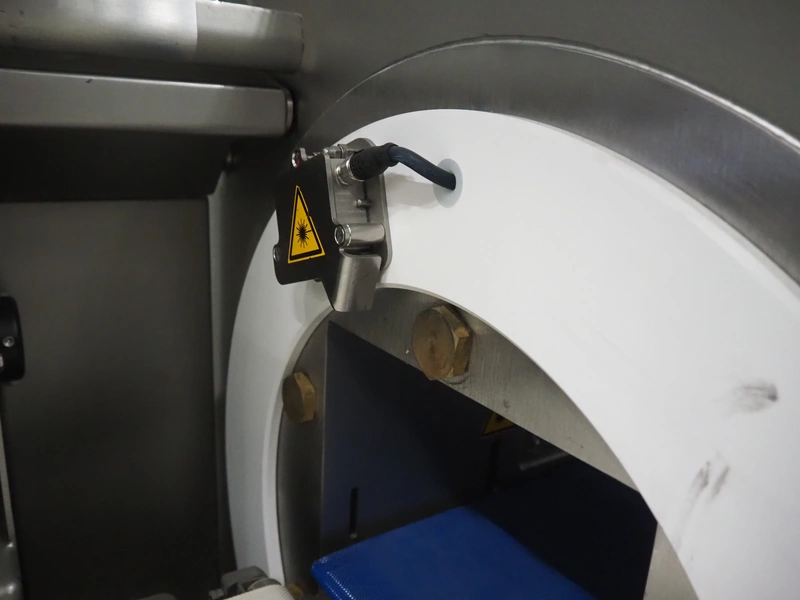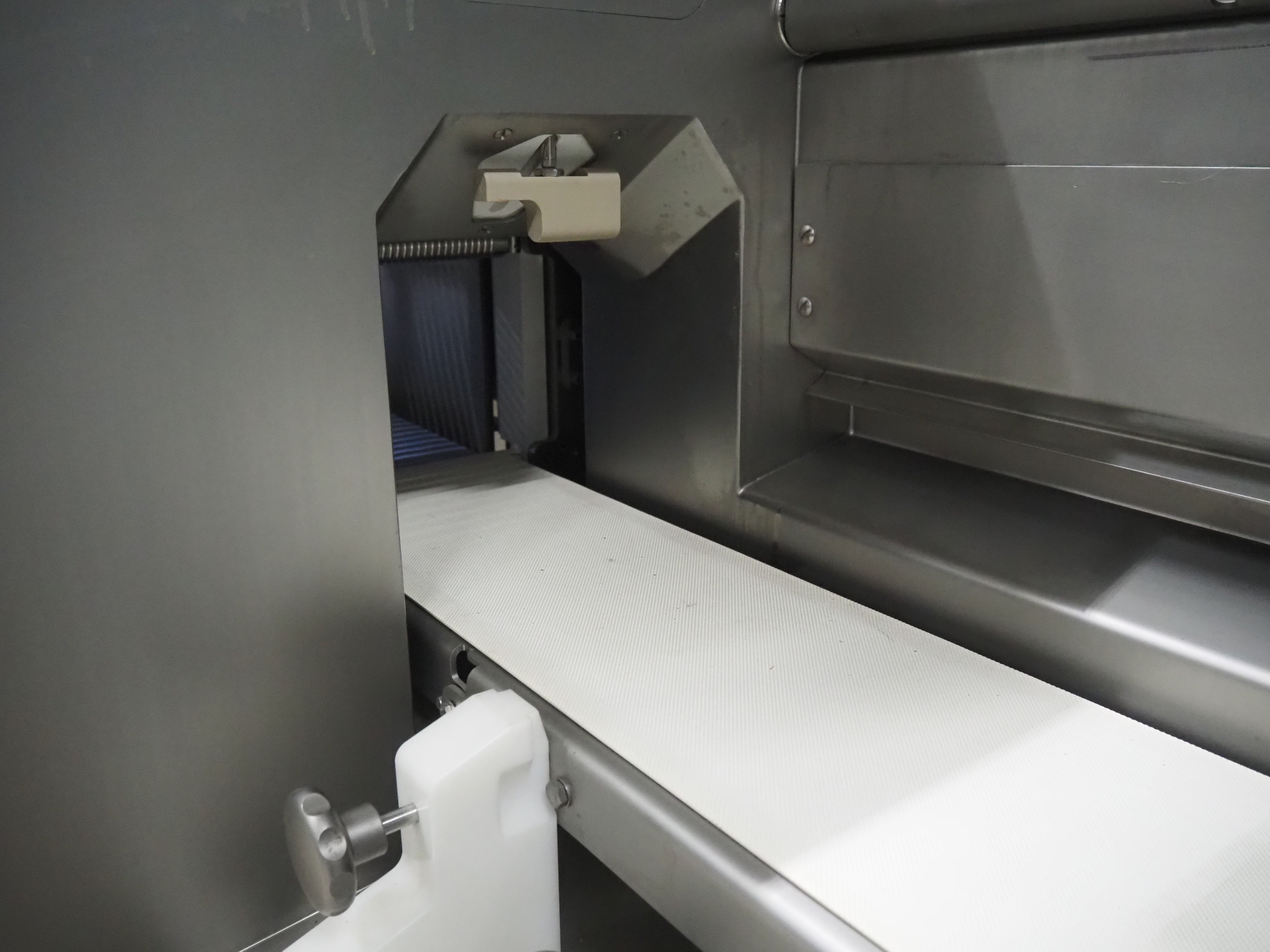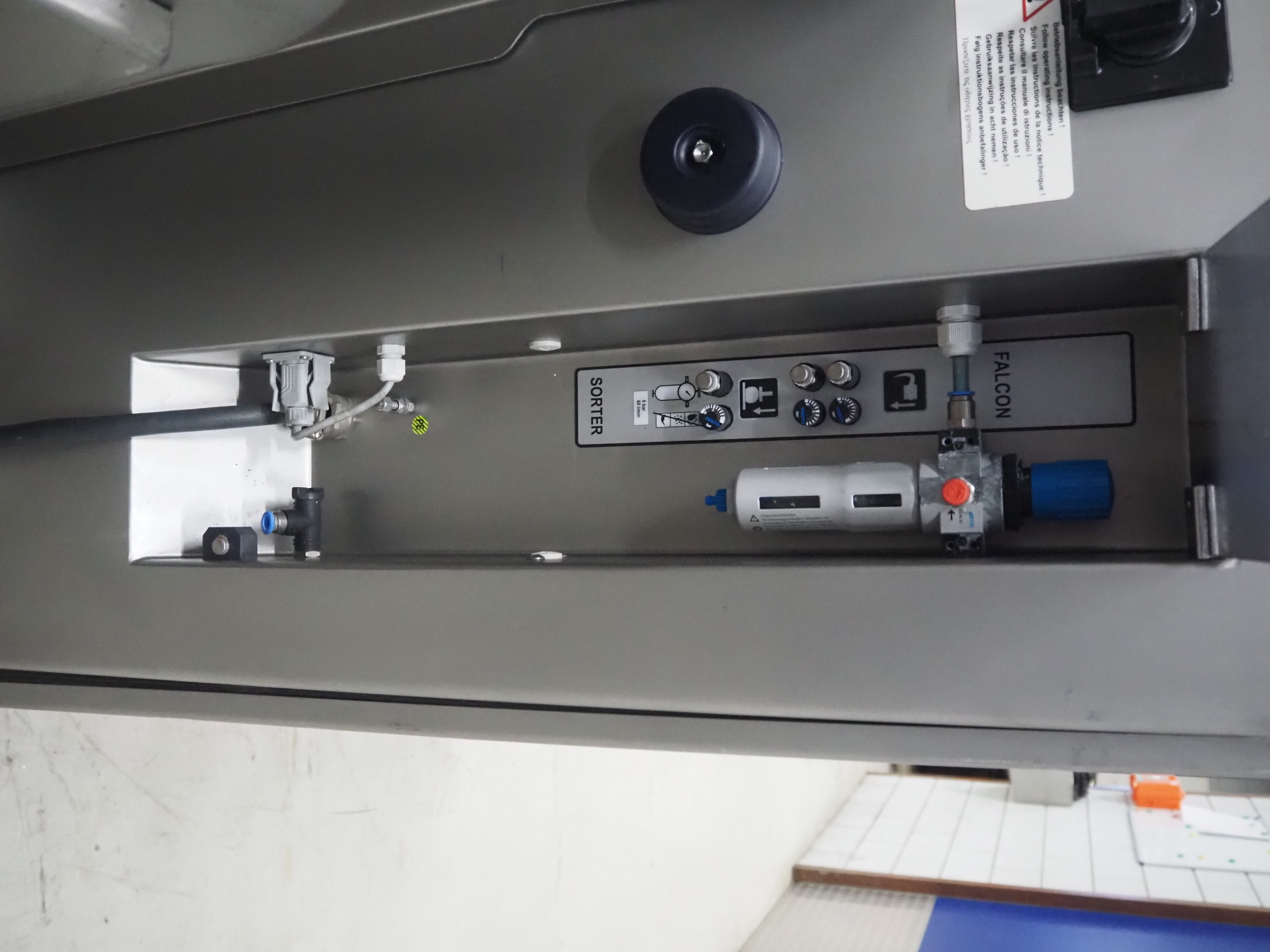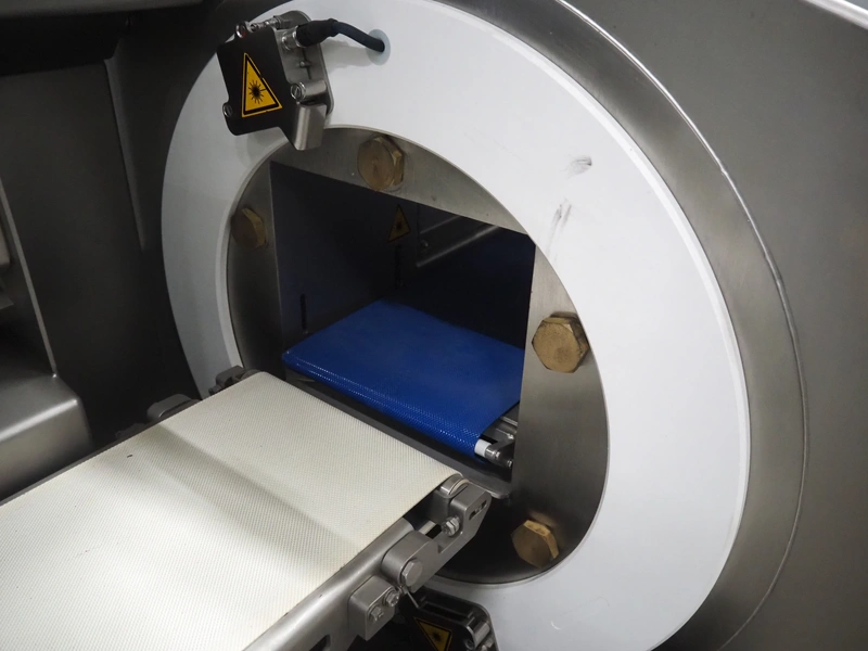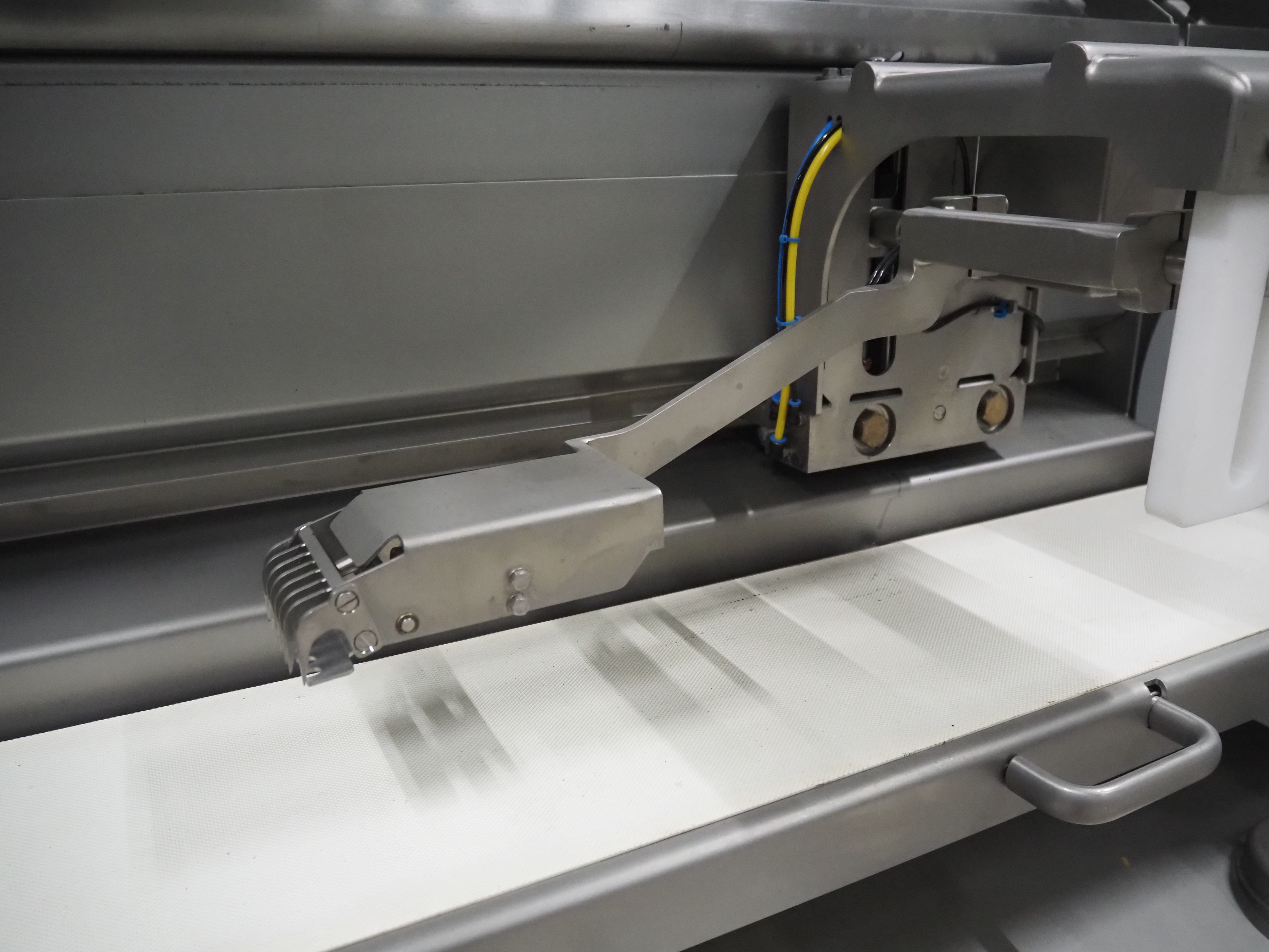Treif Maschinenbau GmbH slice and portion cutter, model: FALCON CONTI, machine number: 461007.162571.113261, year of construction: 11/2013, 380/480 V, 3 Ph, 50/60 Hz, 22/18/32 A, 8.6/11.7 kW, weight: 750 kg, plastic belts, belt width: 220 mm, clearance: 200 mm x 220 mm, total dimensions: 4600 mm x 1350 mm x 1840 mm. Switch cabinet incomplete.