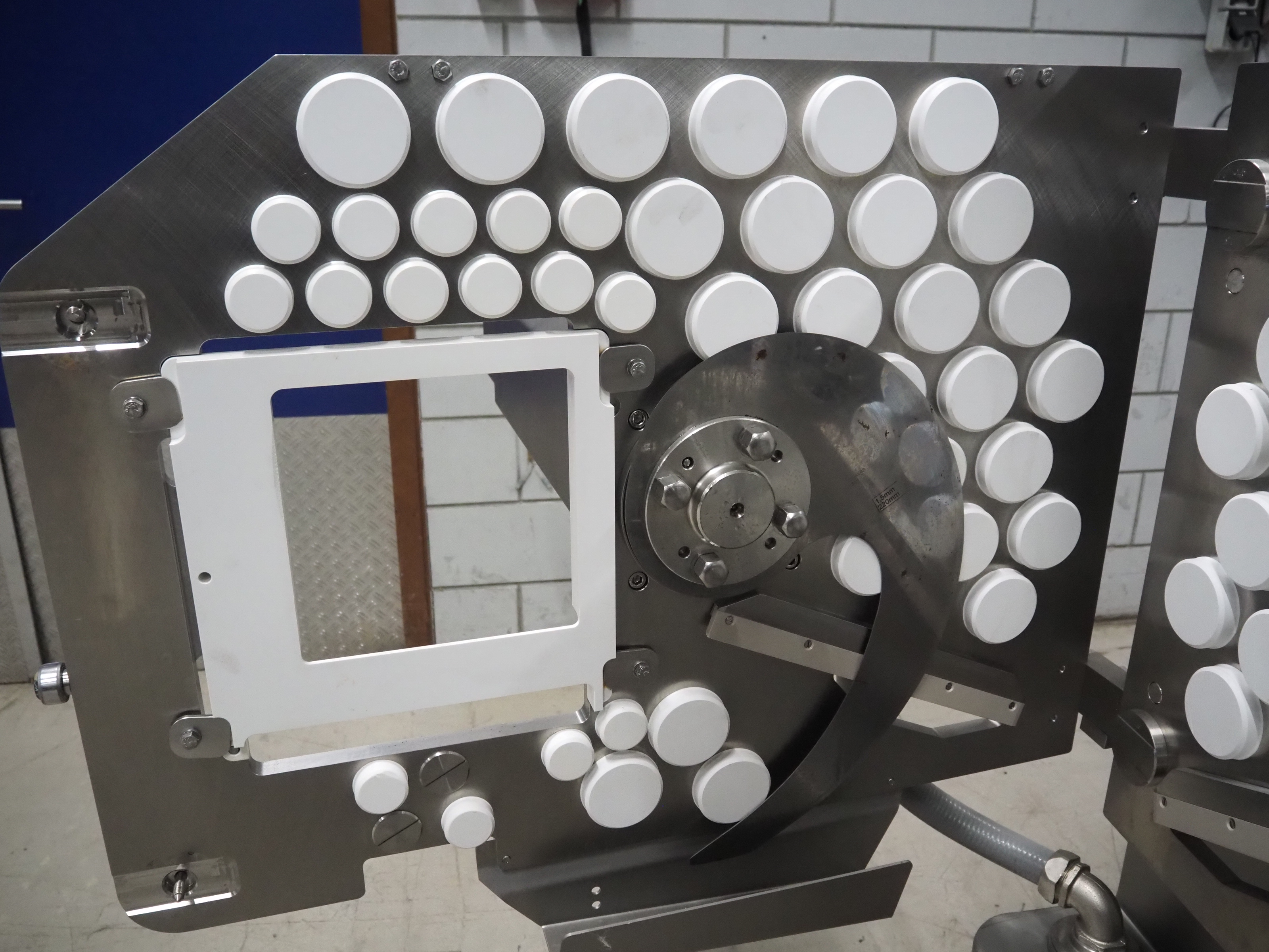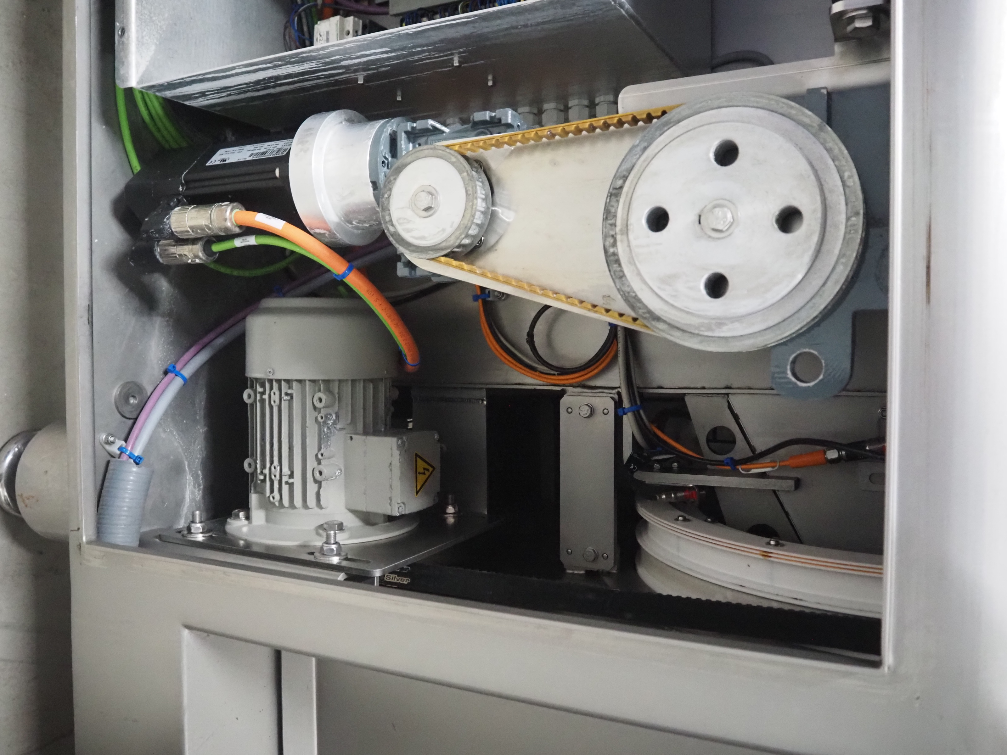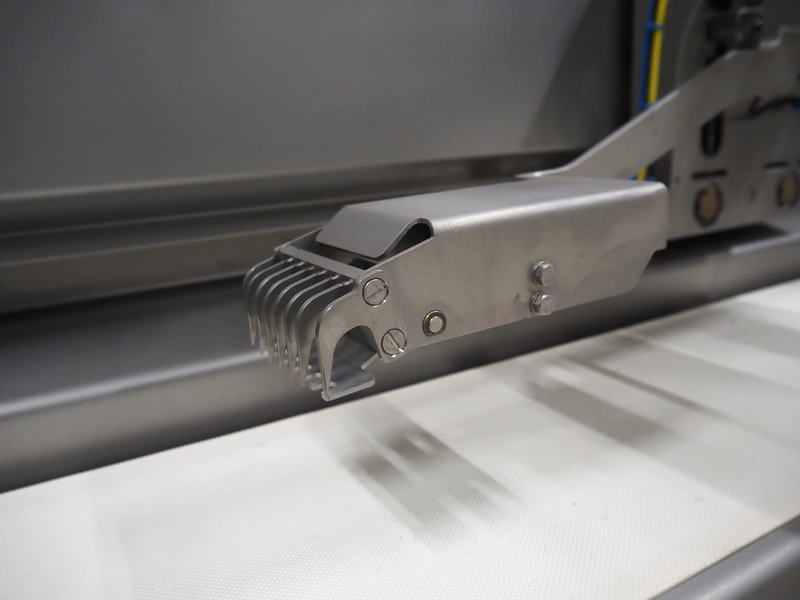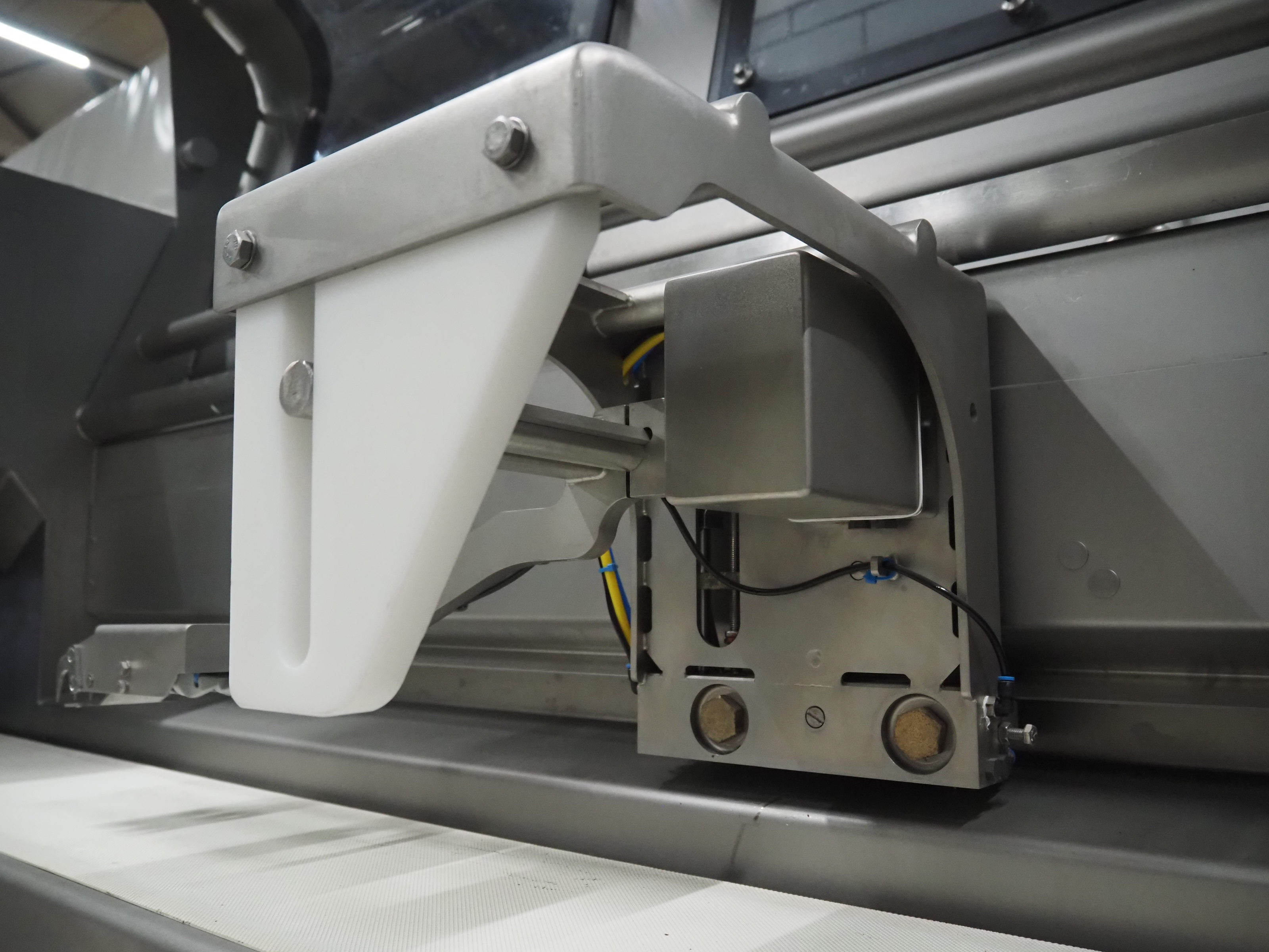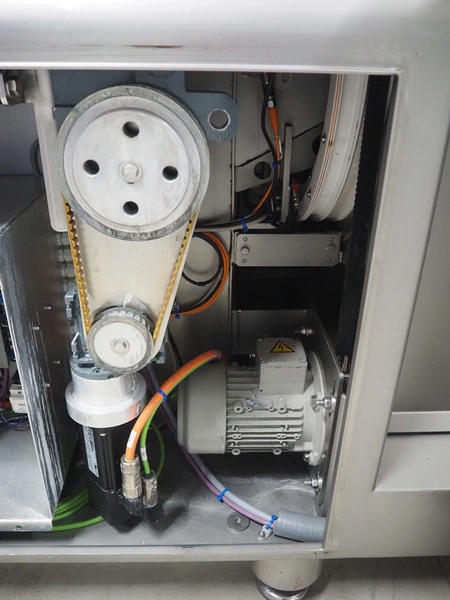 Treif Maschinenbau GmbH slice and portion cutter, model: FALCON CONTI, machine number: 461007.162571.113261, year of construction: 11/2013, 380/480 V, 3 Ph, 50/60 Hz, 22/18/32 A, 8.6/11.7 kW, weight: 750 kg, plastic belts, belt width: 220 mm, clearance: 200 mm x 220 mm, total dimensions: 4600 mm x 1350 mm x 1840 mm. Switch cabinet incomplete.