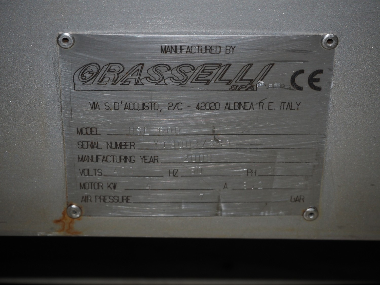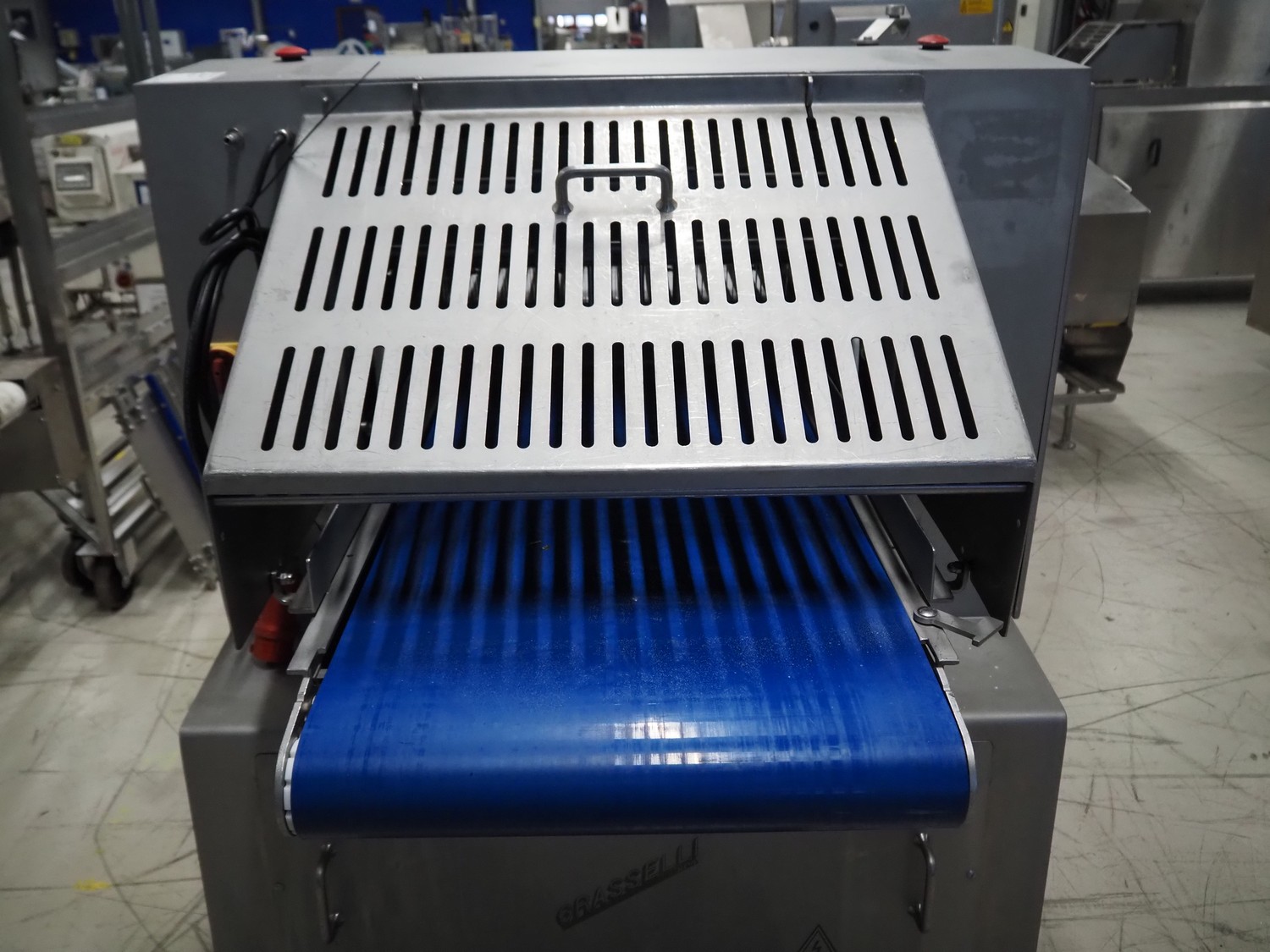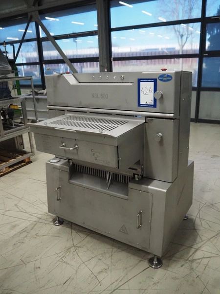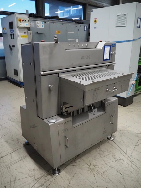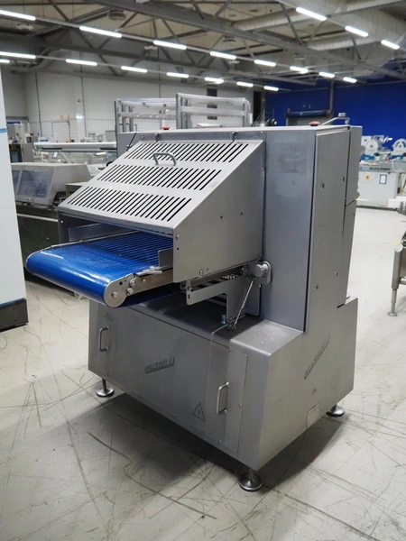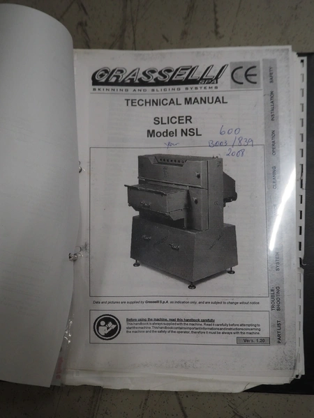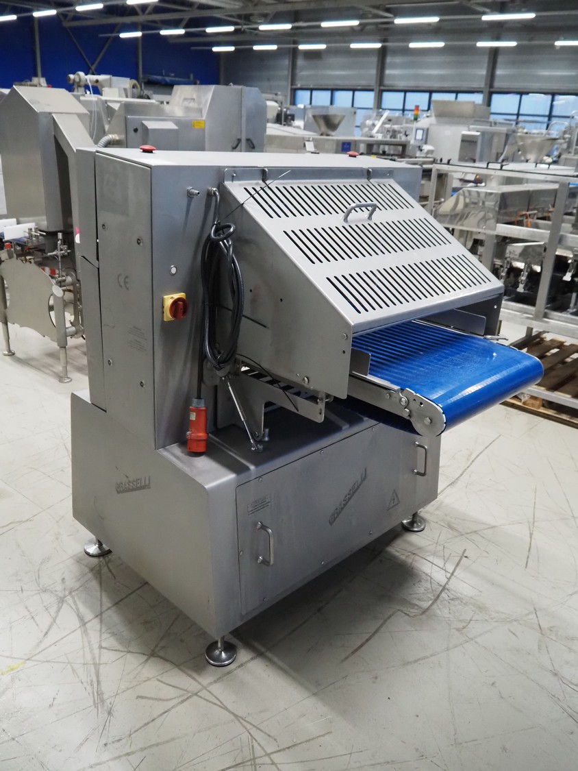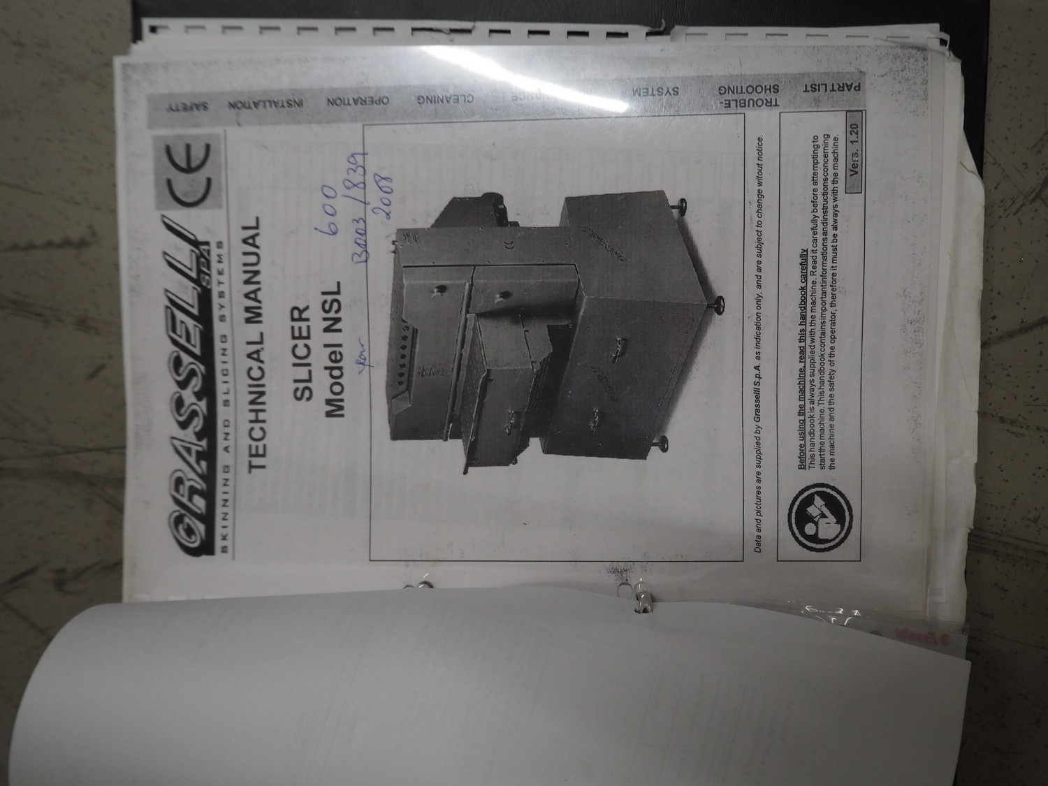 Grasselli SpA slicer, model: NSL 600, serial number: Y13003/839, year of construction: 2008, 400 V, 3 Ph, 50 Hz, 4 kW, working width: 610 mm, distance between knives: 20 mm, plastic belt, belt width: 540 mm, total dimensions: 1500 mm x 1200 mm x 1500 mm. Some knives are broken.