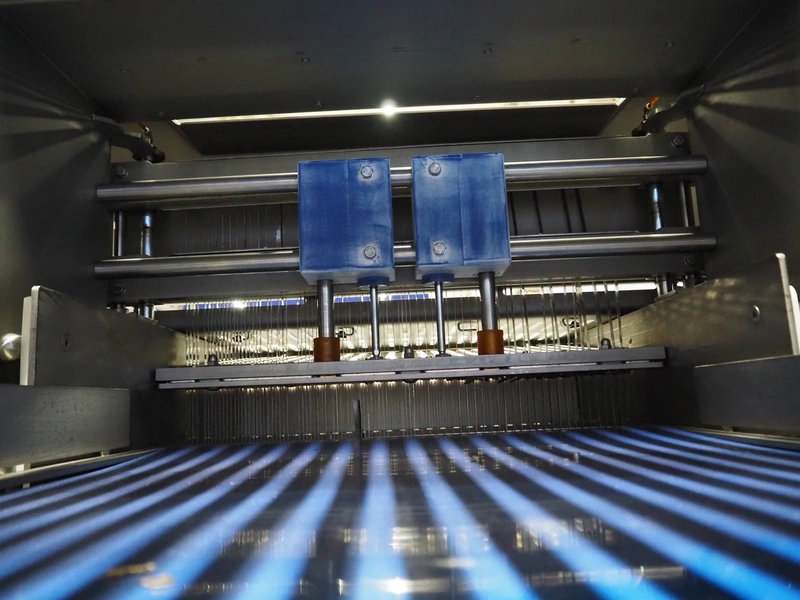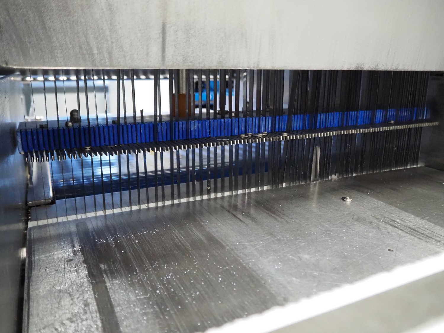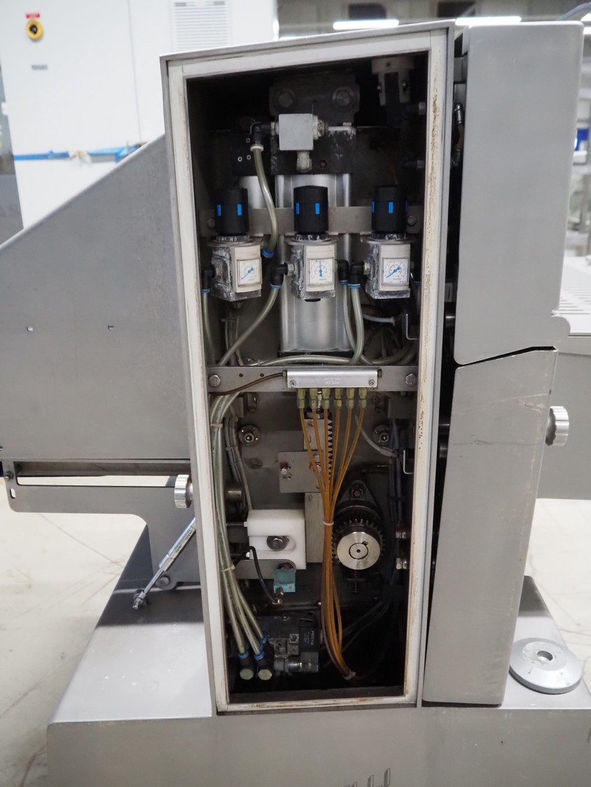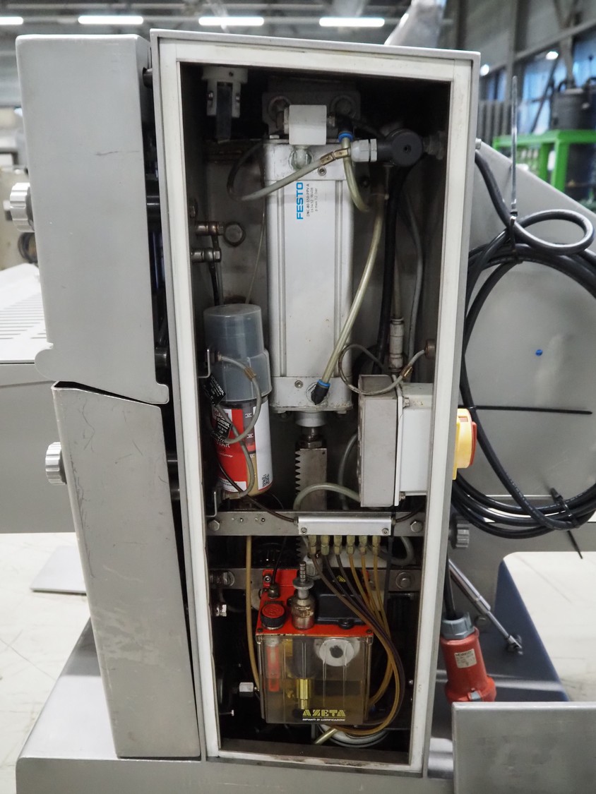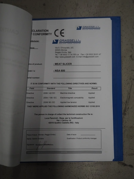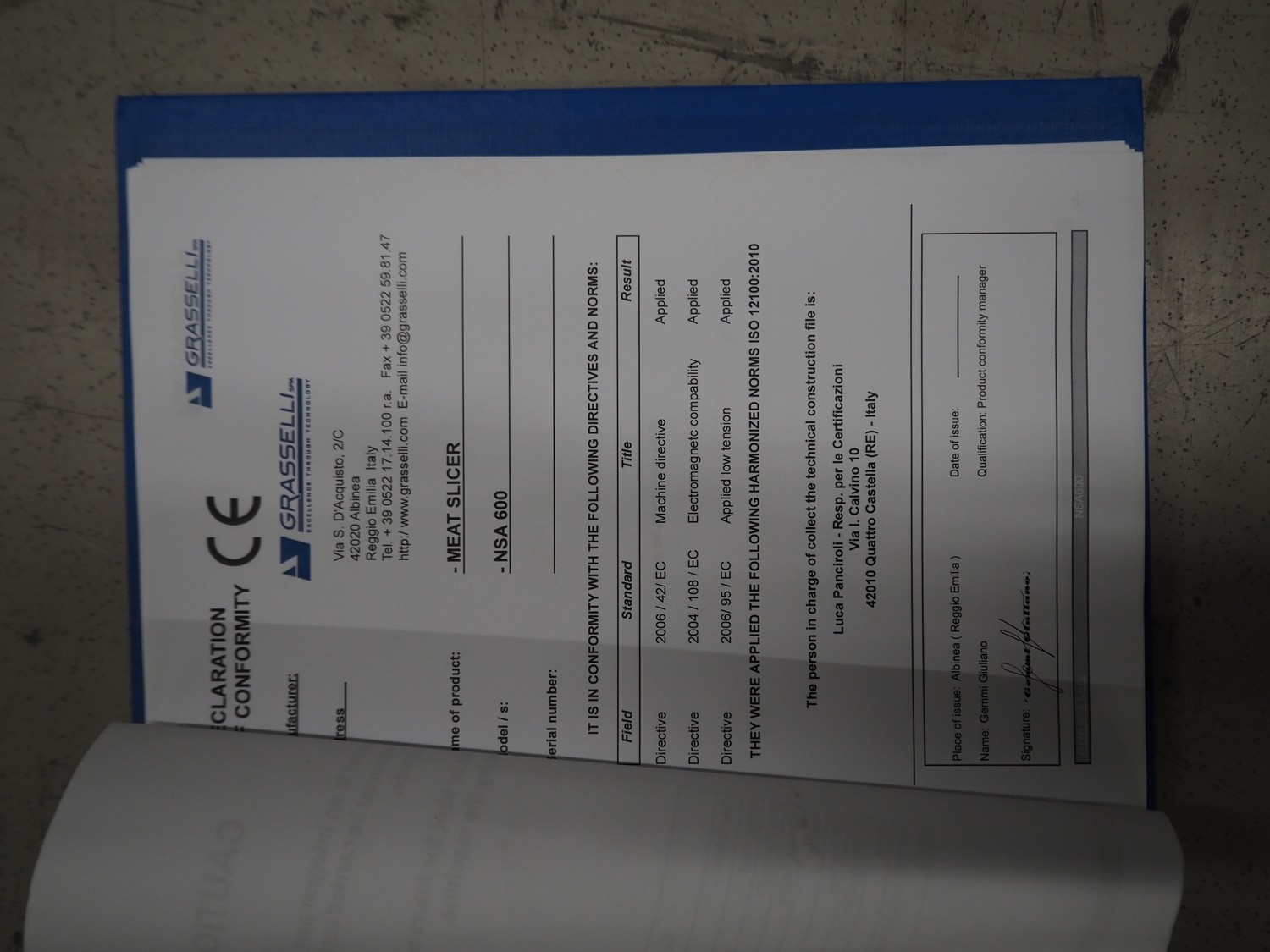 Grasselli SpA slicer, model: NSL 600, serial number: Y13003/839, year of construction: 2008, 400 V, 3 Ph, 50 Hz, 4 kW, working width: 610 mm, distance between knives: 20 mm, plastic belt, belt width: 540 mm, total dimensions: 1500 mm x 1200 mm x 1500 mm. Some knives are broken.