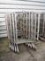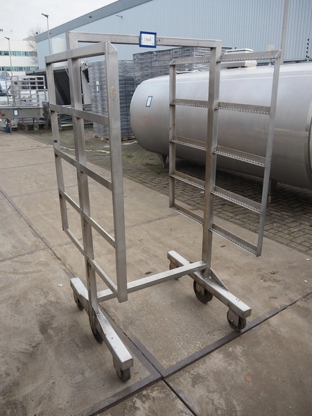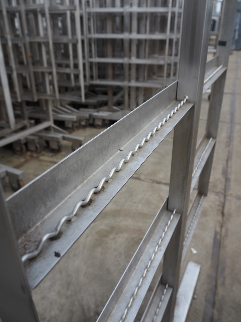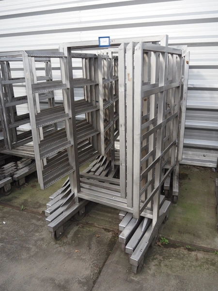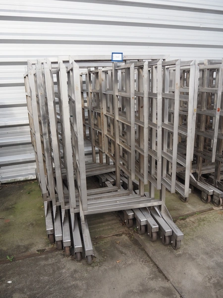 10 s/s smoke trolleys, 5 floors each, dimensions each floor: 960 mm x 900 mm, total dimensions: (10x) 960 mm x 910 mm x 1800 mm. Including 20 aluminium y-shaped smoke sticks per trolley, length each smoke stick: 880 mm.