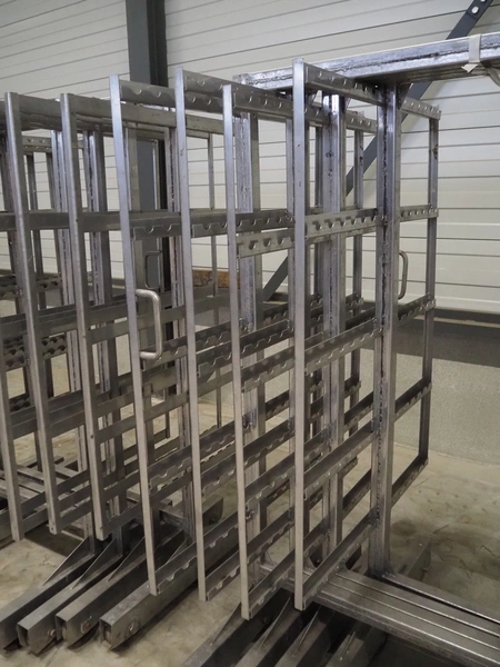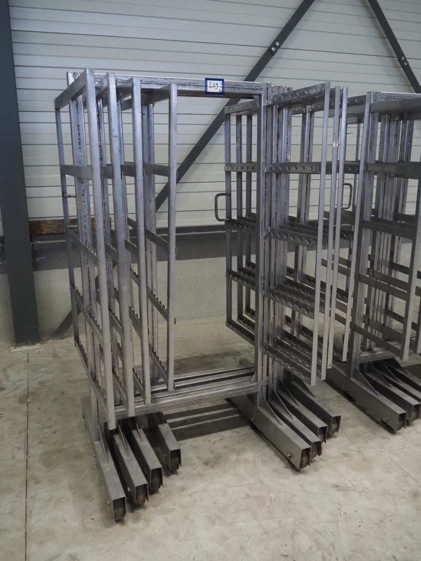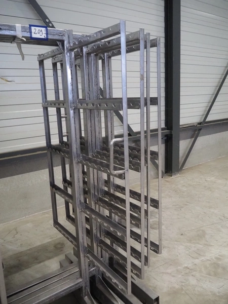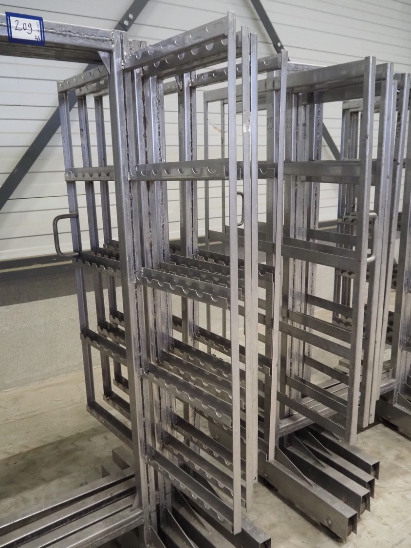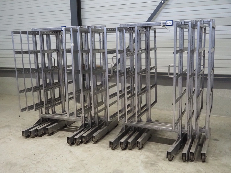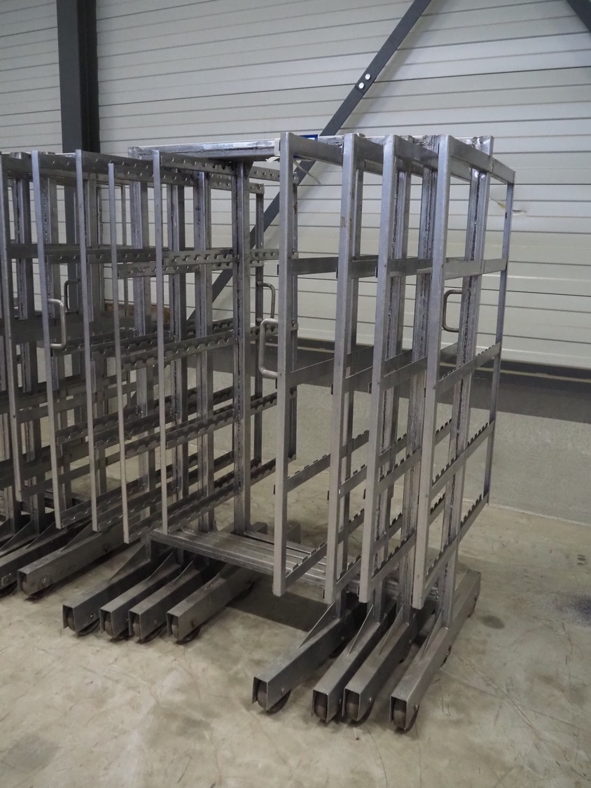 8 s/s smoke trolleys, 5 floors each, dimensions floors: 1000 mm x 1000 mm, total dimensions: (8x) 1000 mm x 1000 mm x 2000 mm.