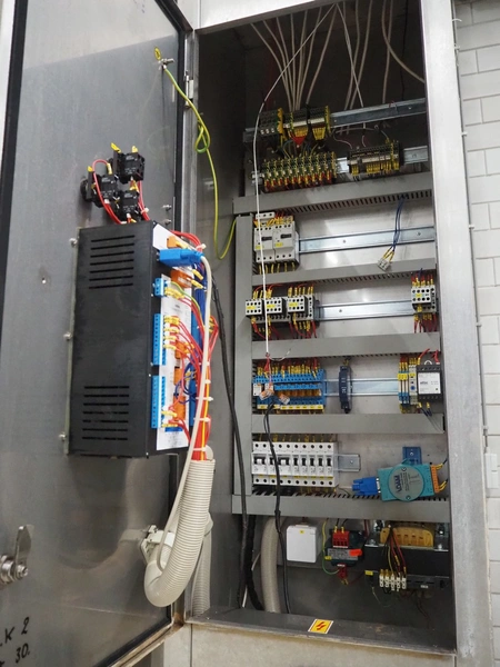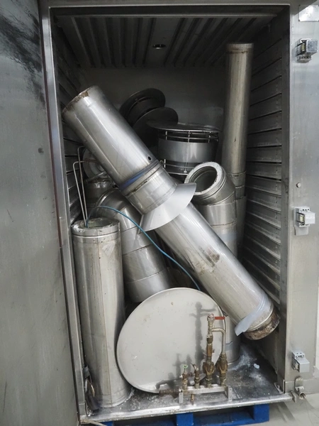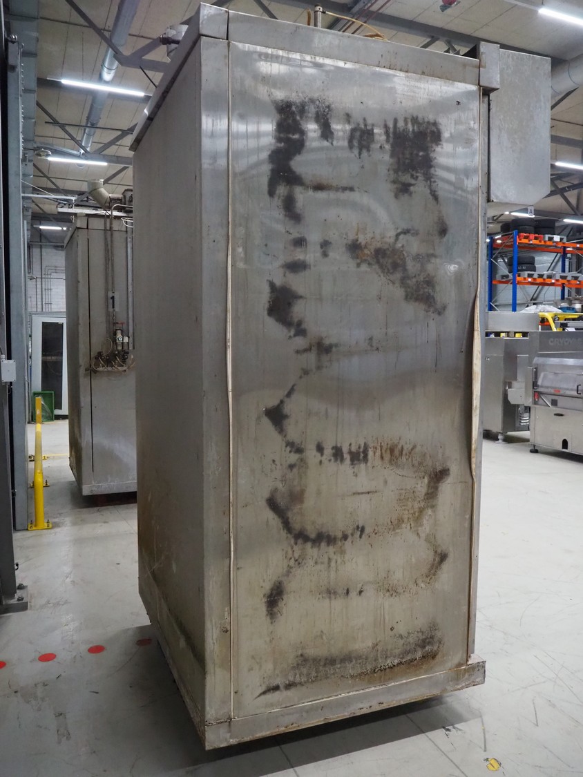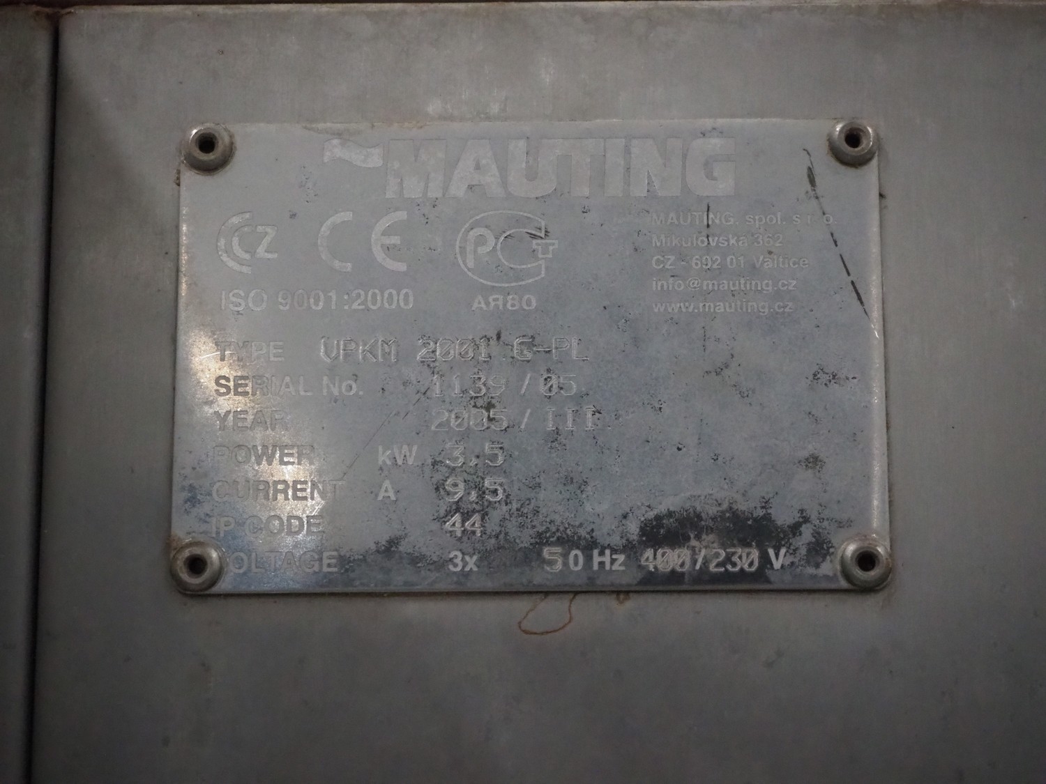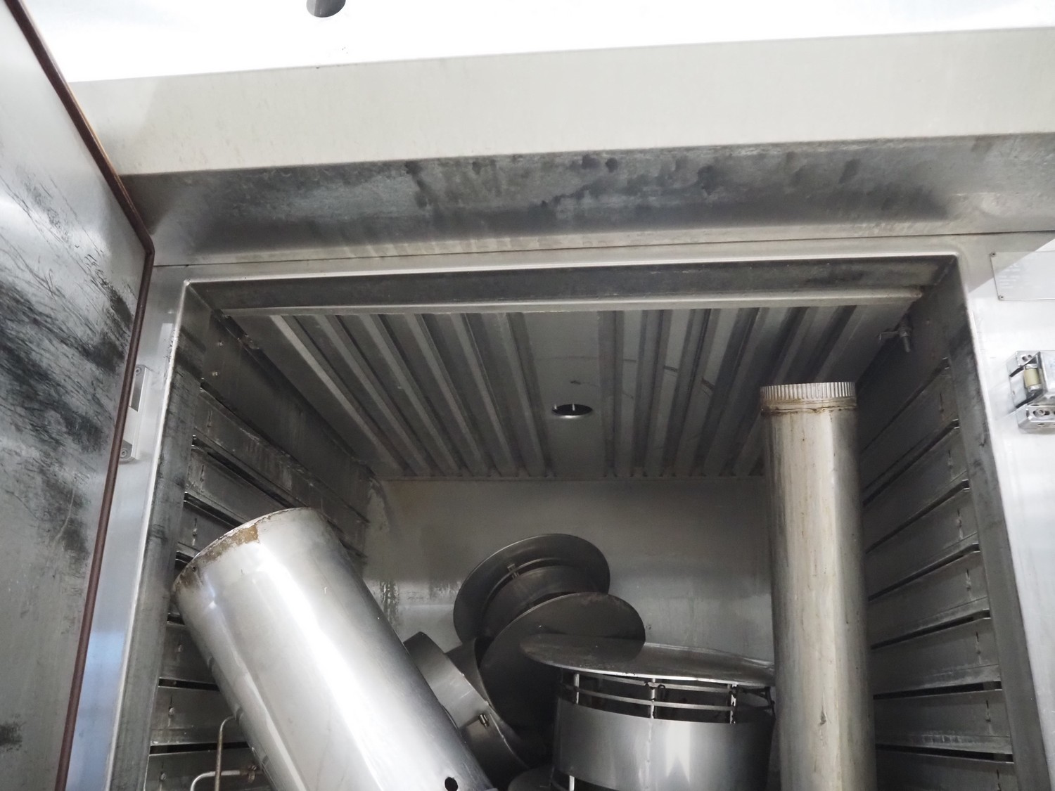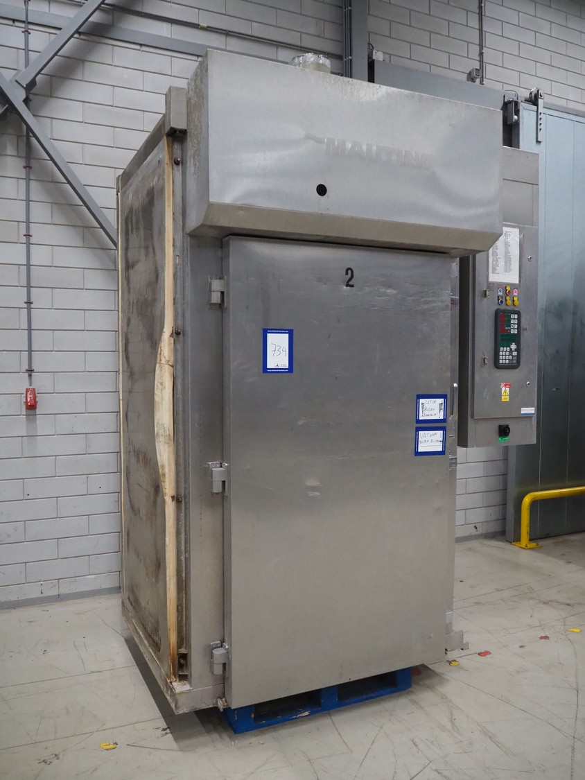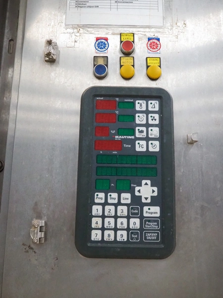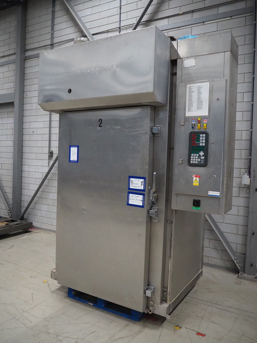 Mauting cooking and roasting chamber for 1 trolley, type: VPKM 2001 G-LL, serial number: 1138/05, year of construction: 2005, 400 V, 3 Ph, 9.5 A, 3.5 kW, weight: 1000 kg, Wieshaupt burner, type: WG10N/1A Z-LN, gas heated, dimensions: 1570 mm x 1200 mm x 3540 mm. Including s/s switch cabinet, dimensions: 500 mm x 400 mm x 1570 mm.