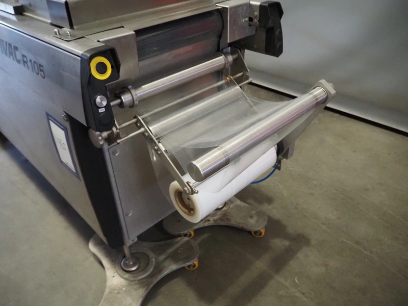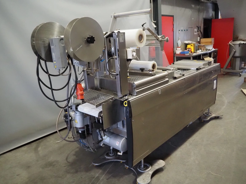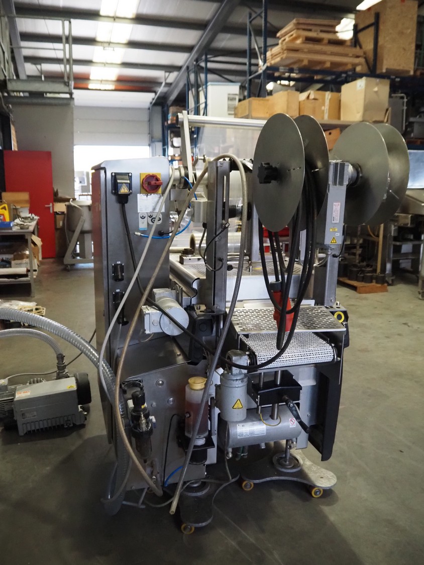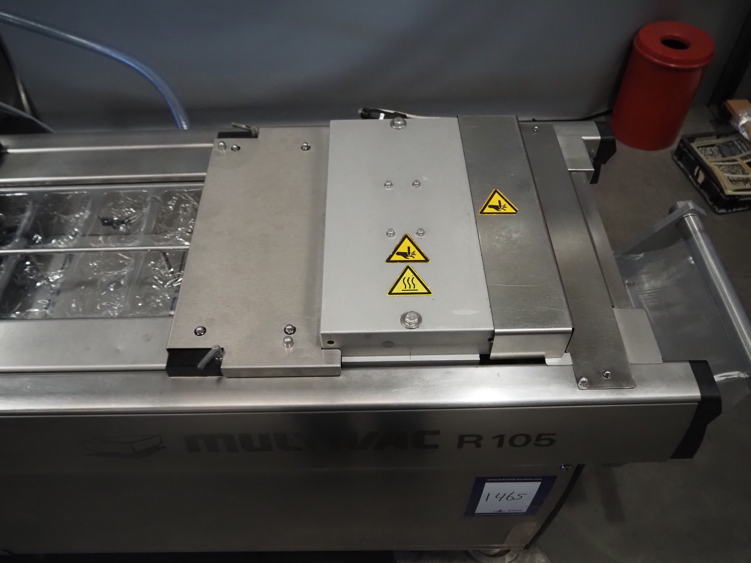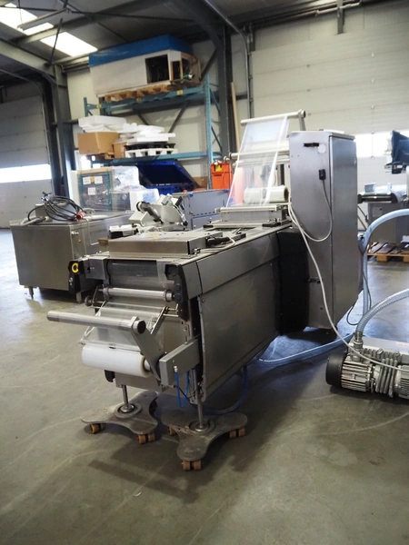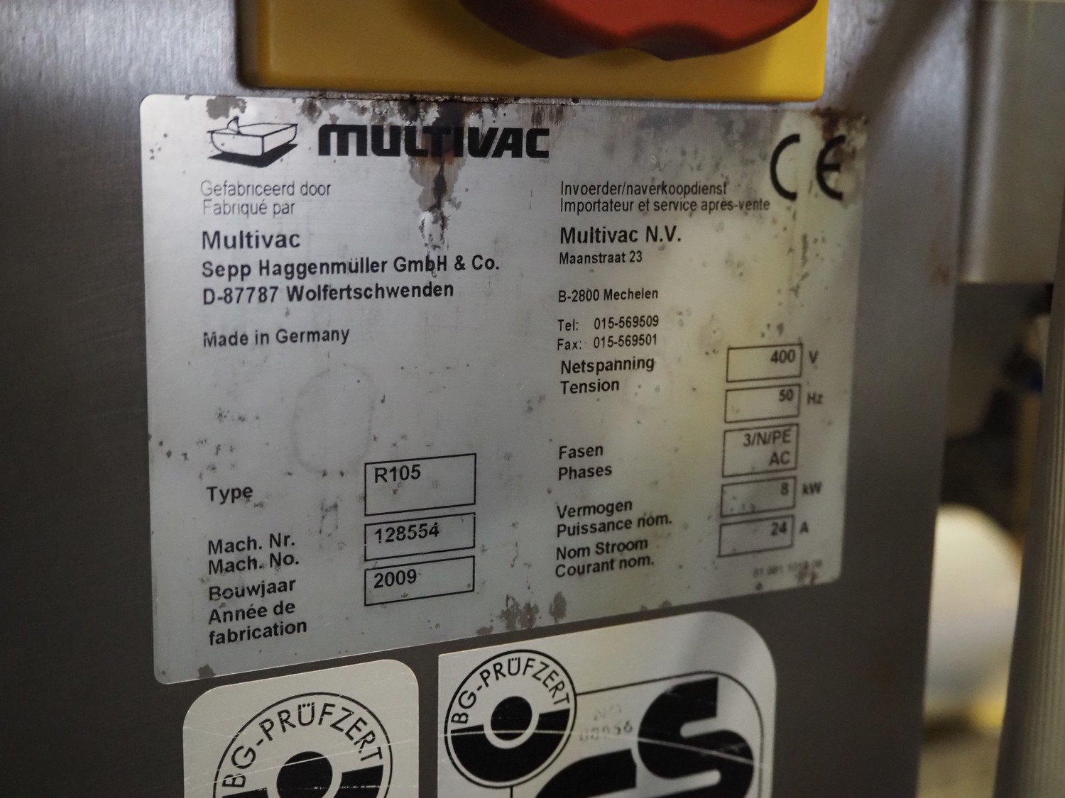 Multivac thermoformer, type: R105, machine number: 128554, year of construction: 2009, 400 V, 3 Ph, 50 Hz, 24 A, 8 kW, film width: 360 mm, dye: (4x) 145 mm x 100 mm, plastic mesh outfeed belt, belt width: 315 mm, Busch vacuum pump, type: RA 0100 E 5Z1, capacity: 100 m³ per hour, total dimensions: 3320 mm x 1000 mm x 1850 mm. Including crate with extra parts.