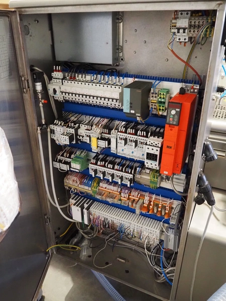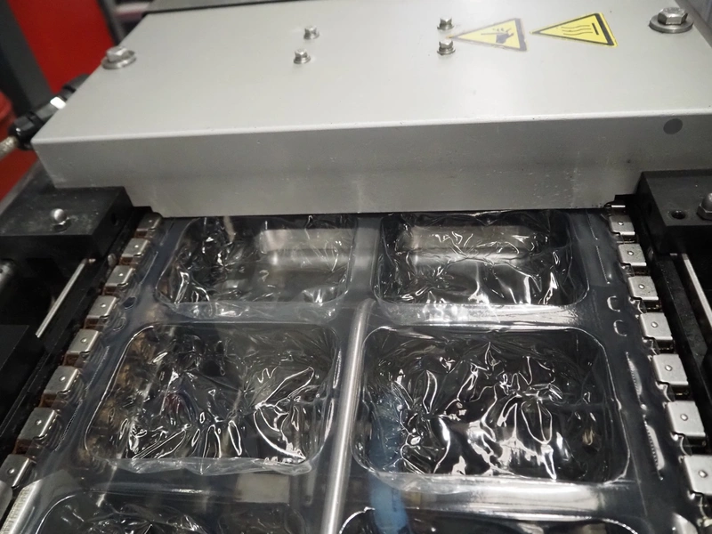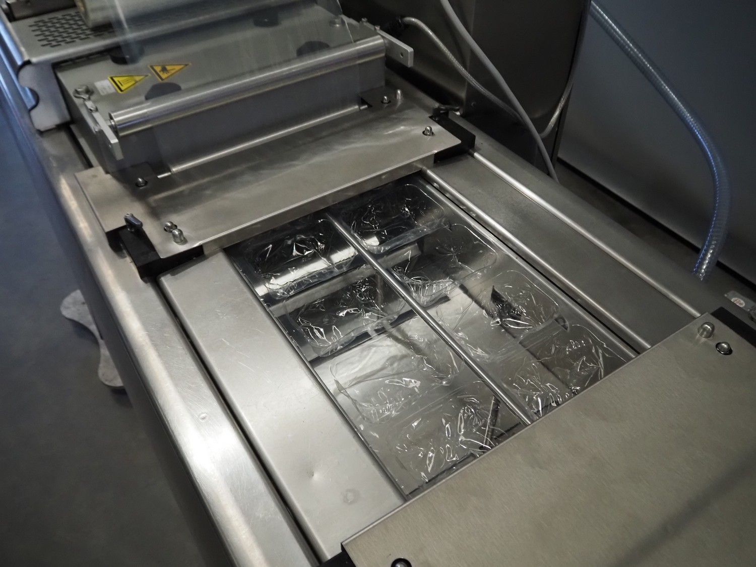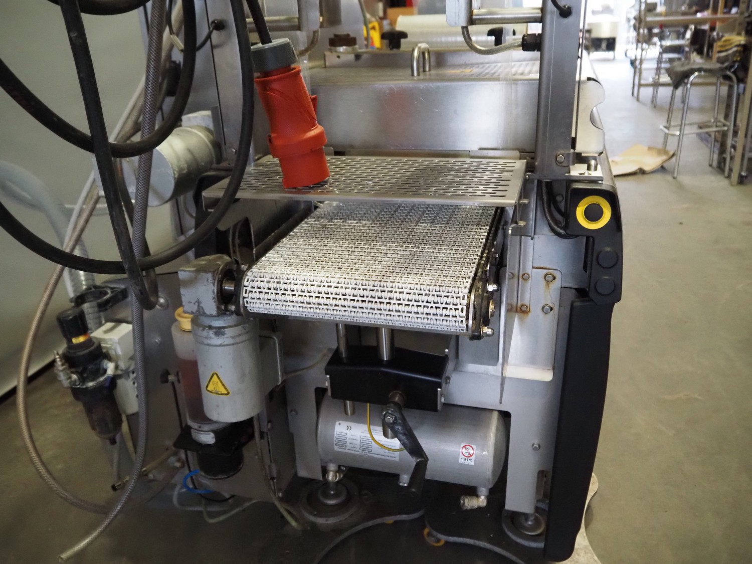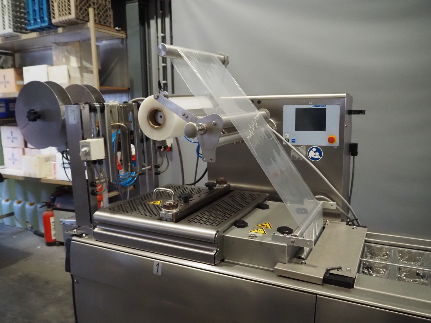 Multivac thermoformer, type: R105, machine number: 128554, year of construction: 2009, 400 V, 3 Ph, 50 Hz, 24 A, 8 kW, film width: 360 mm, dye: (4x) 145 mm x 100 mm, plastic mesh outfeed belt, belt width: 315 mm, Busch vacuum pump, type: RA 0100 E 5Z1, capacity: 100 m³ per hour, total dimensions: 3320 mm x 1000 mm x 1850 mm. Including crate with extra parts.