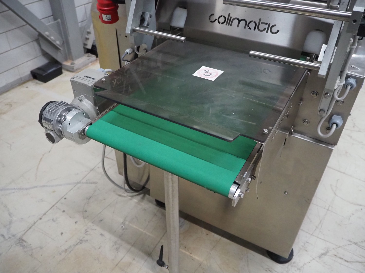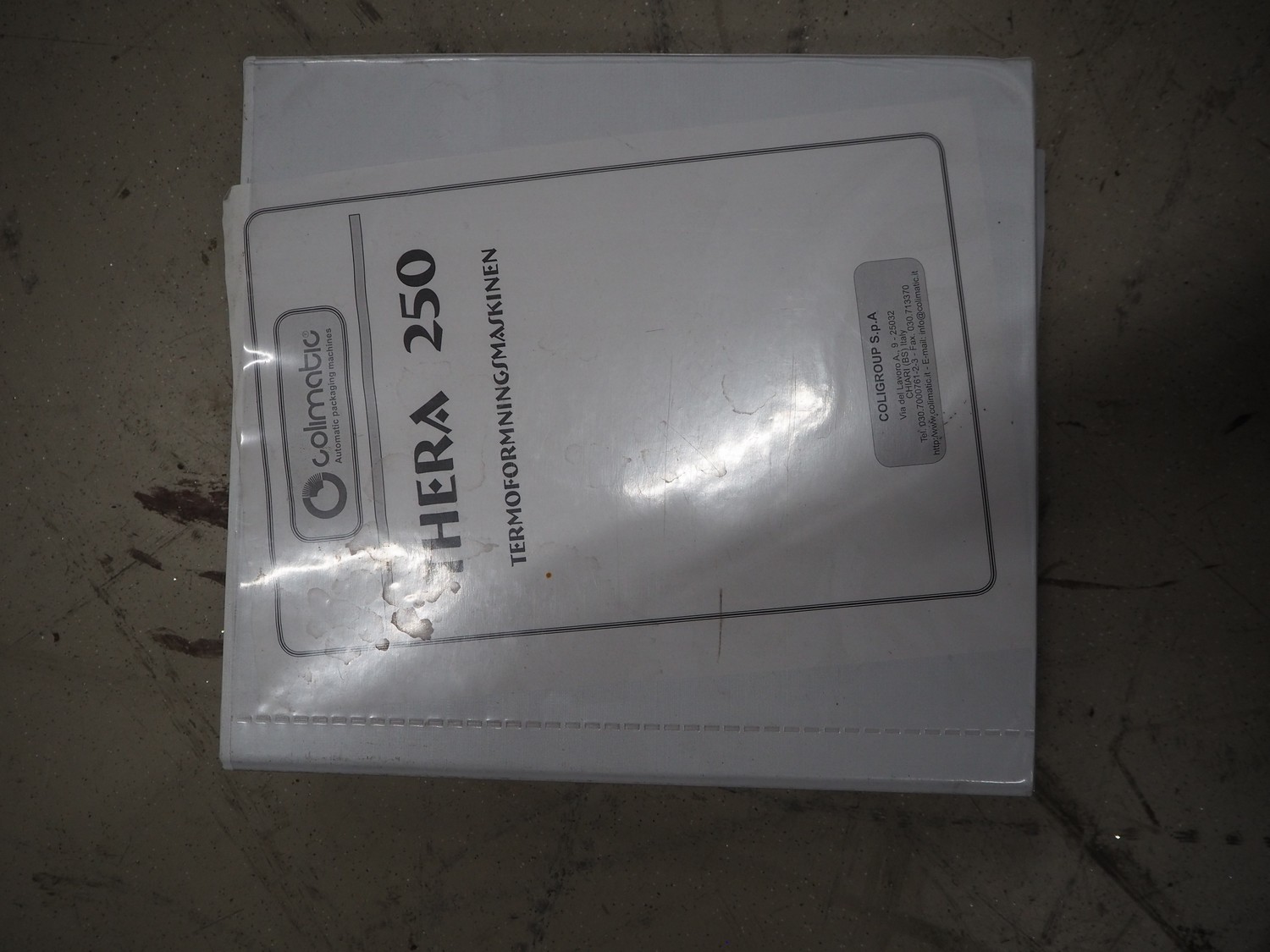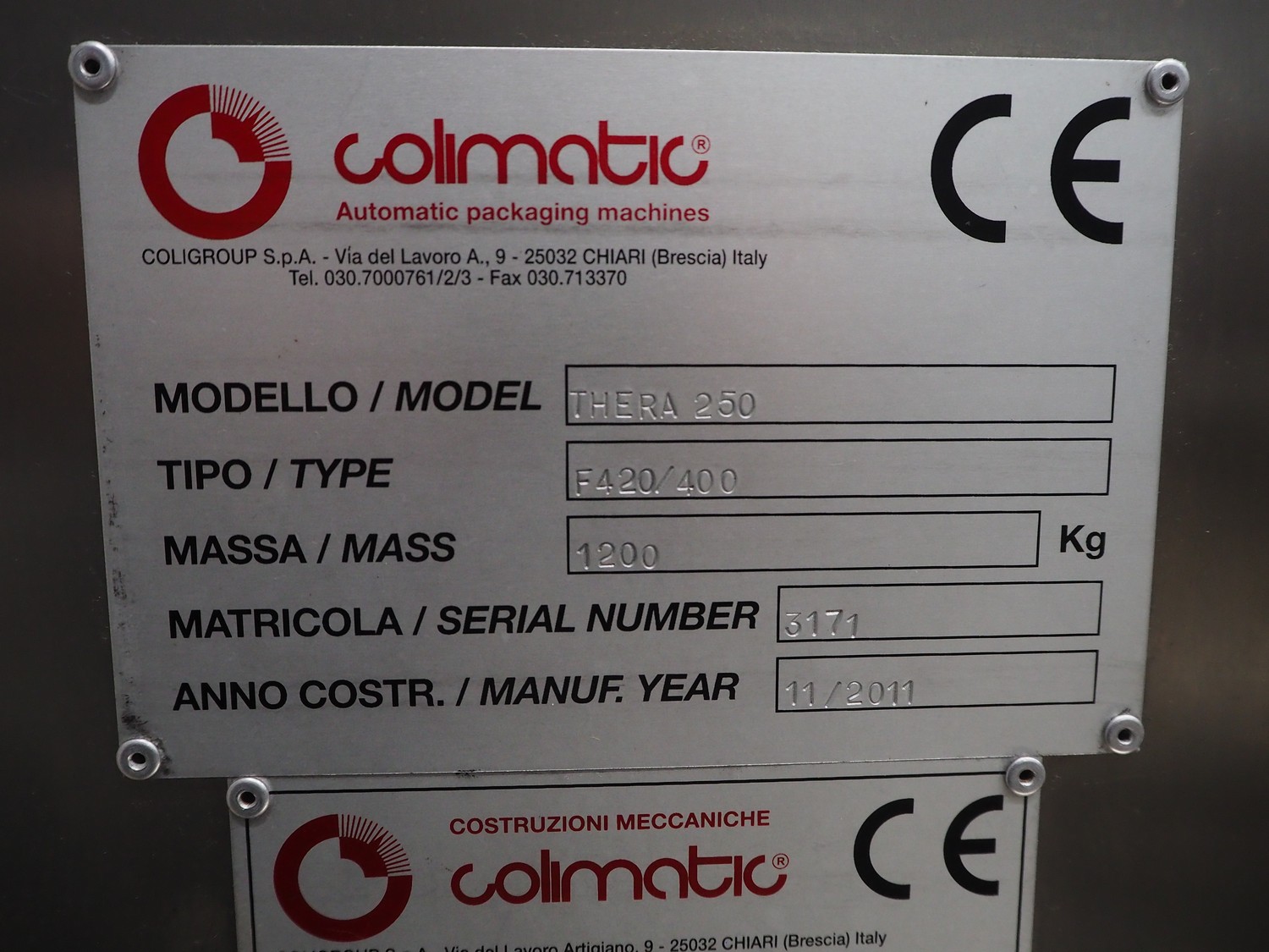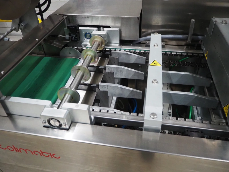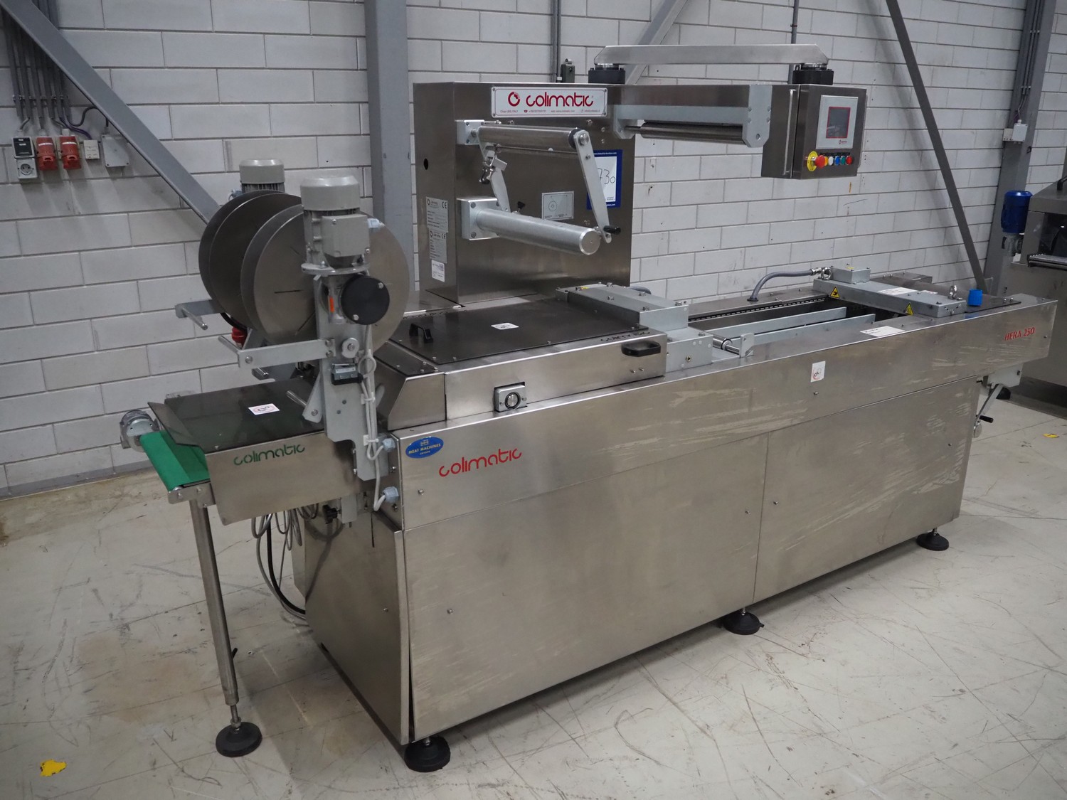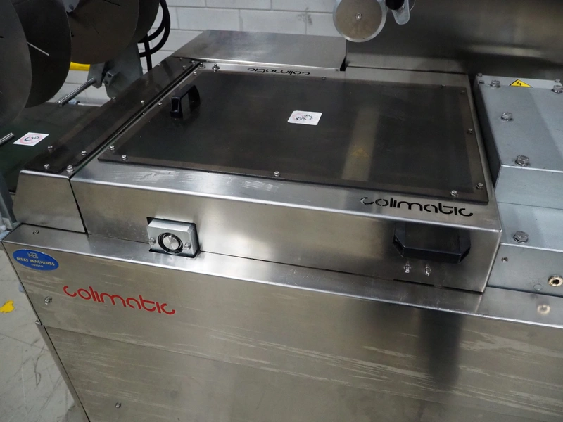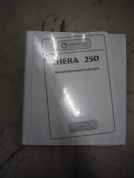 Colimatic thermoformer, model: THERA 250, type: F420/400, serial number: 3171, year of construction: 11/2011, 400 V, 3 Ph, 50 Hz, 16 A, 9 kW, weight: 1200 kg, dye: (3x) Ø 110 mm, plastic outfeed belt, belt width: 365 mm, Busch vacuum pump, type: RA 0063 F 5K3, capacity: 63 m³ per hour, total dimensions: 3400 mm x 1050 mm x 1900 mm.