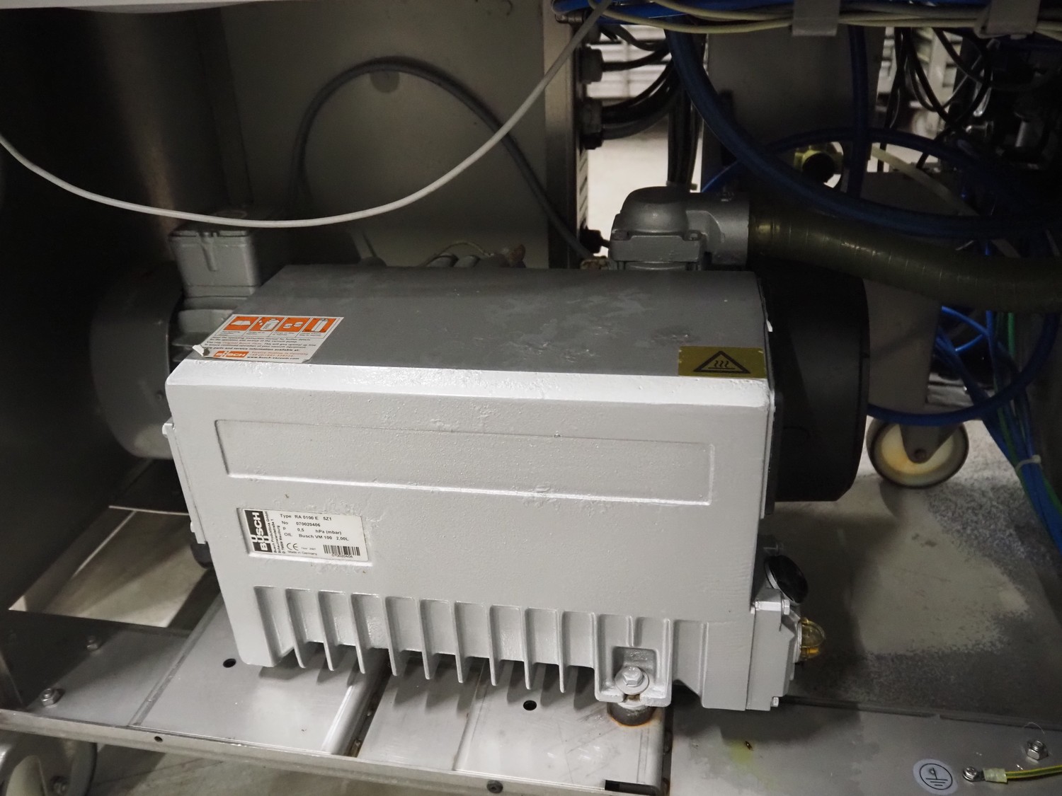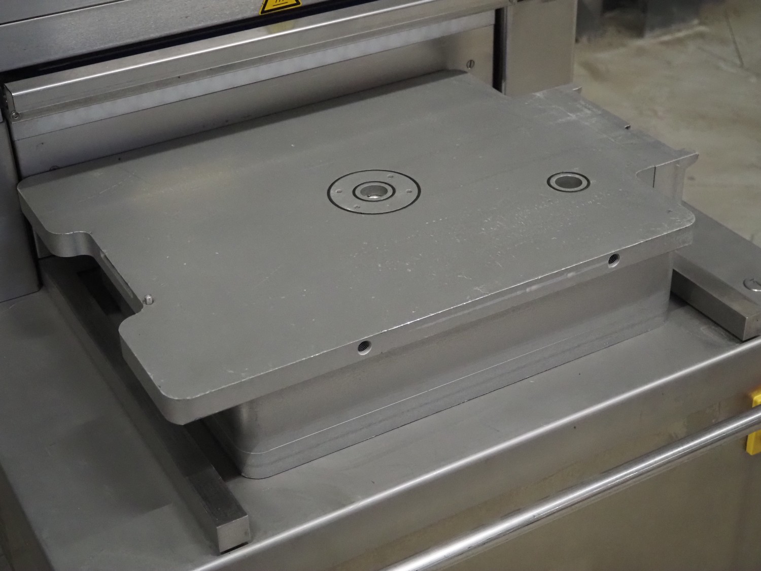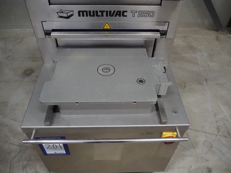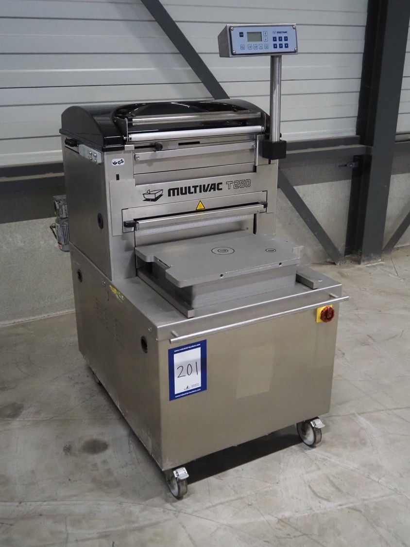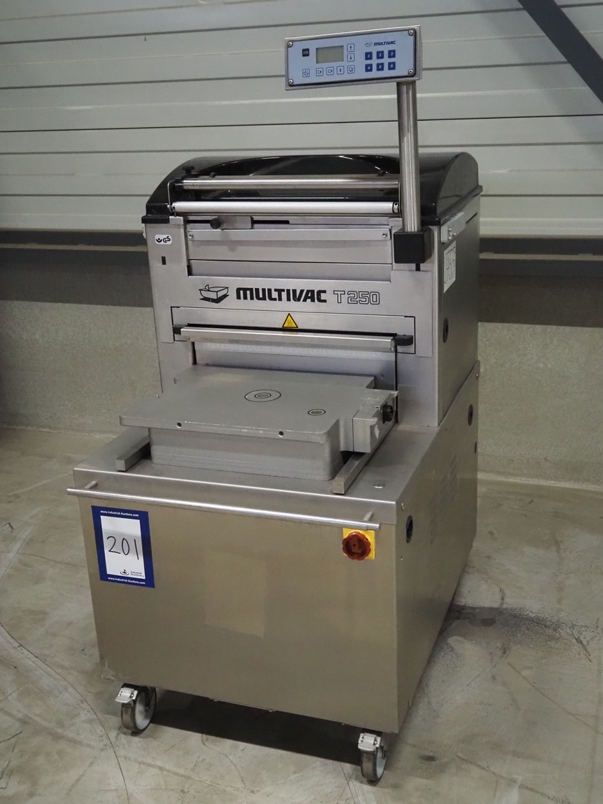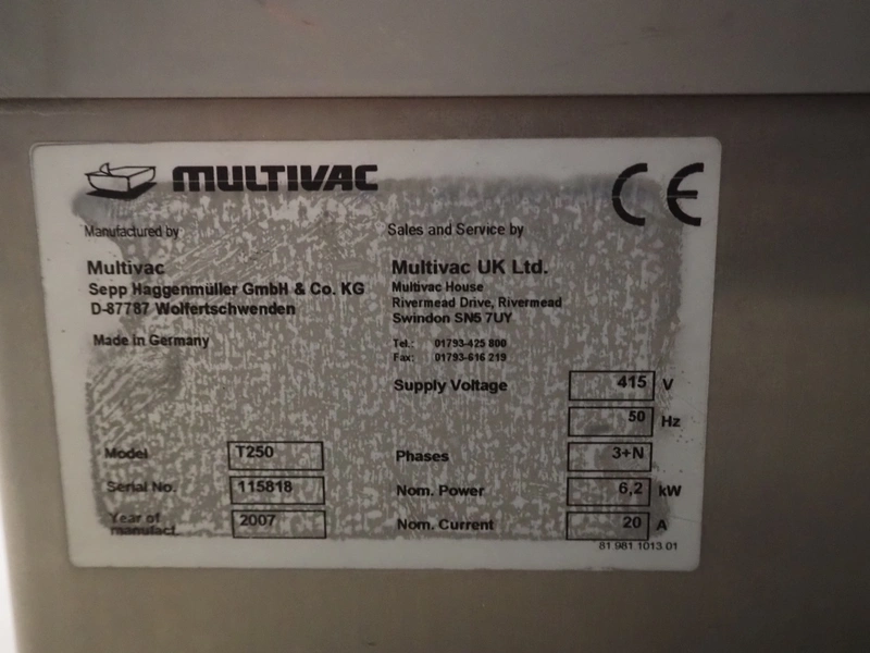 Multivac mobile traysealer, type: T250, serial number: 115818, year of construction: 2007, 415 V, 3 Ph, 50 Hz, 20 A, 6.2 kW, Busch vacuum pump, type: RA 0100 E 5Z1, number: 070020406, year of construction: 2007, capacity: 100 m³ per hour, dimensions dye: 350 mm x 245 mm, total dimensions: 1330 mm x 800 mm x 1650 mm. Including additional dye, dimensions dye: (2x) 275 mm x 170 mm.