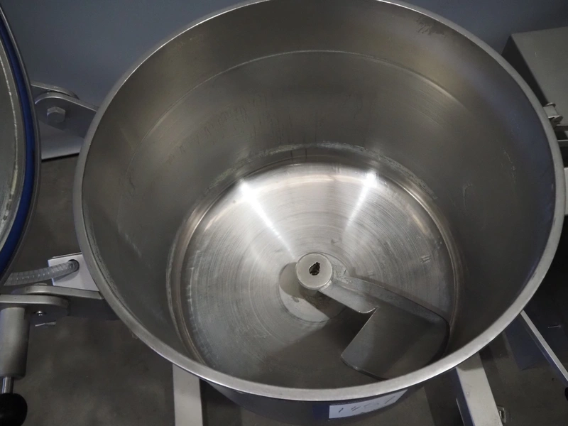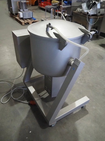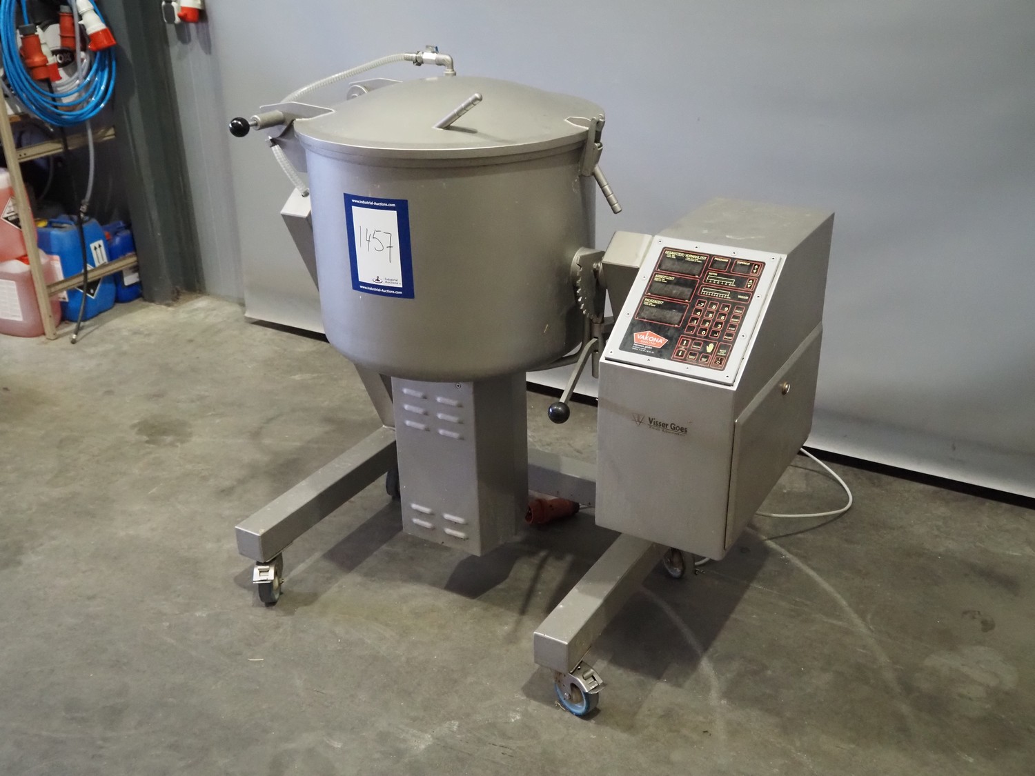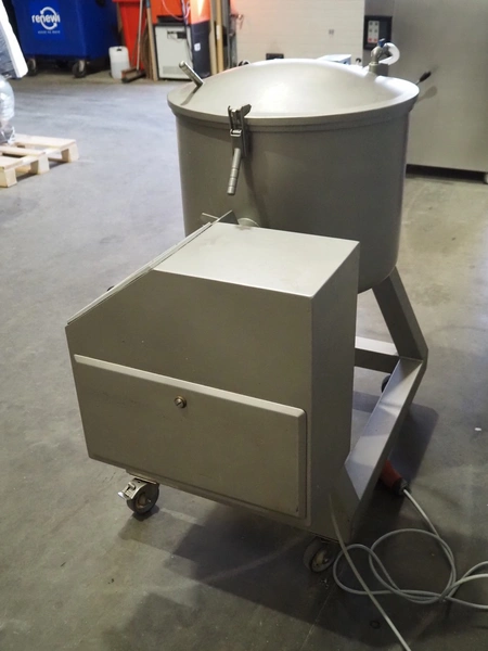 Vakona GmbH vacuum tumbler, type: 125 IPMB1, serial number: 7016, year of construction: 1997, 220/380 V, 50 Hz, 20/115A, 0.37 kW, 17.5 RPM, capacity: 125 liter, inside dimensions: Ø 590 mm x 500 mm, with Busch vacuum pump, type: RB 0010 D OZO, total dimensions: 1100 mm x 700 mm x 1250 mm.