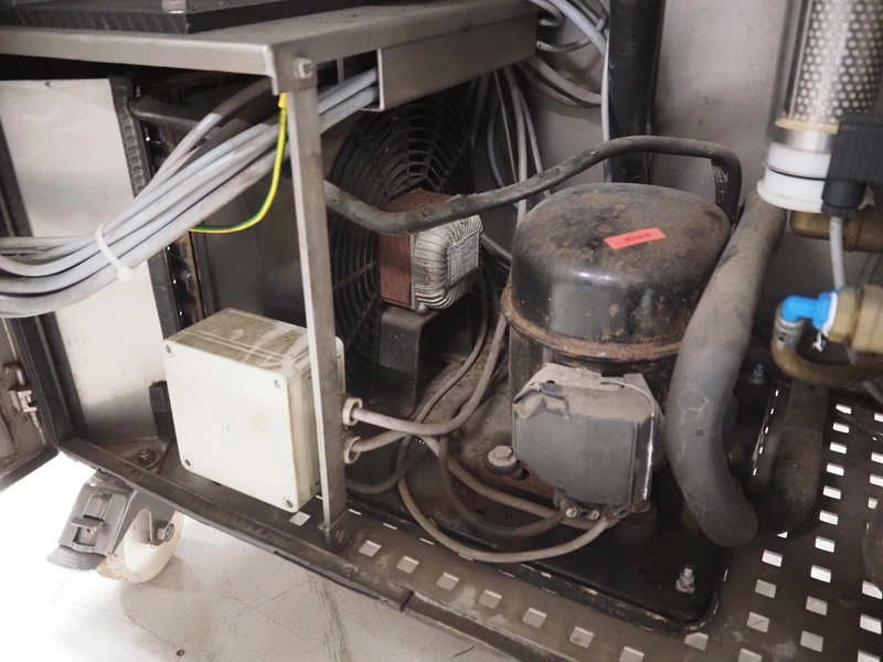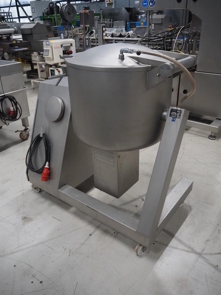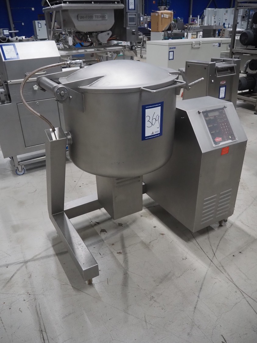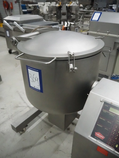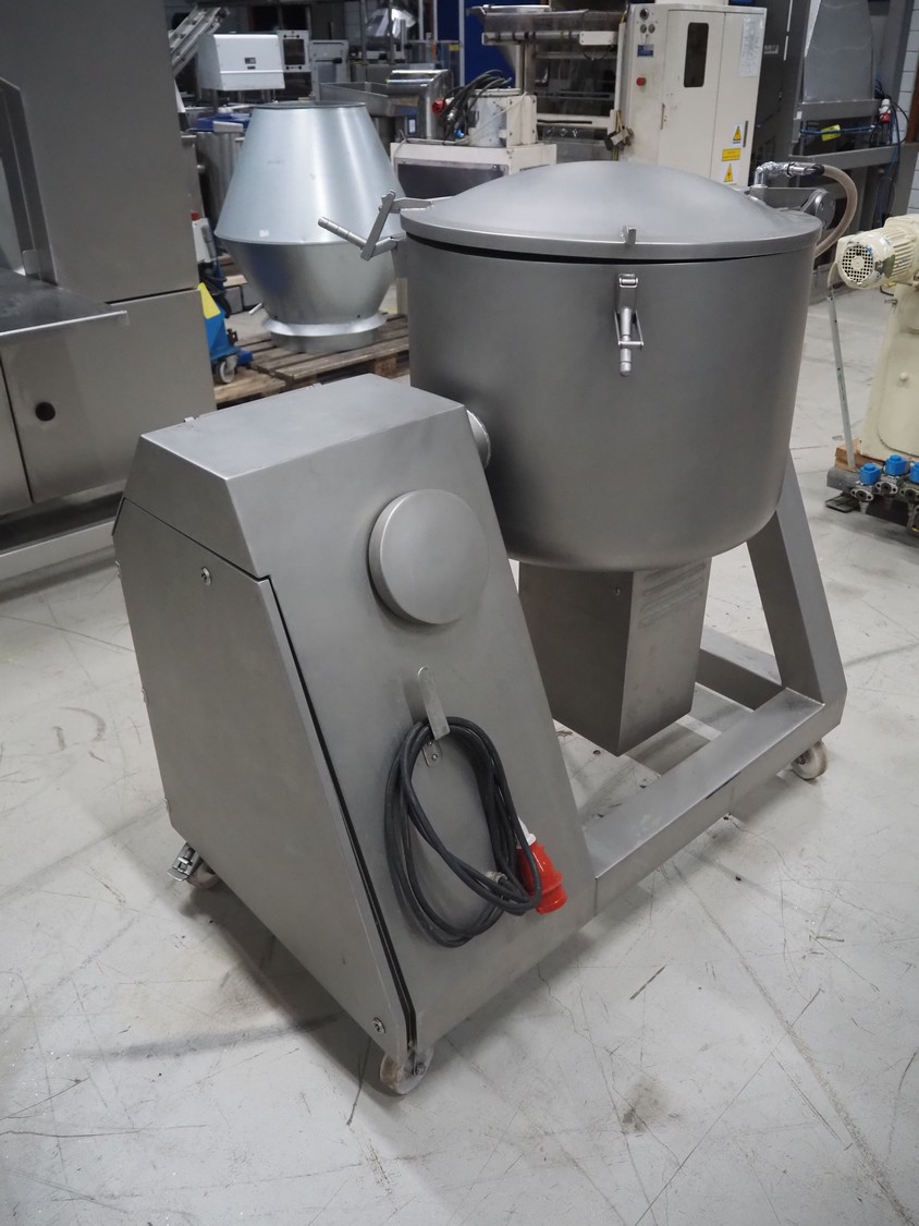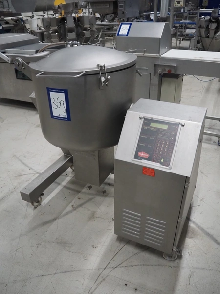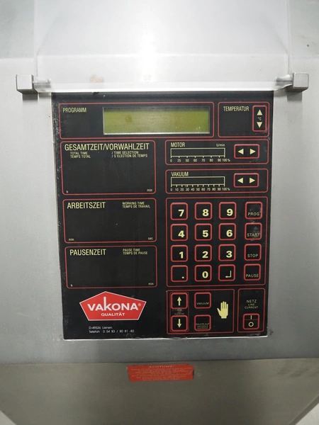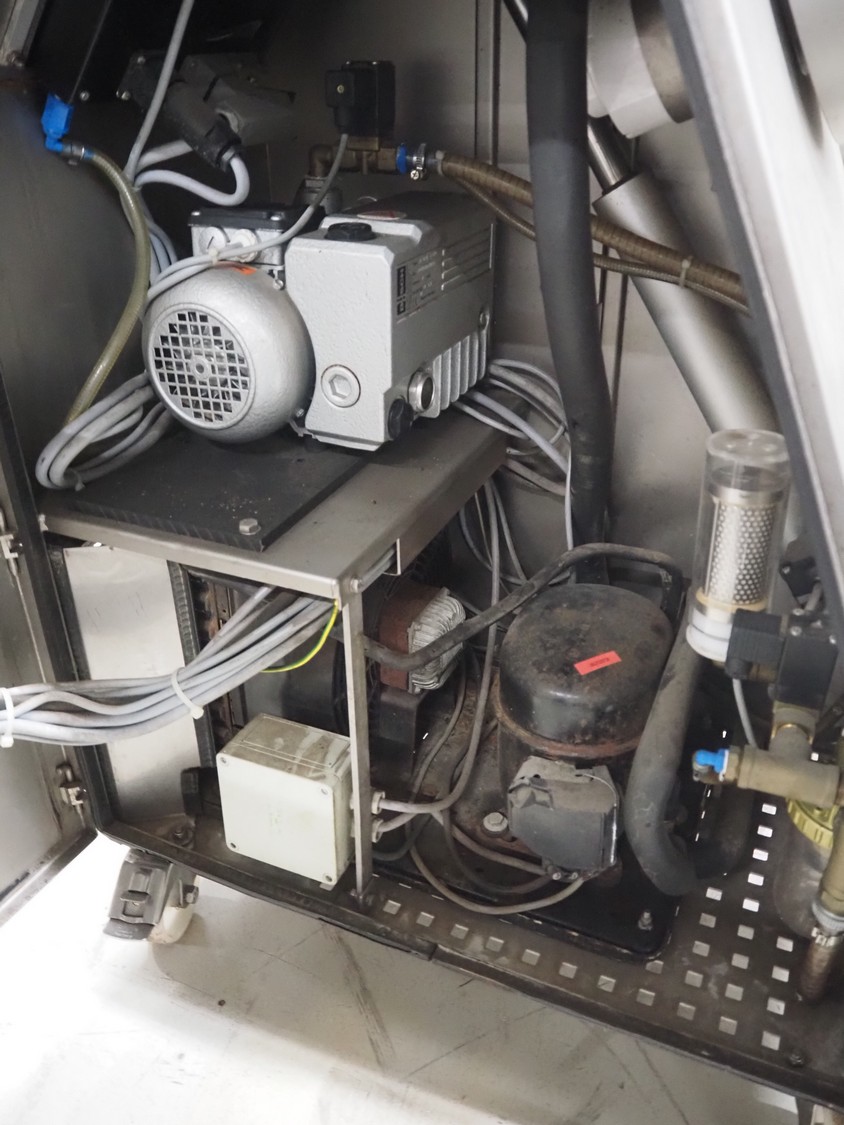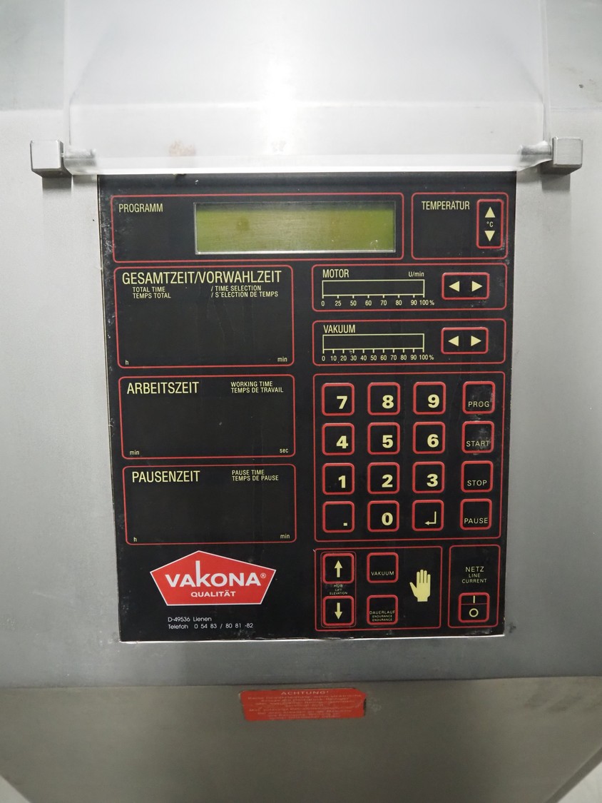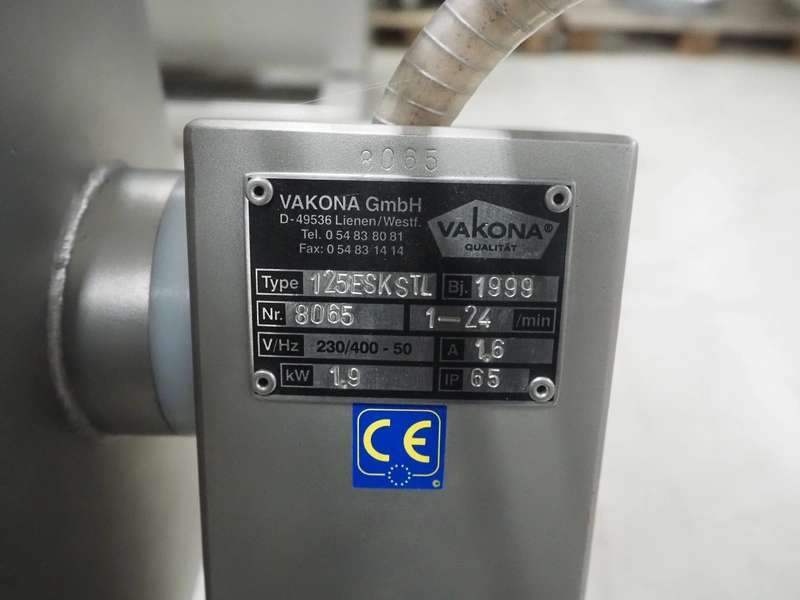 Vakona GmbH cooled vacuum tumbler, type: 125ESKSTL, number: 8065, year of construction: 1999, 230/400 V, 50 Hz, 1.6 A, 1.9 kW, volume: 125 liter, Busch vacuum pump, type: RB 0010 D OZO, year of construction: 1998, capacity: 10 m³ per hour, total dimensions: 1330 mm x 600 mm x 1330 mm.