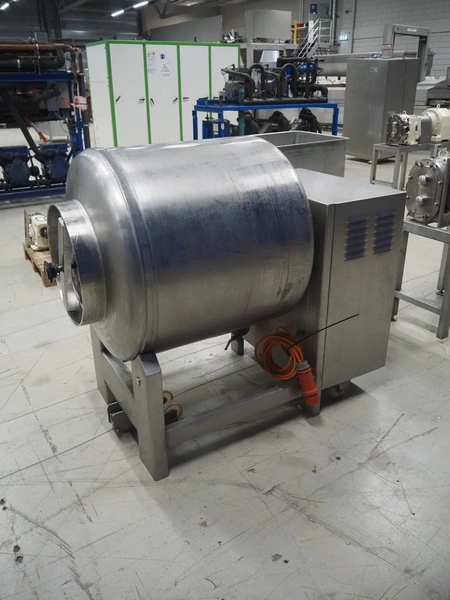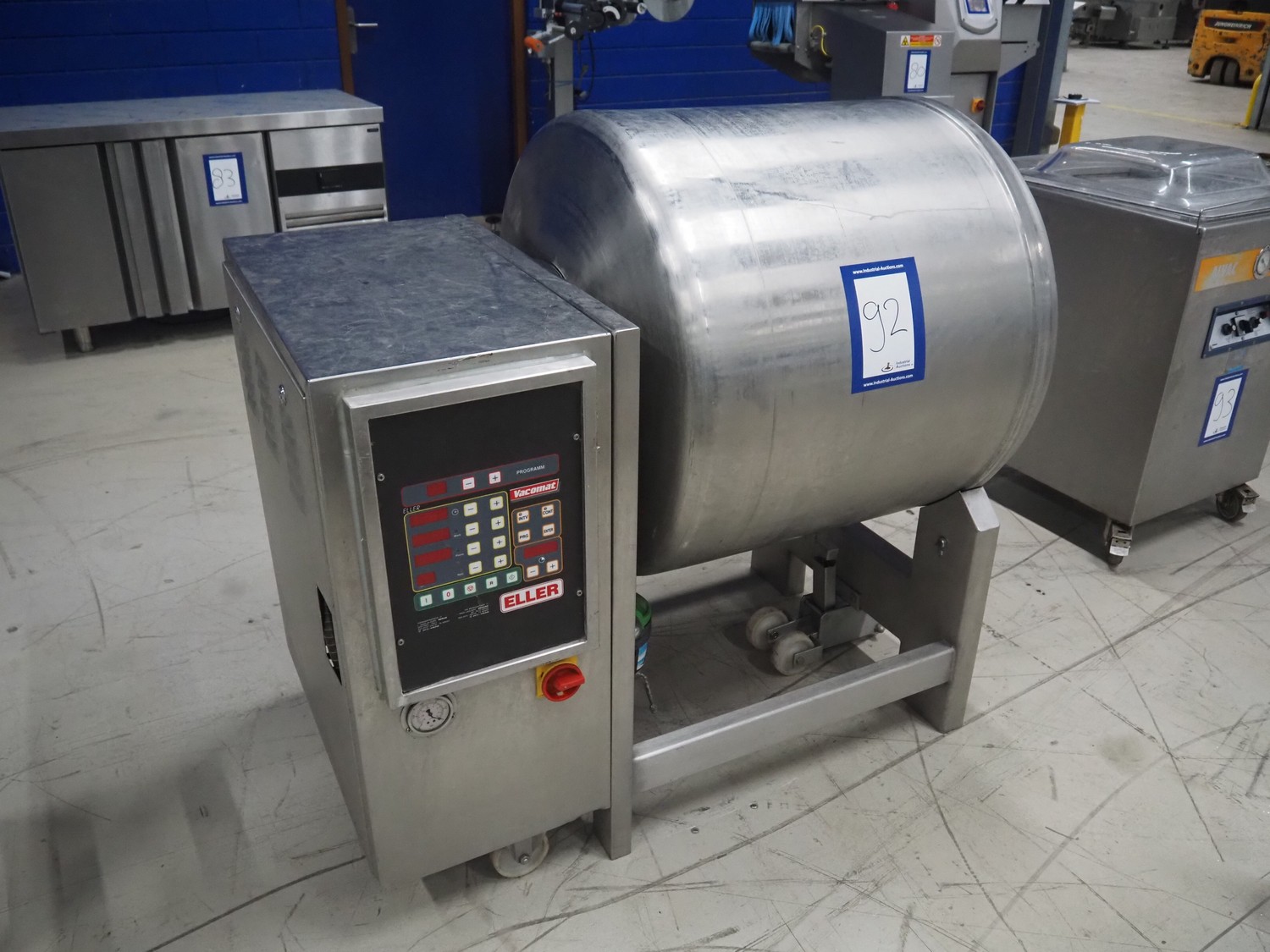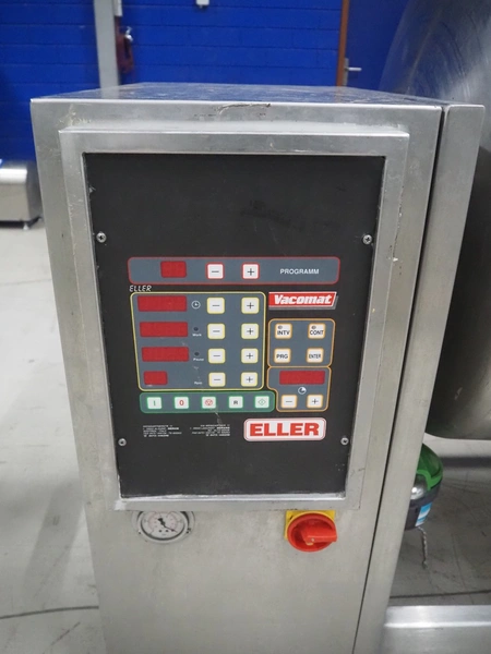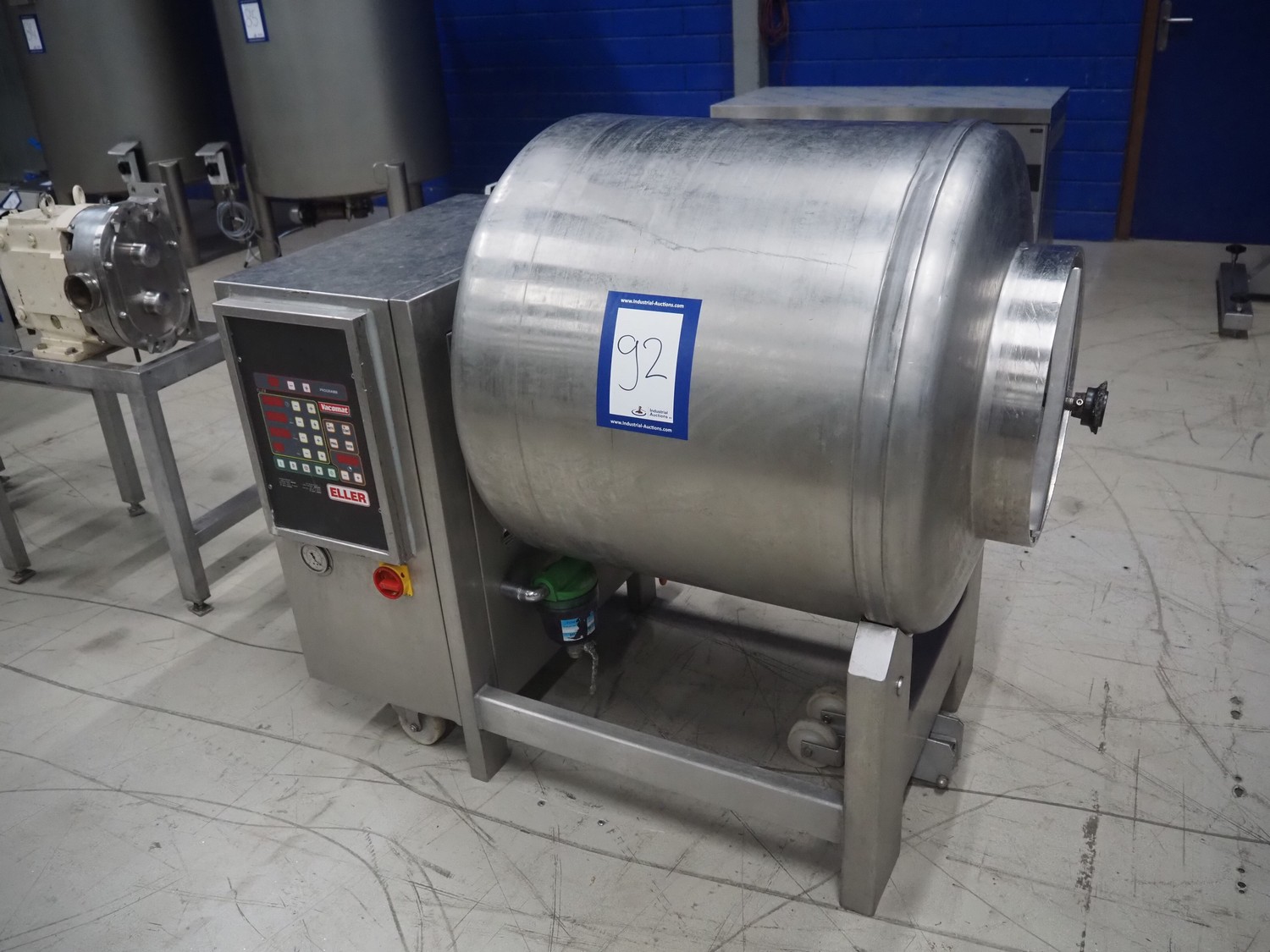 Eller mobile vacuum tumbler, model: Vacomat, inside dimensions tub: Ø 800 mm x 750 mm, Busch vacuum pump, type: 016-118, number: 407436, capacity: 16 m³ per hour, total dimensions: 1450 mm x 800 mm x 1200 mm.