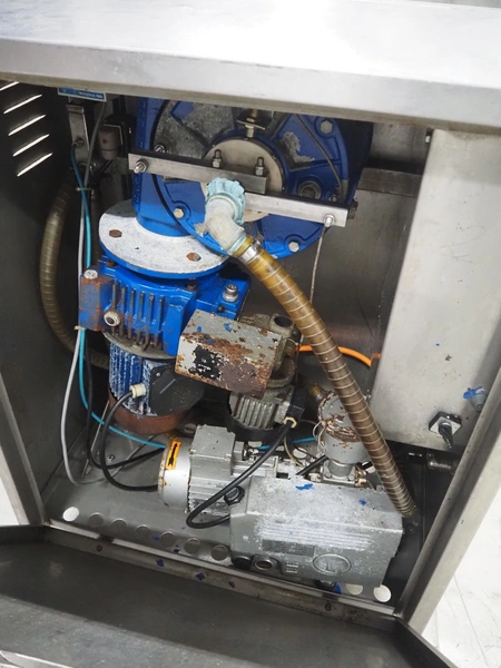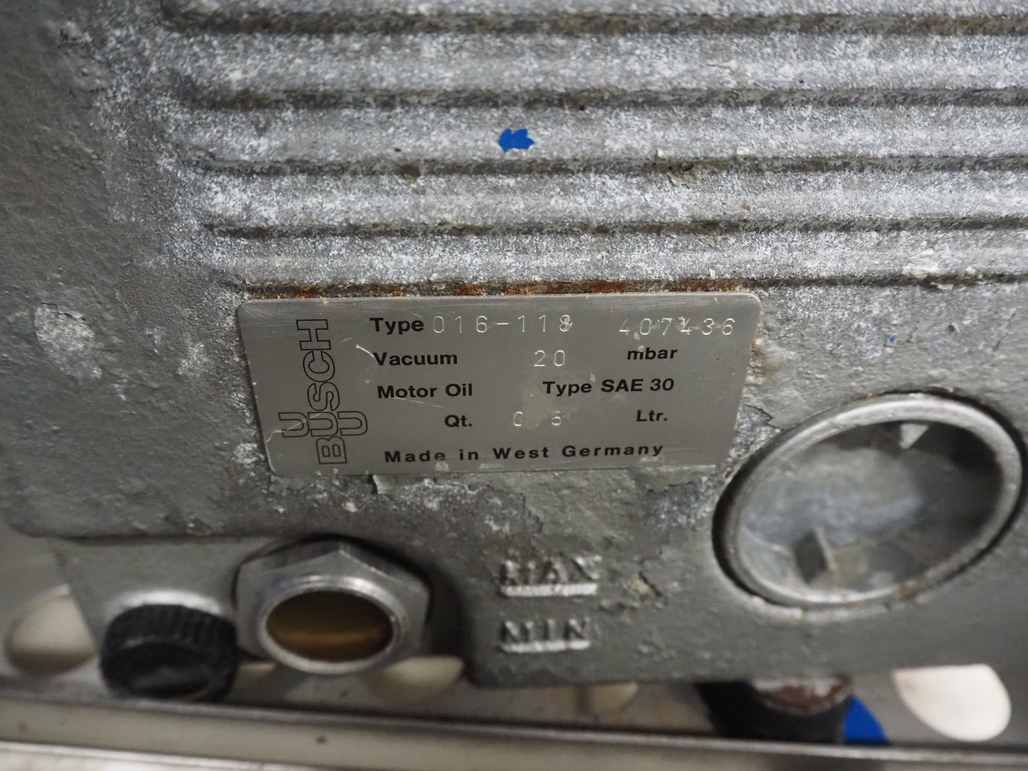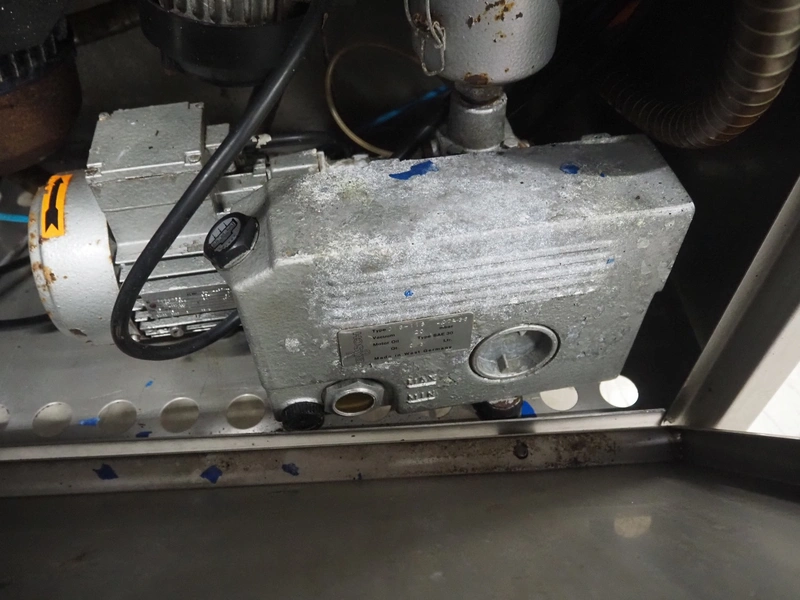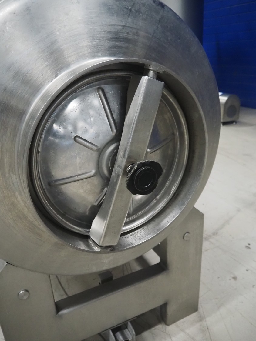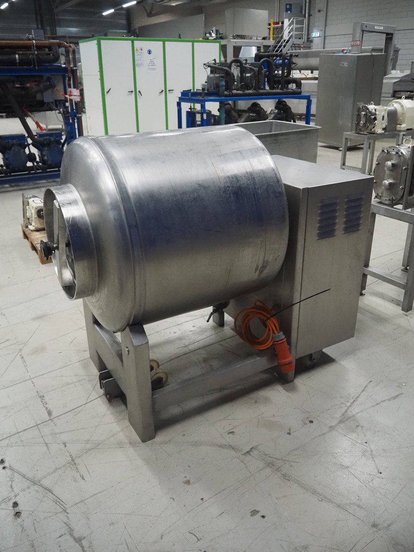Eller mobile vacuum tumbler, model: Vacomat, inside dimensions tub: Ø 800 mm x 750 mm, Busch vacuum pump, type: 016-118, number: 407436, capacity: 16 m³ per hour, total dimensions: 1450 mm x 800 mm x 1200 mm.