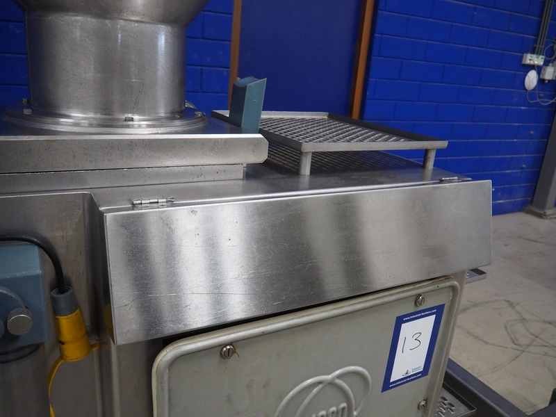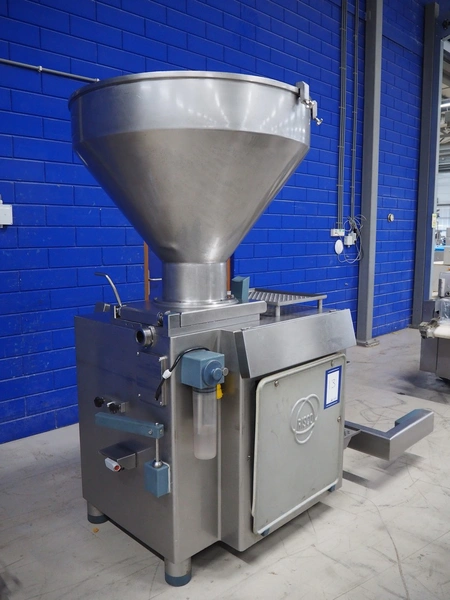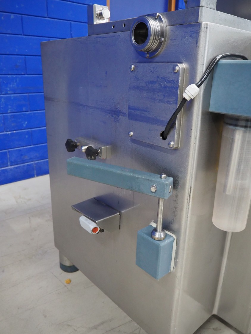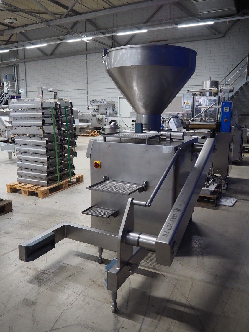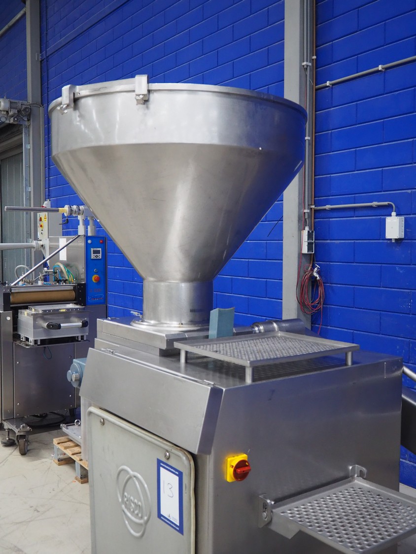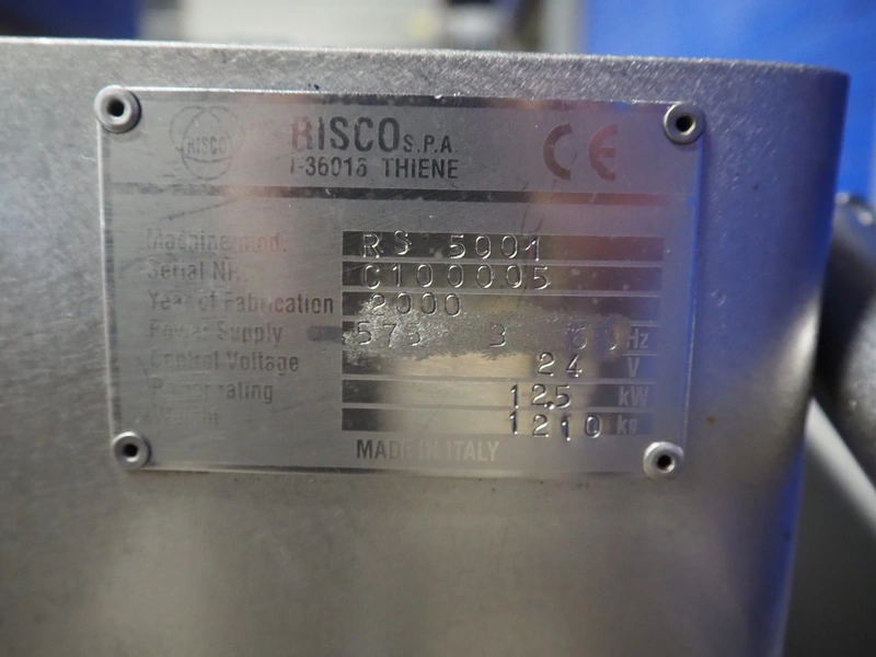 Risco S.p.a. vacuum filling machine with lifter for 200 liter meat bins, model: RS 5001, serial number: C100005, year of construction: 2000, 575 V, 3 Ph, 60 Hz, 12.5 kW, weight: 1210 kg, dimensions: 2100 mm x 1200 mm x 2070 mm. Without vacuum pump.