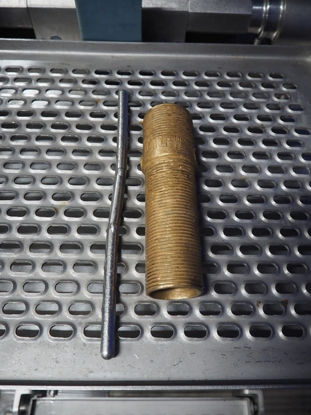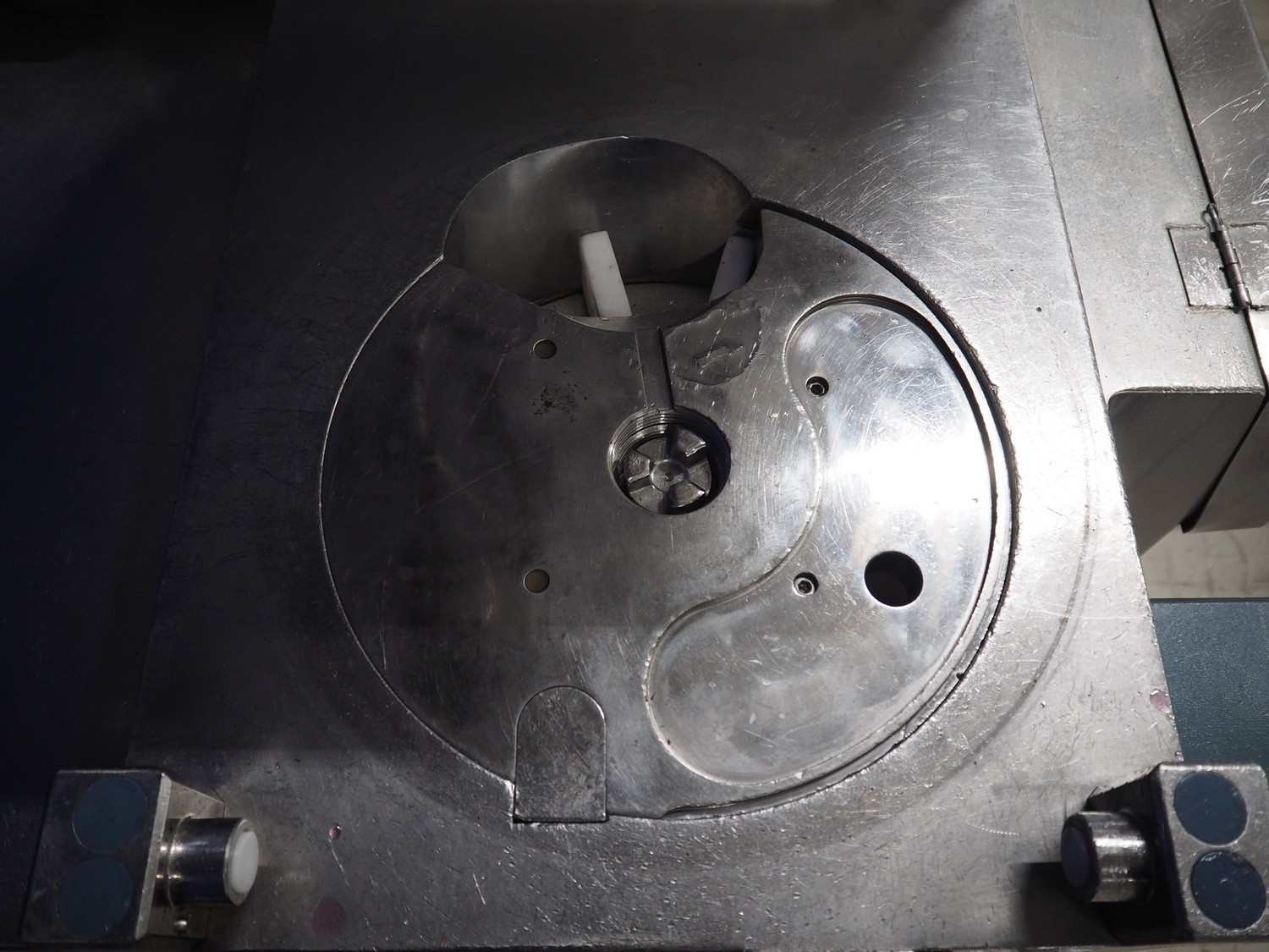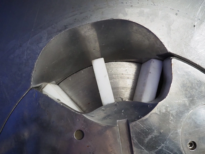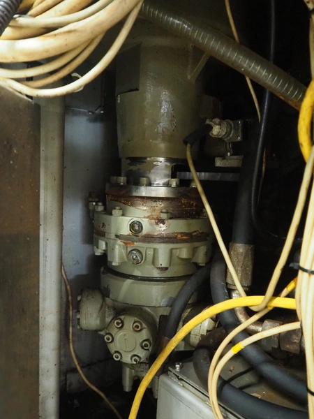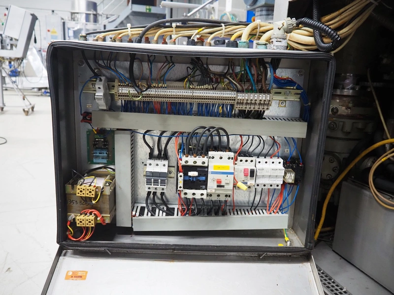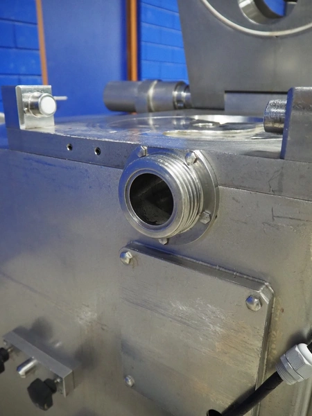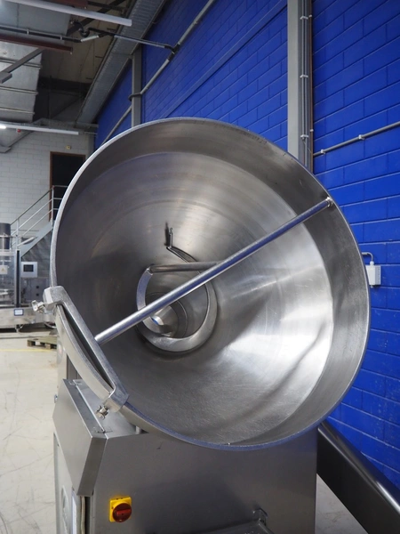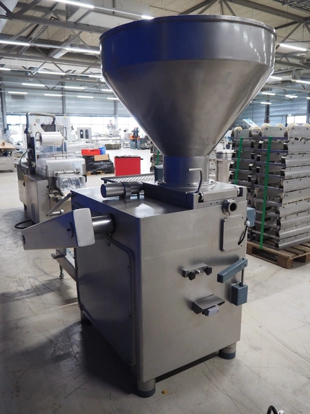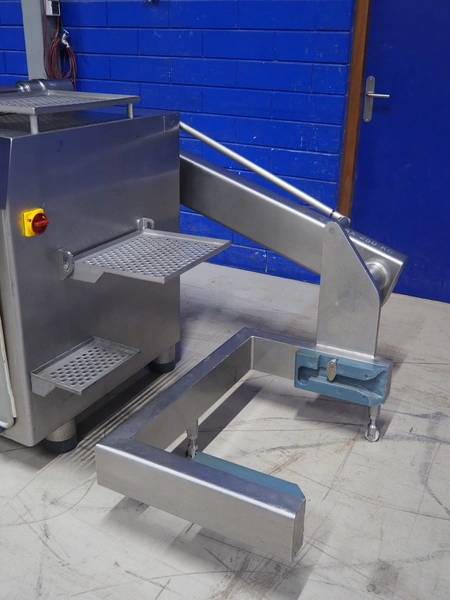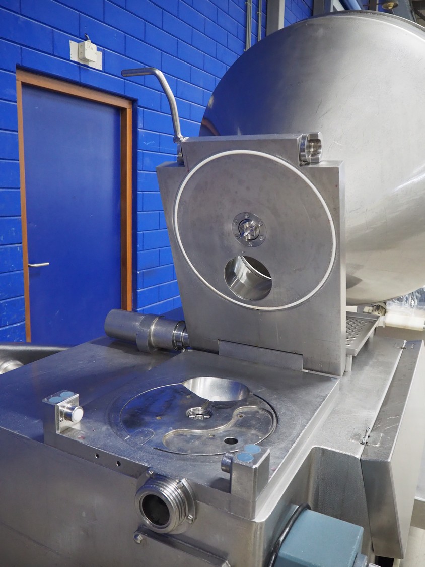 Risco S.p.a. vacuum filling machine with lifter for 200 liter meat bins, model: RS 5001, serial number: C100005, year of construction: 2000, 575 V, 3 Ph, 60 Hz, 12.5 kW, weight: 1210 kg, dimensions: 2100 mm x 1200 mm x 2070 mm. Without vacuum pump.