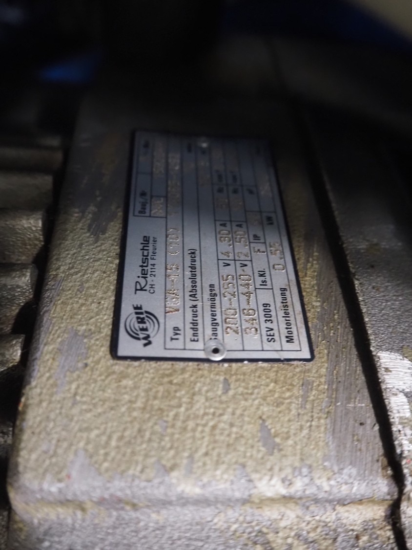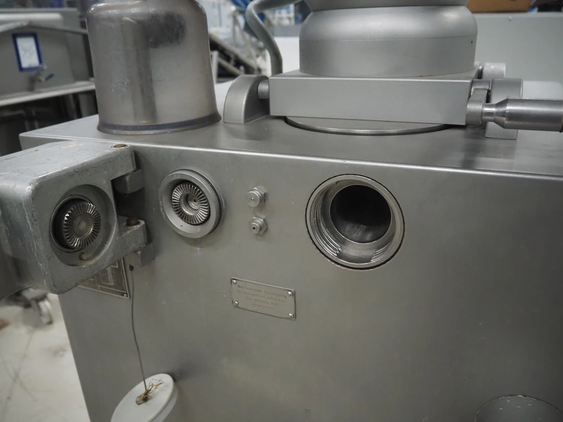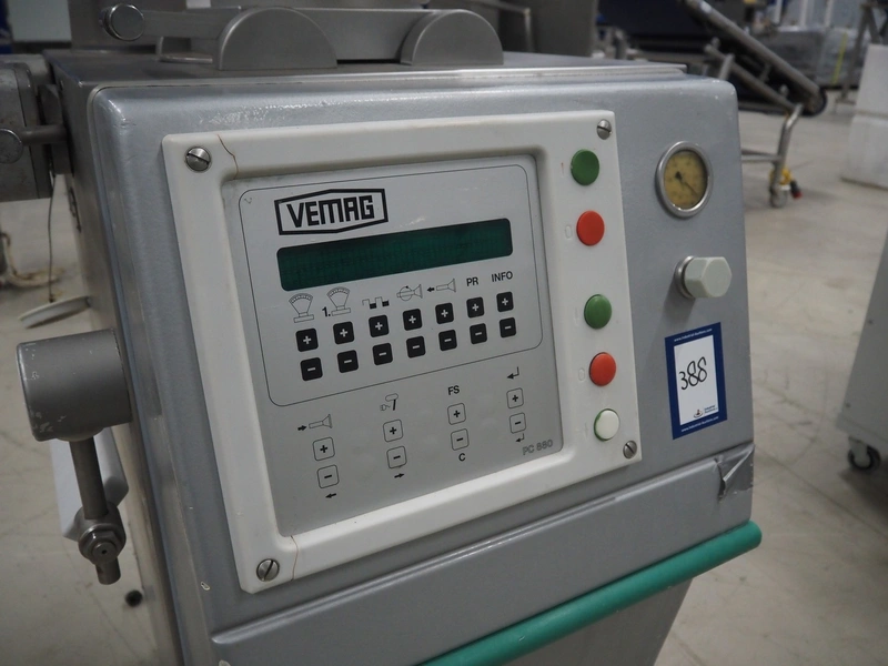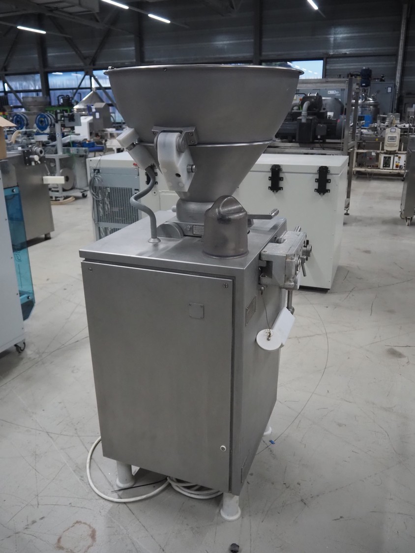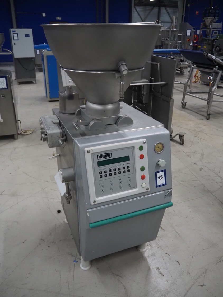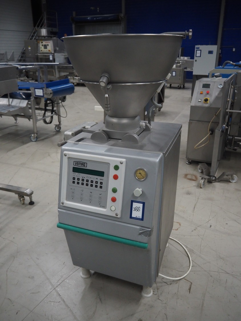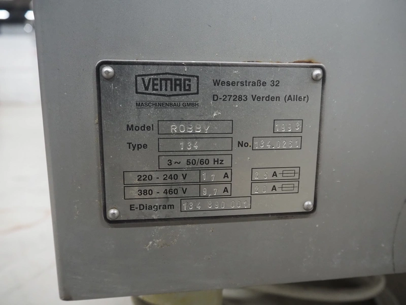 Vemag vacuum filling machine, model: Robby, type: 134, number: 134.0261, year of construction: 1993, 220-240/380-460 V, 3 Ph, 50/60 Hz, 25/20 A, dimensions: 950 mm x 900 mm x 1700 mm.