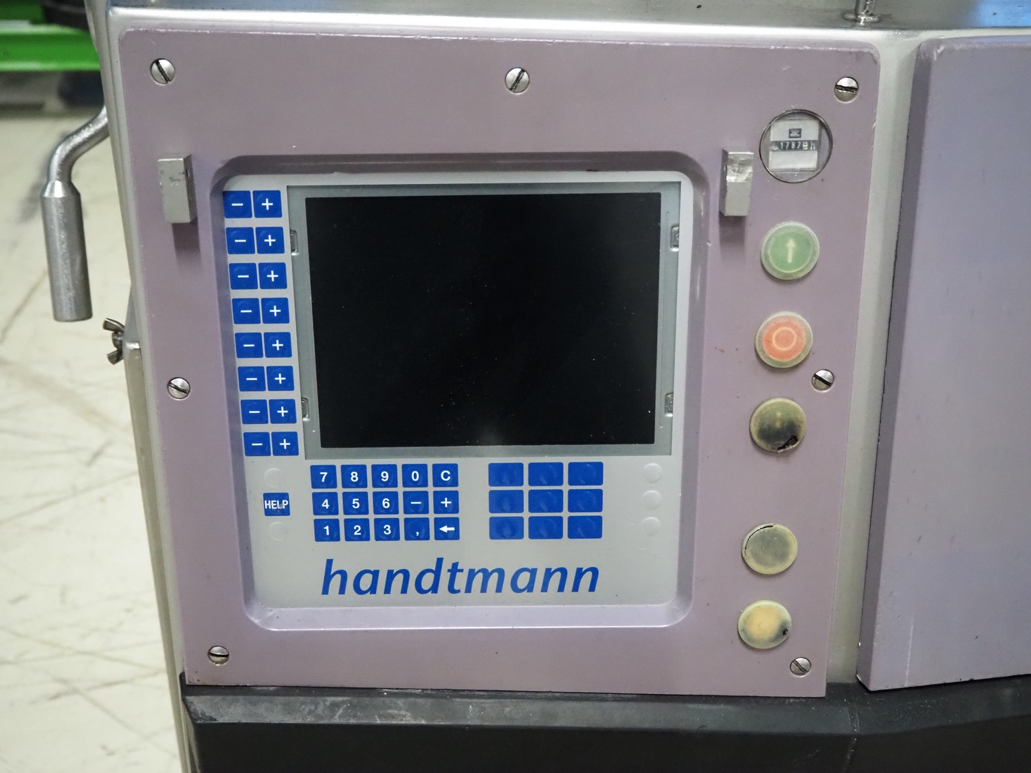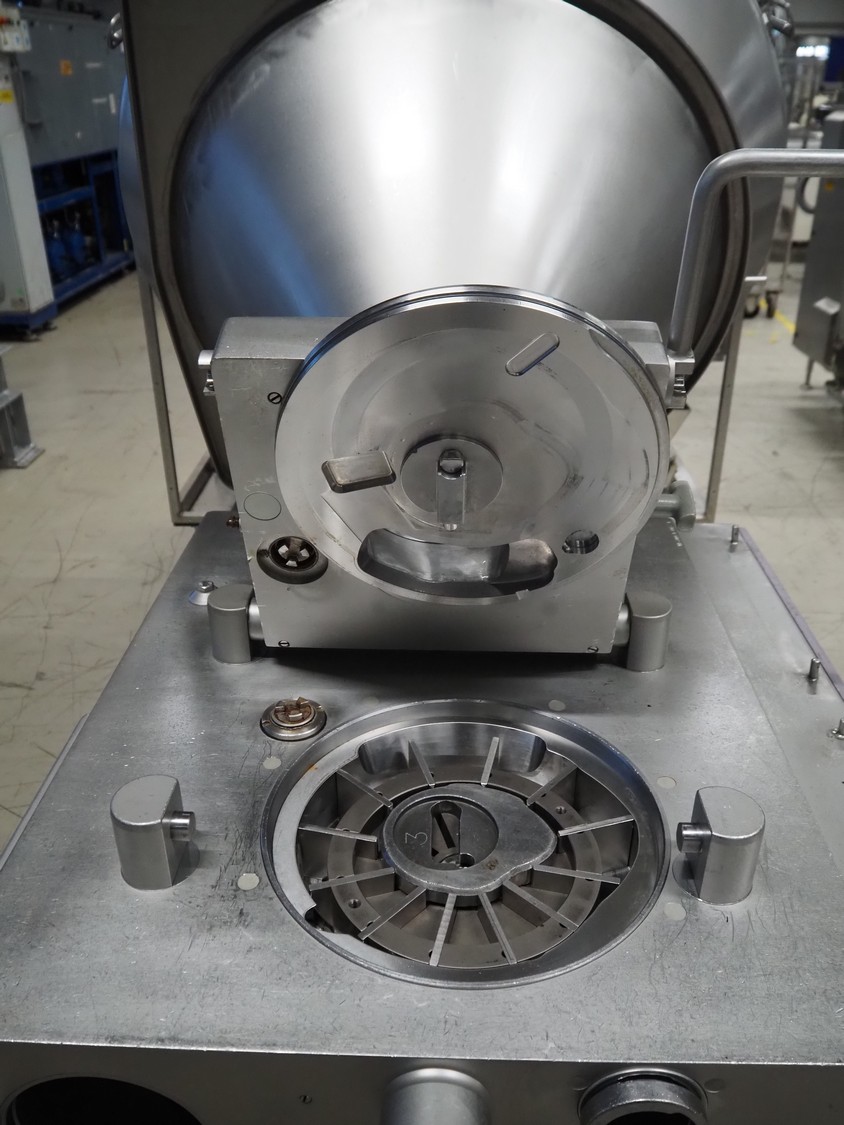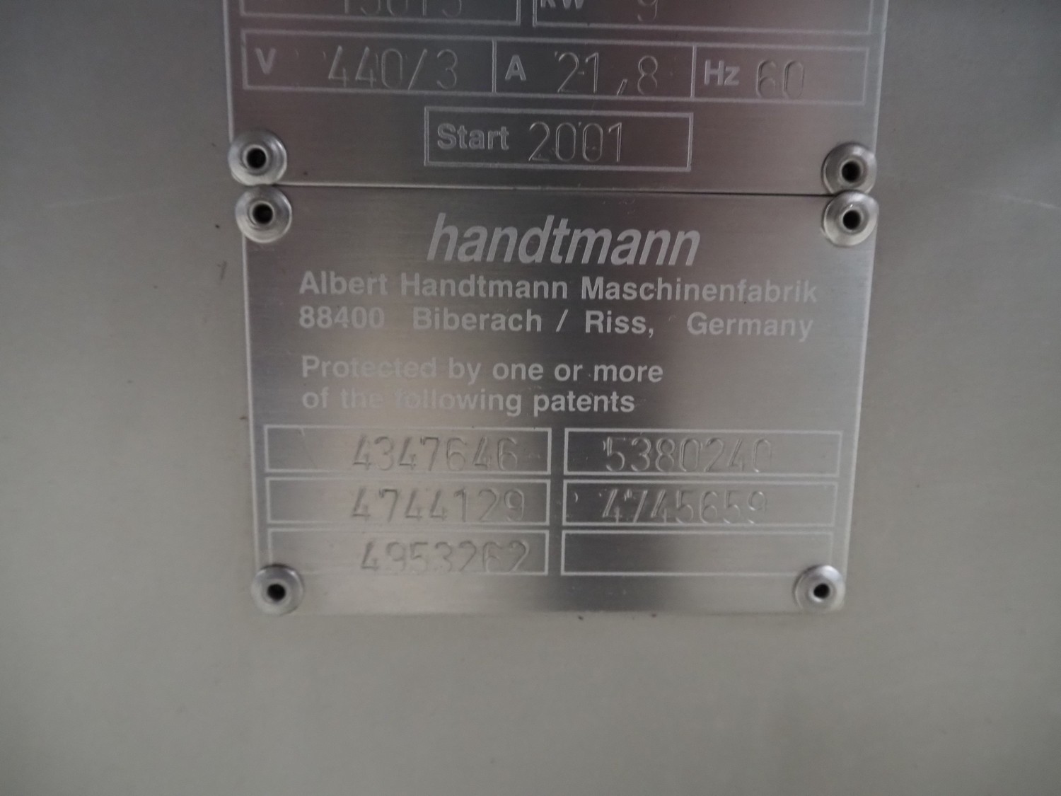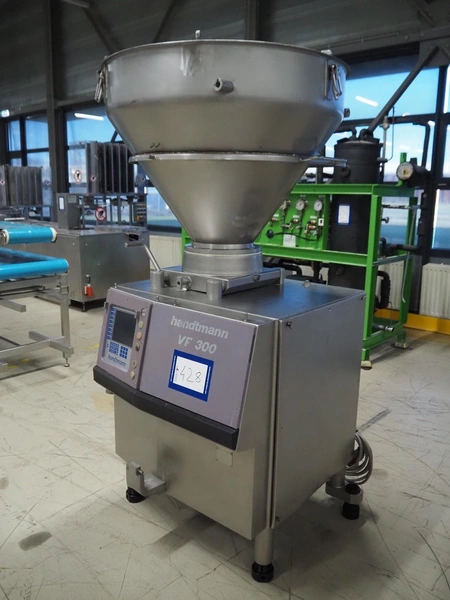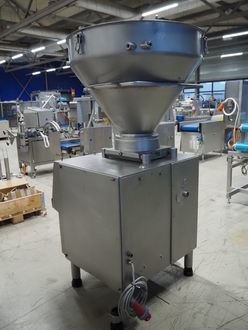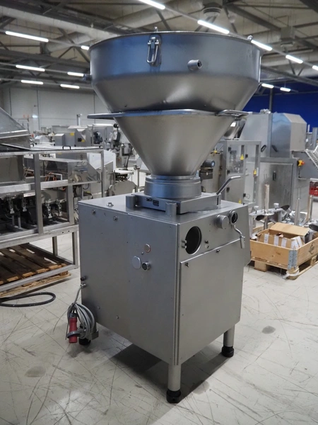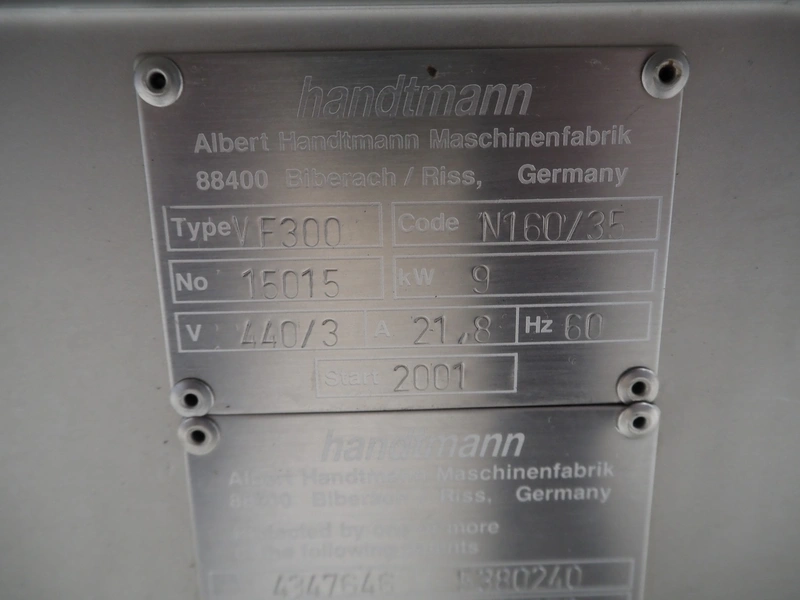 Handtmann vacuum filling machine, type: VF300, number: 15015, year of construction: 2001, 440 V, 3 Ph, 60 Hz, 21.8 A, 9 kW, dimensions: 950 mm x 920 mm x 2020 mm.