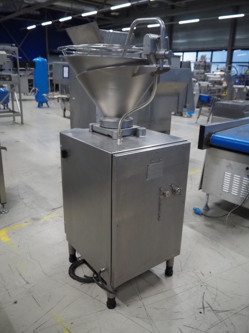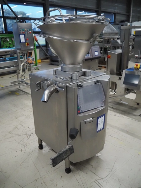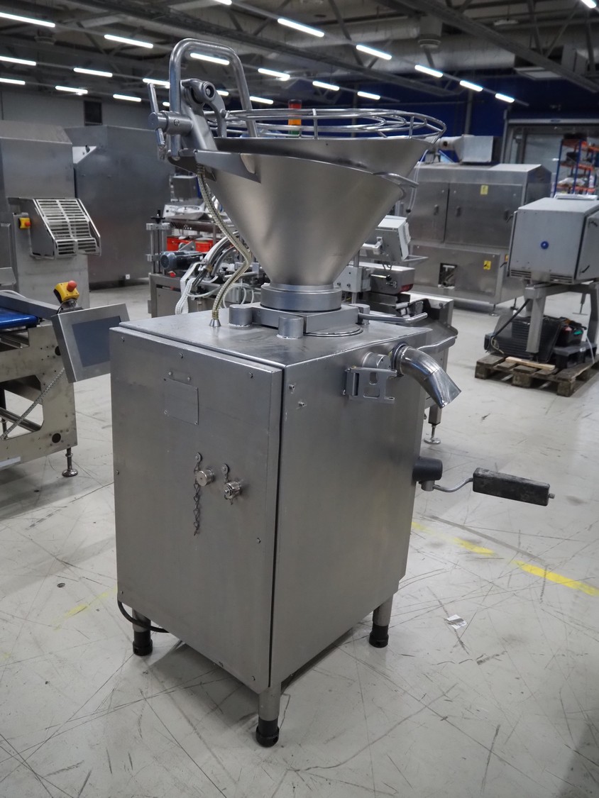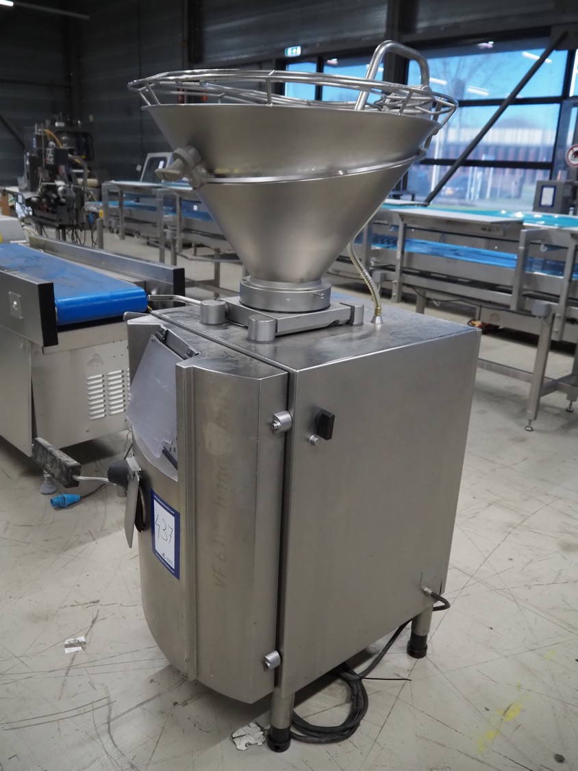 Handtmann vacuum filling machine, type: VF610, number: 20455S, year of construction: 2005, 420 V, 3 Ph, 50 Hz, 5.1 A, 3.5 kW, dimensions: 800 mm x 850 mm x 1750 mm. Missing vacuum pump.