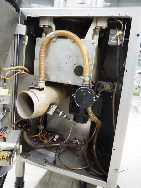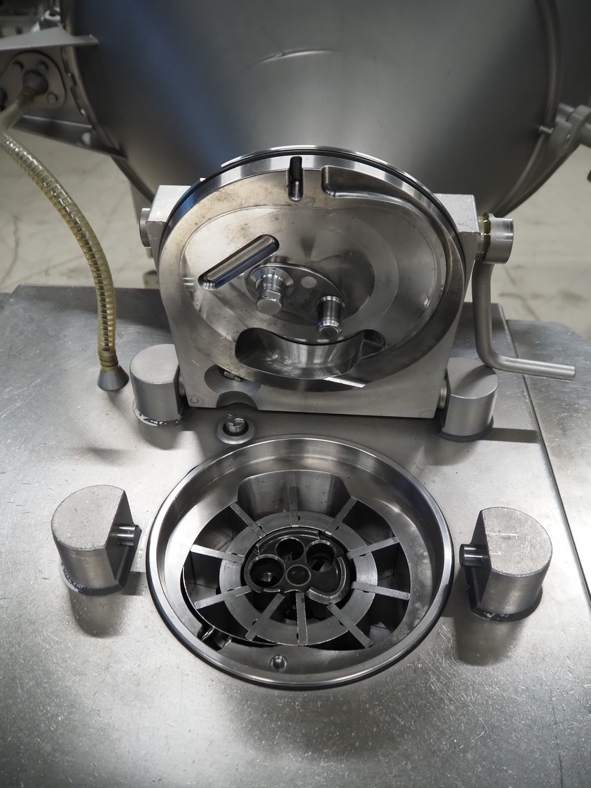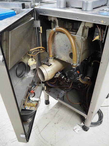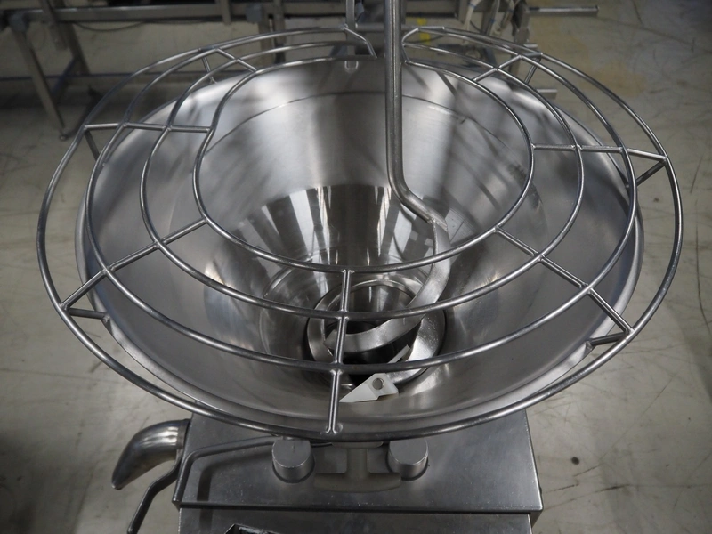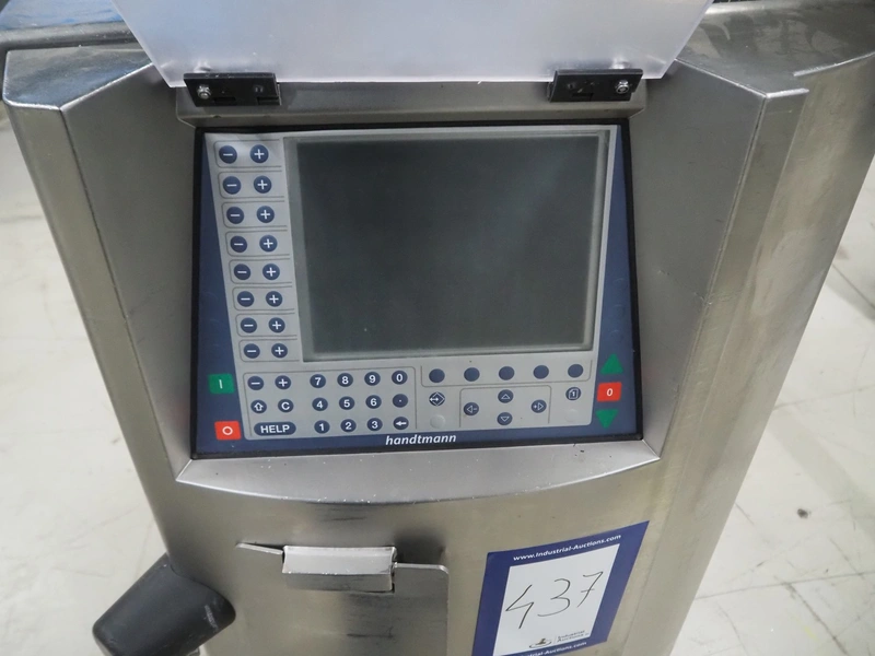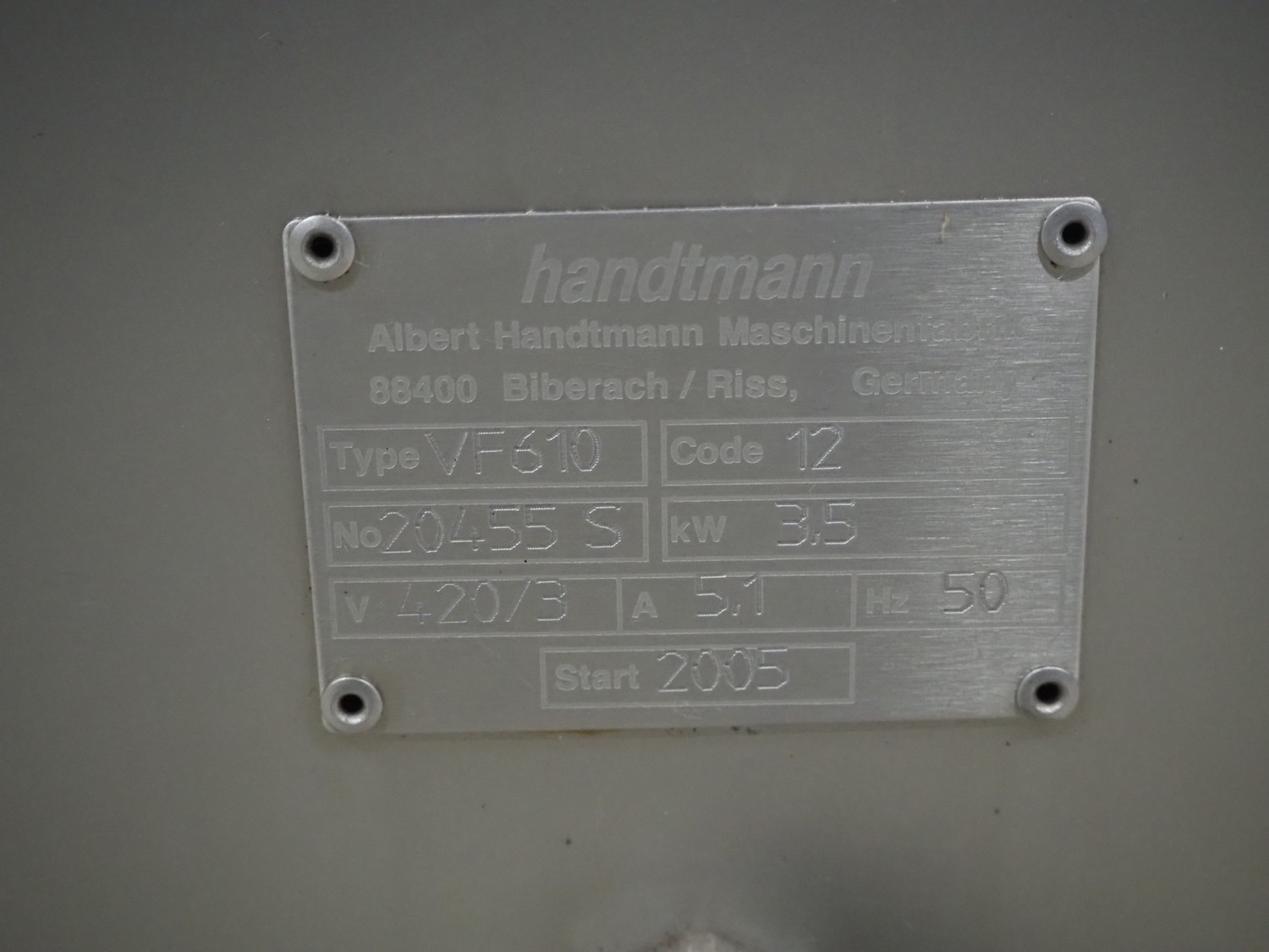 Handtmann vacuum filling machine, type: VF610, number: 20455S, year of construction: 2005, 420 V, 3 Ph, 50 Hz, 5.1 A, 3.5 kW, dimensions: 800 mm x 850 mm x 1750 mm. Missing vacuum pump.