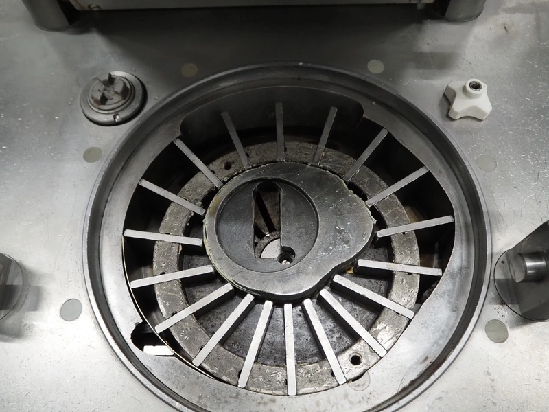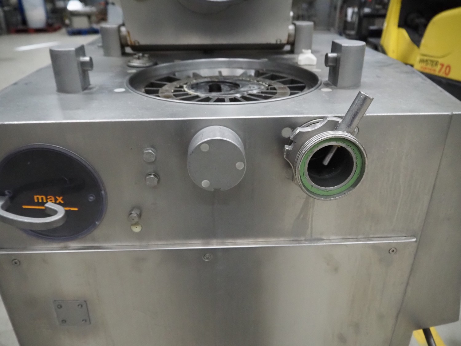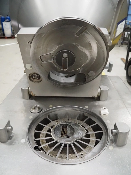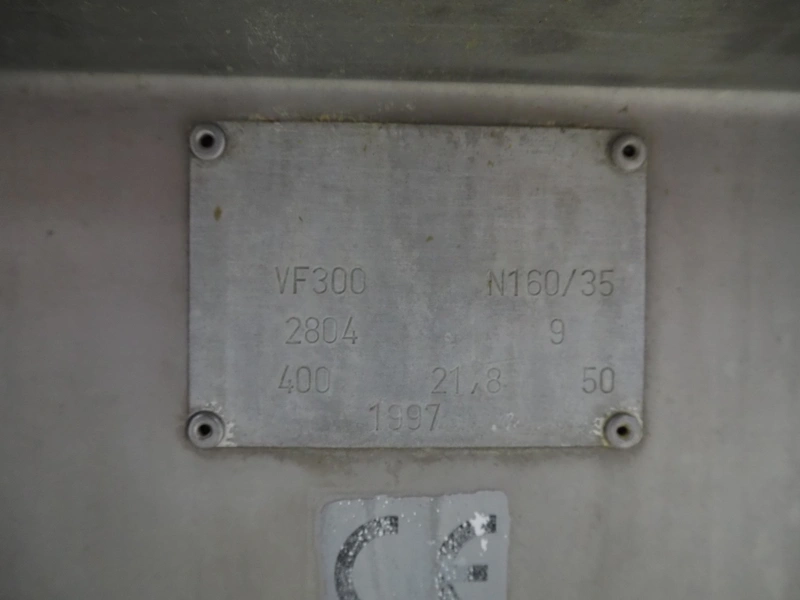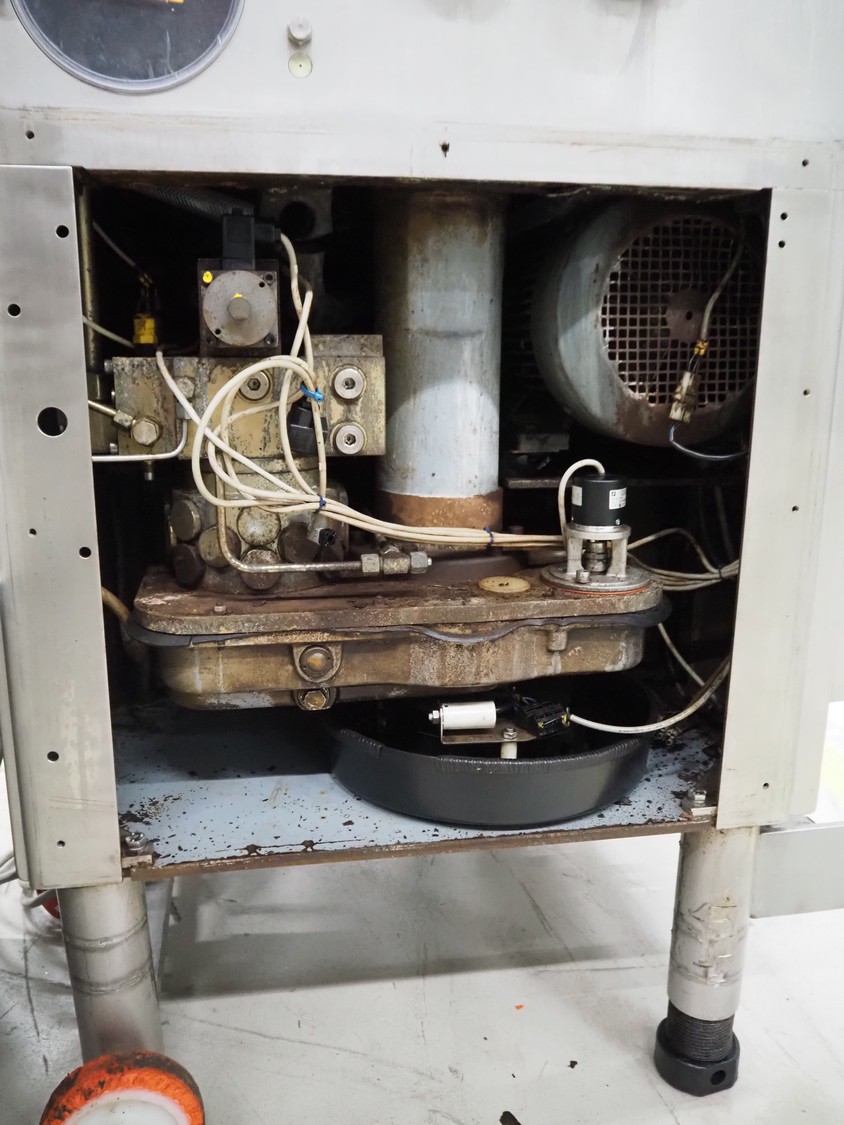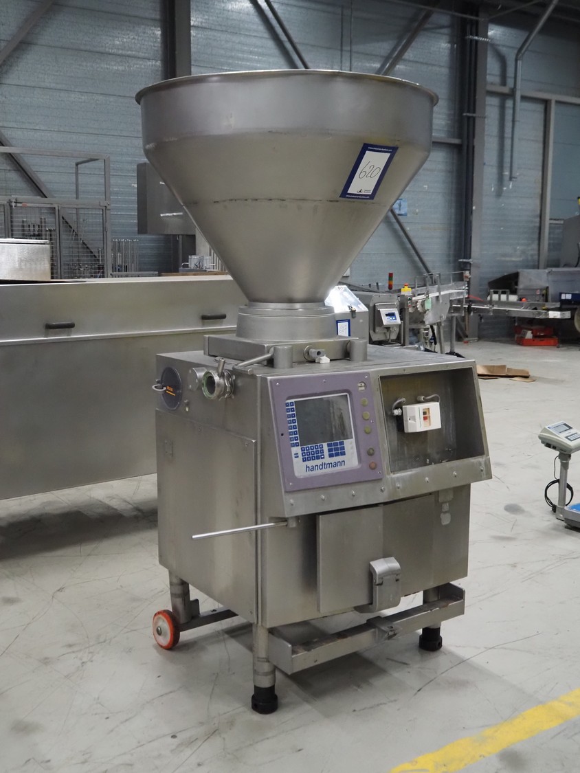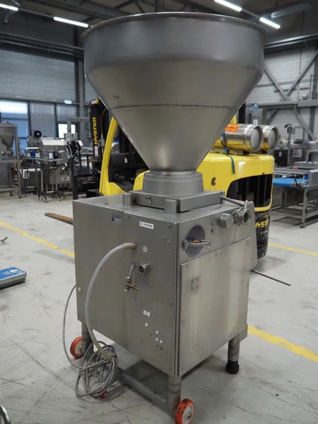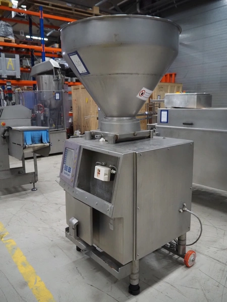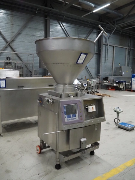 Handtmann mobile vacuum filling machine, type: VF300, number: 2804, year of construction: 1997, 400 V, 50 Hz, 21.8 A, 9 kW, dimensions: 1150 mm x 950 mm x 2050 mm. Incomplete.