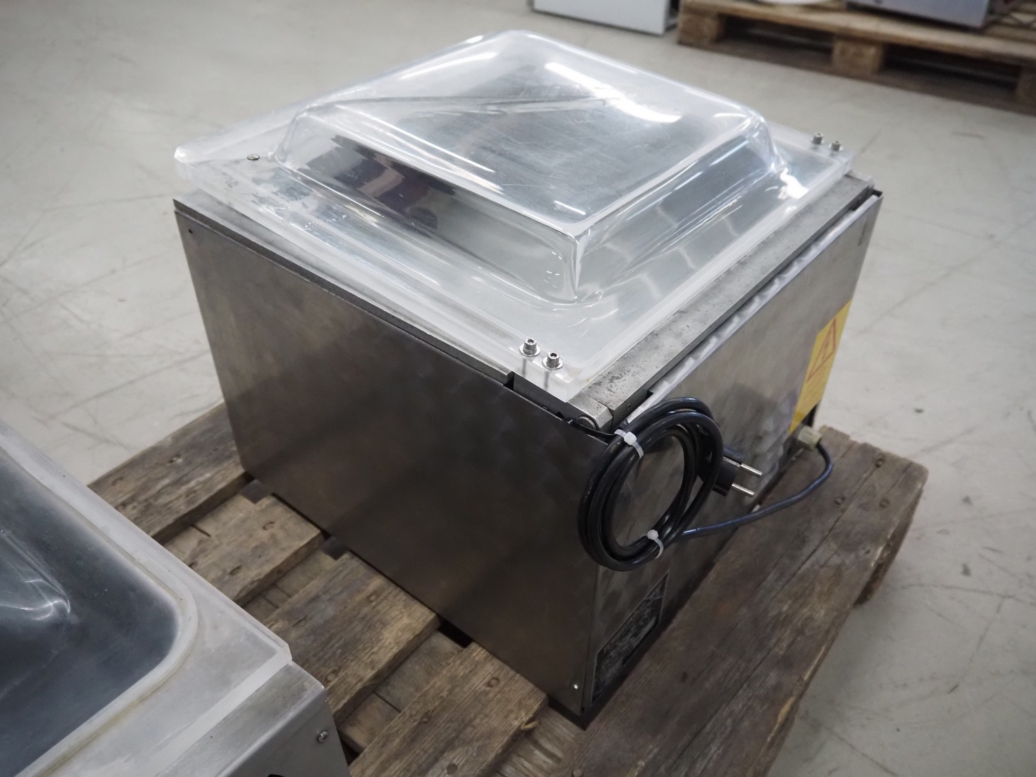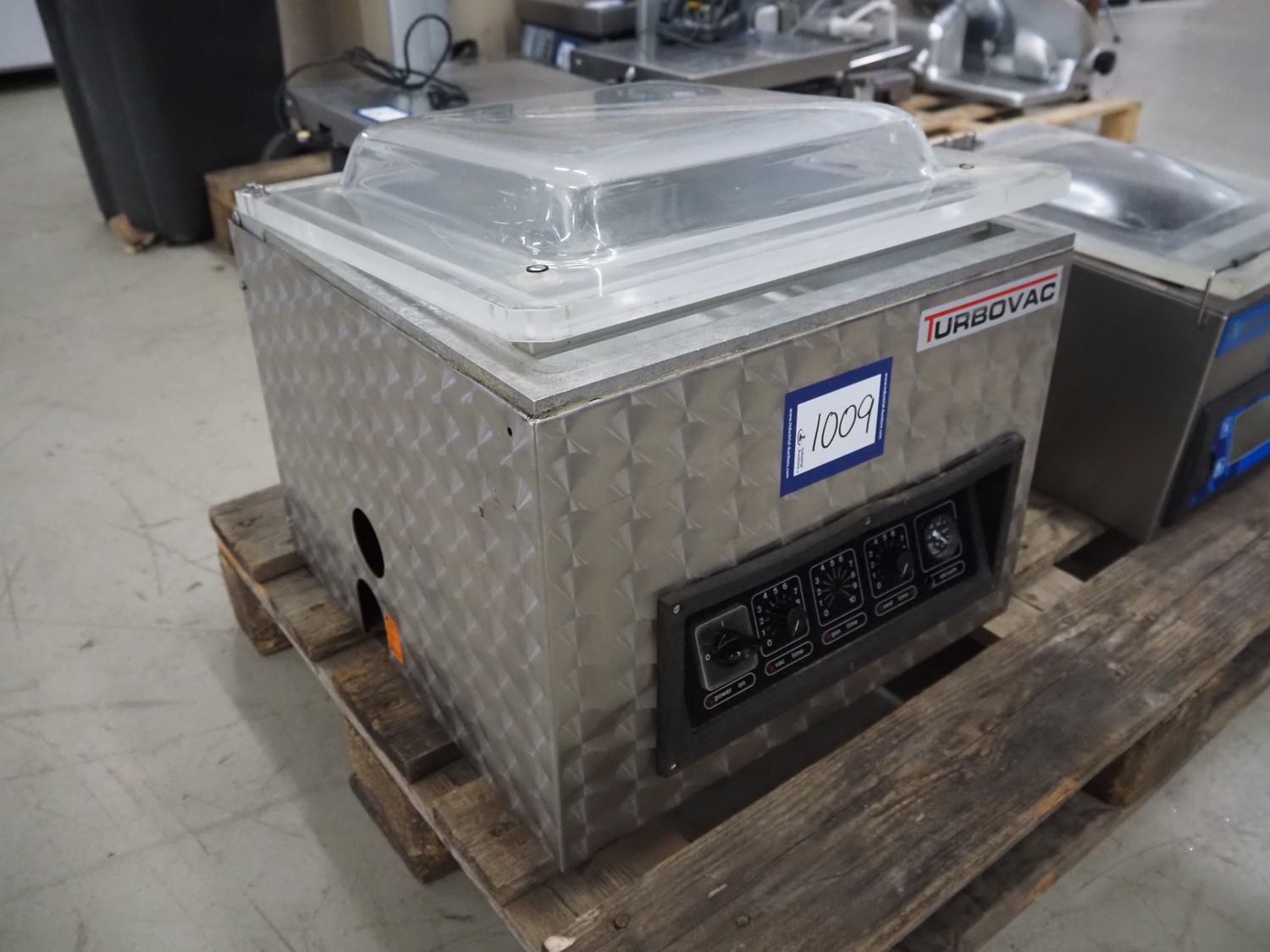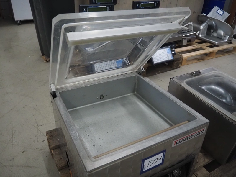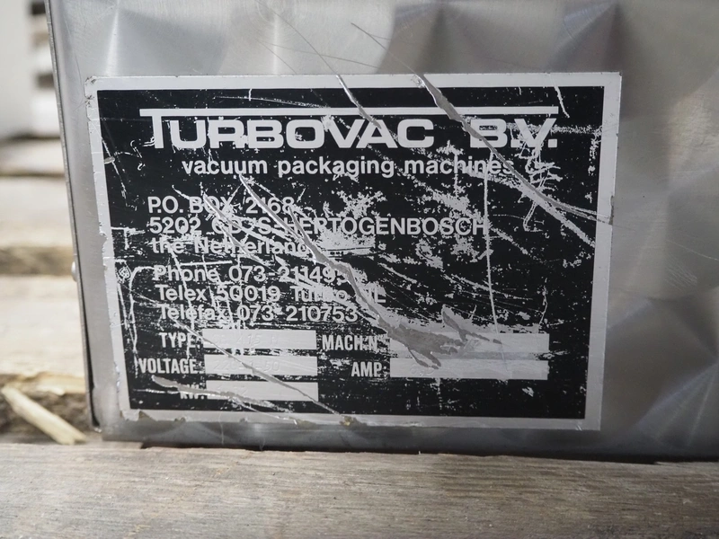 Turbovac vacuum machine, type: SB 415 H, 220 V, 1 Ph, 50 Hz, seal length: 410 mm, chamber dimensions: 415 mm x 380 mm, total dimensions: 530 mm x 480 mm x 470 mm.