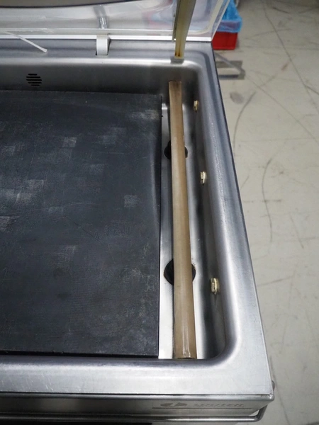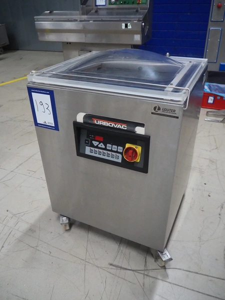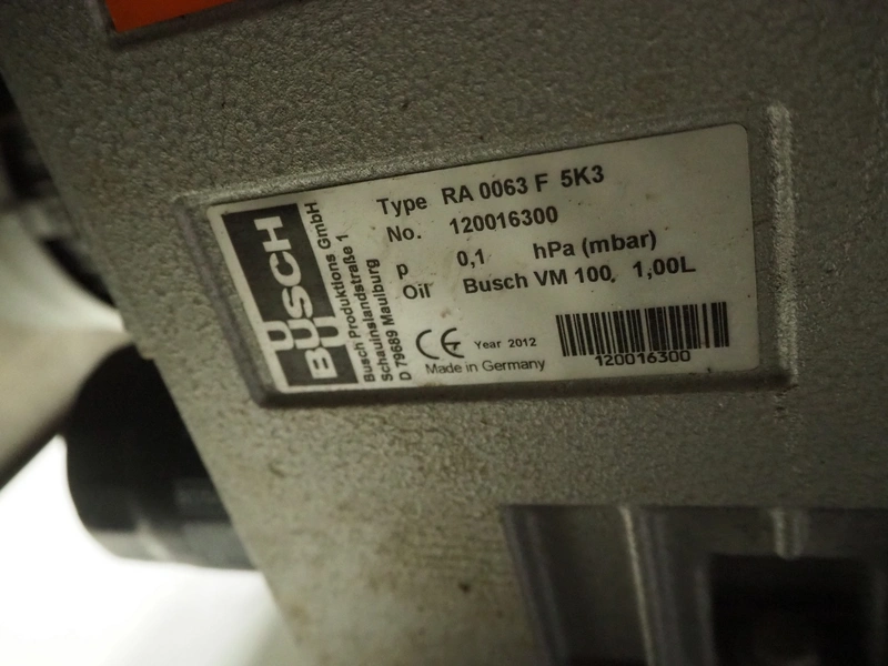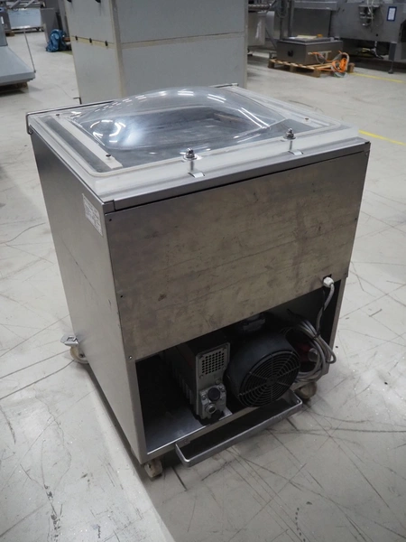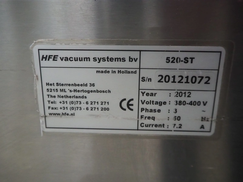 HFE vacuum systems bv mobile vacuum machine, model: 520-ST, serial number: 20121072, year of construction: 2012, 380/400 V, 3 Ph, 50 Hz, 7.2 A, seal length: (2x) 500 mm, chamber dimensions: 610 mm x 510 mm, Busch vacuum pump, type: RA 0063 F 5K3, type: 63 m³ per hour, total dimensions: 720 mm x 720 mm x 1000 mm.
