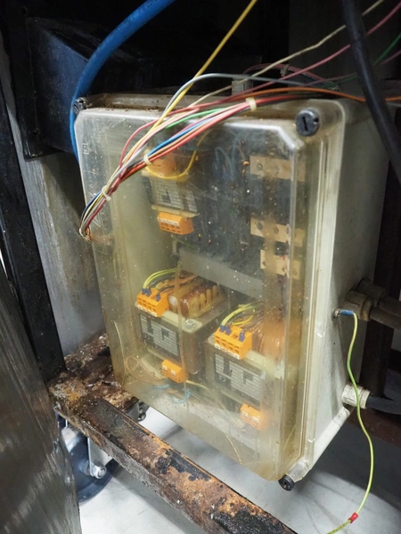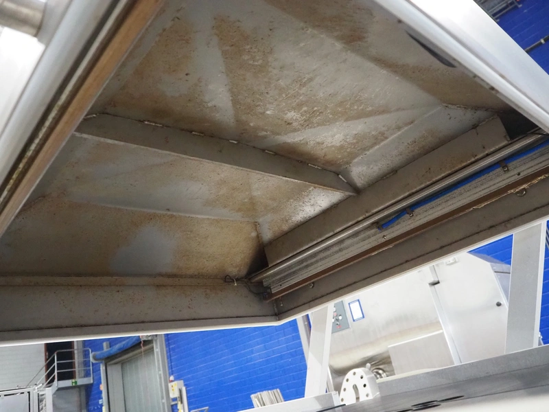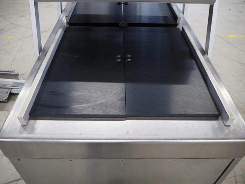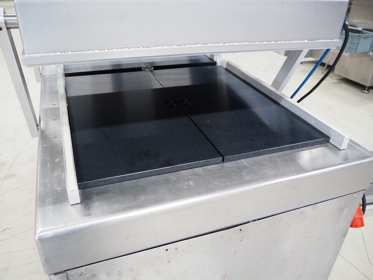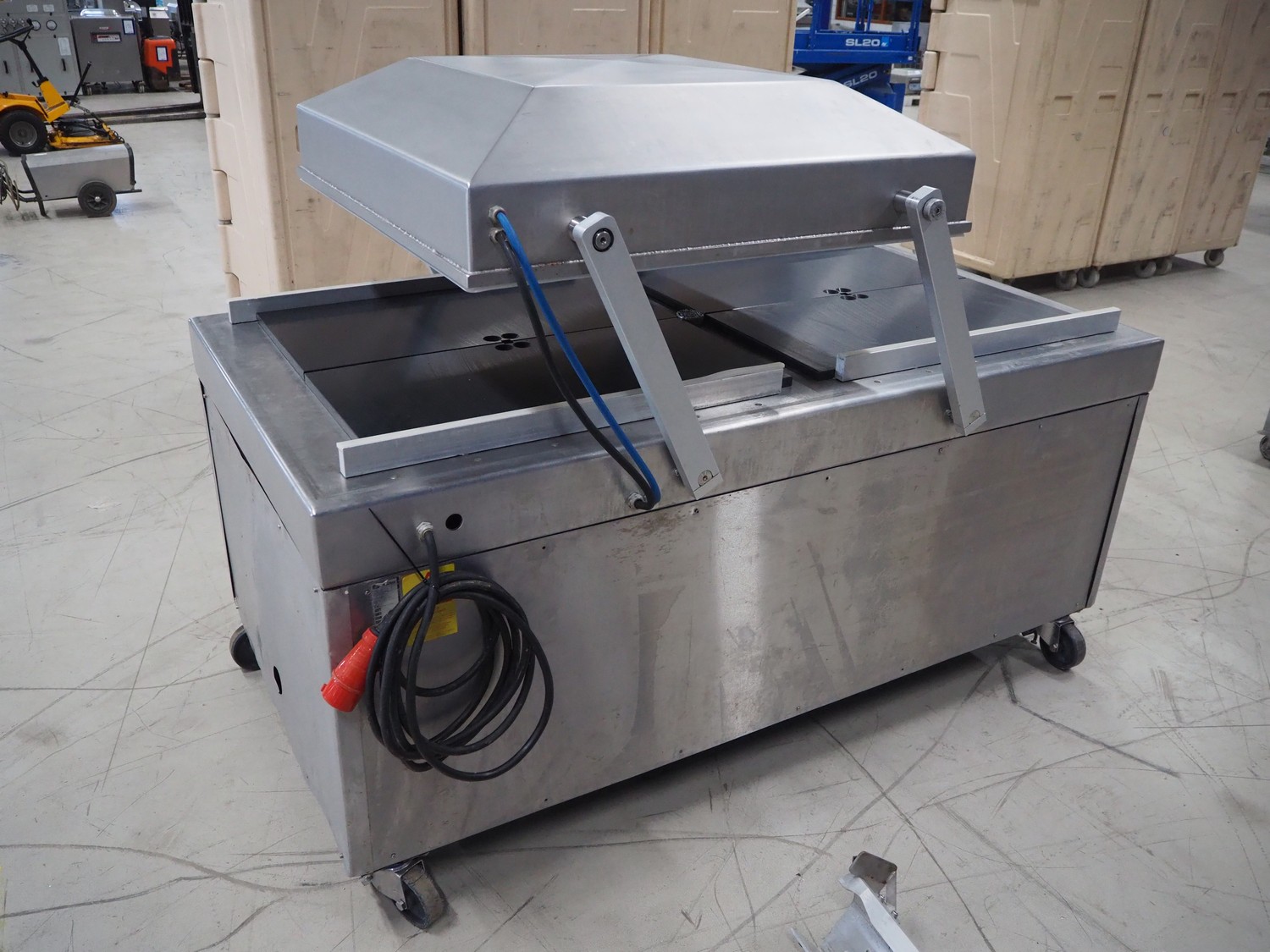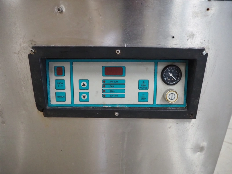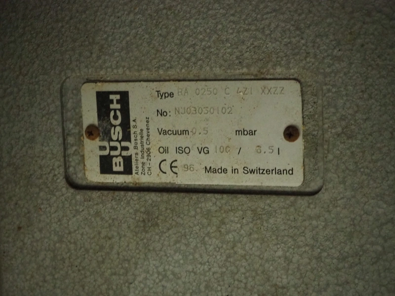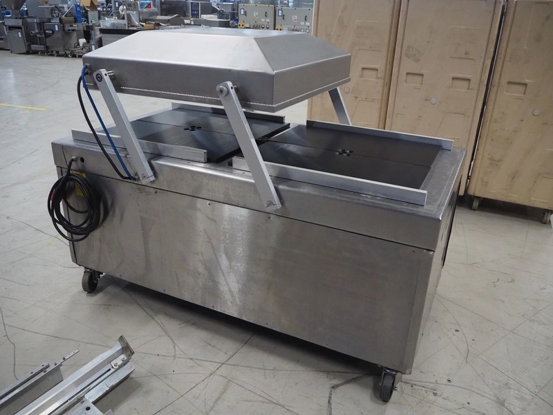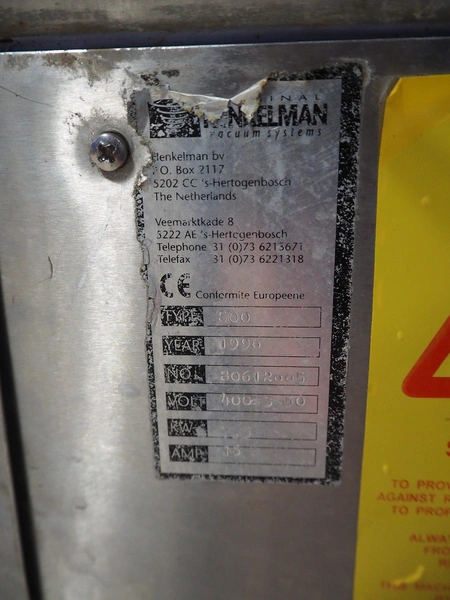 Henkelman BV mobile double chamber vacuum machine, type: 800, number: 80612005, year of construction: 1996, 400 V, 3 Ph, 50 Hz, seal length: (4x) 840 mm, chamber dimensions: (2x) 990 mm x 960 mm, Busch vacuum pump, type: RA 0250 C 4Z1 XXZZ, capacity: 250 m³ per hour, total dimensions: 2000 mm x 1200 mm x 1250 mm.