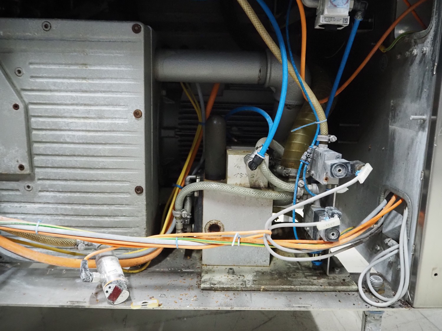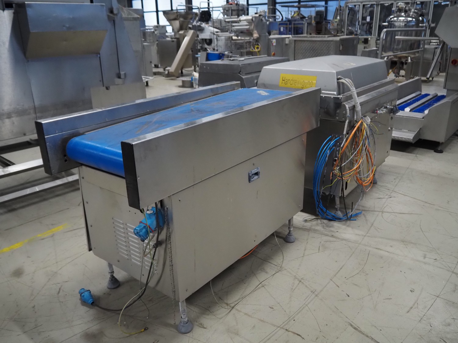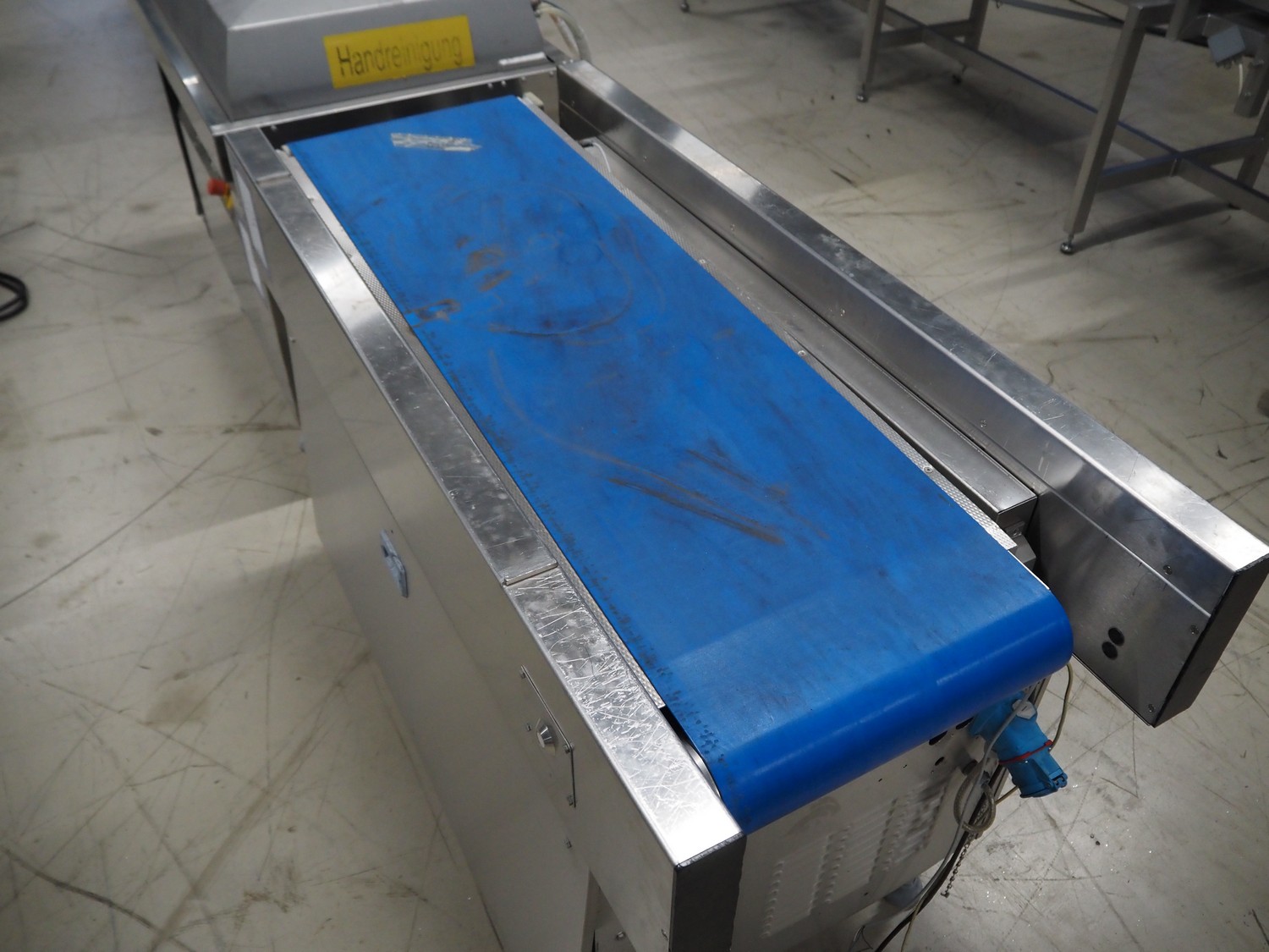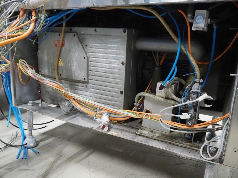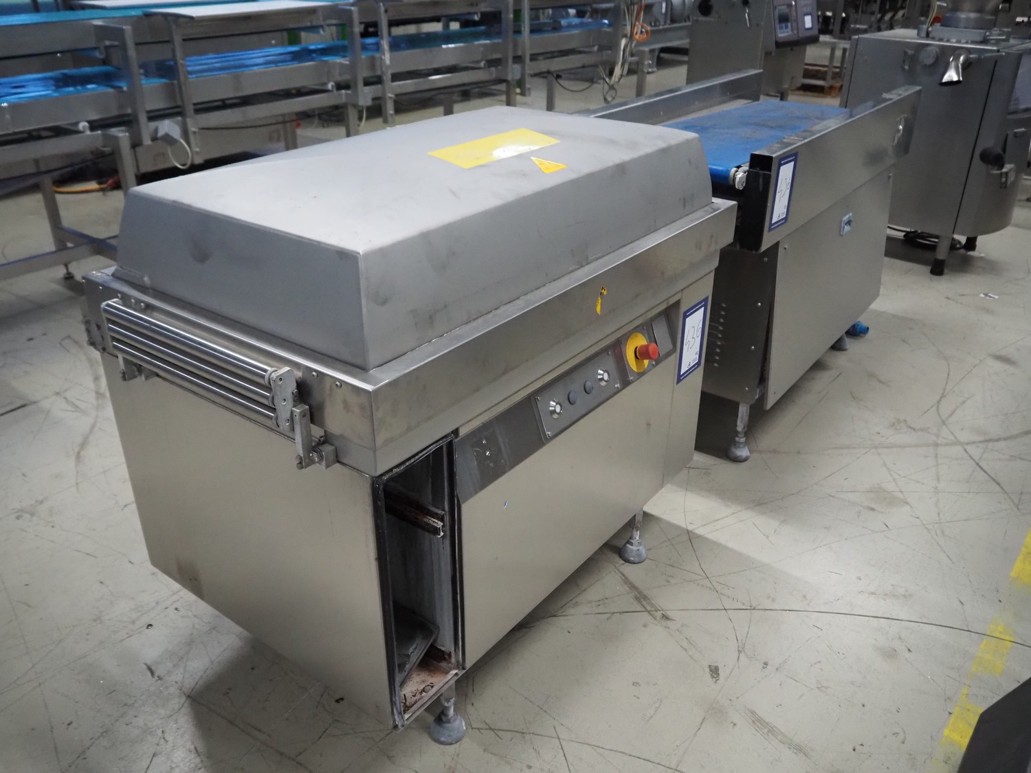 Belt vacuum machine, plastic belts, belt width: 400 mm, seal length: 1070 mm, dimensions chamber: 1070 mm x 500 mm, total dimensions vacuum machine: 1600 mm x 700 mm x 1050 mm, dimensions transport belt: 1450 mm x 900 mm x 1250 mm. Technical condition unknown, incomplete, electrical cabinet inside missing.