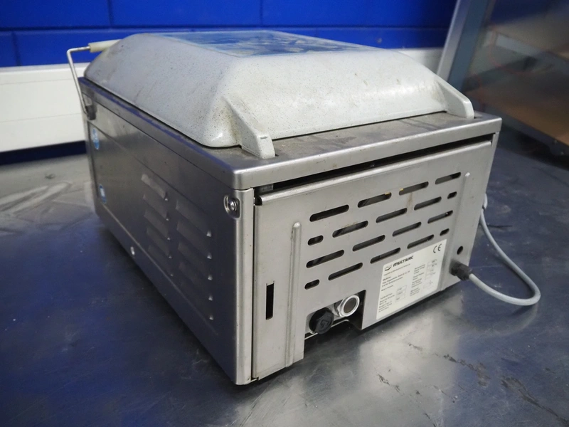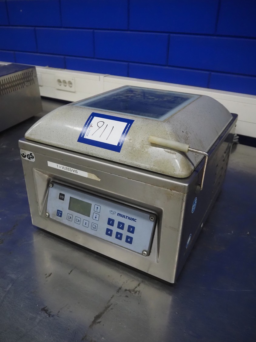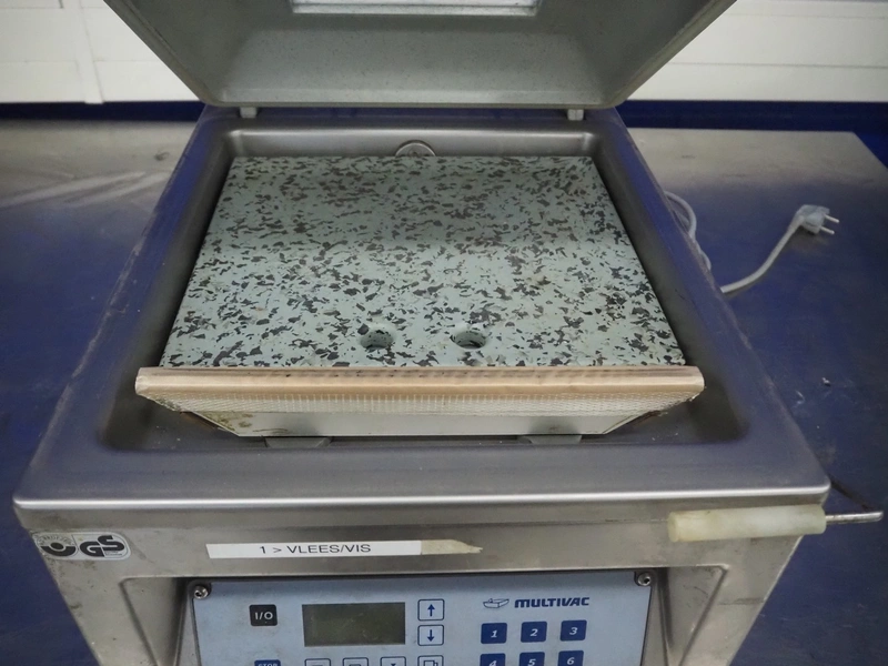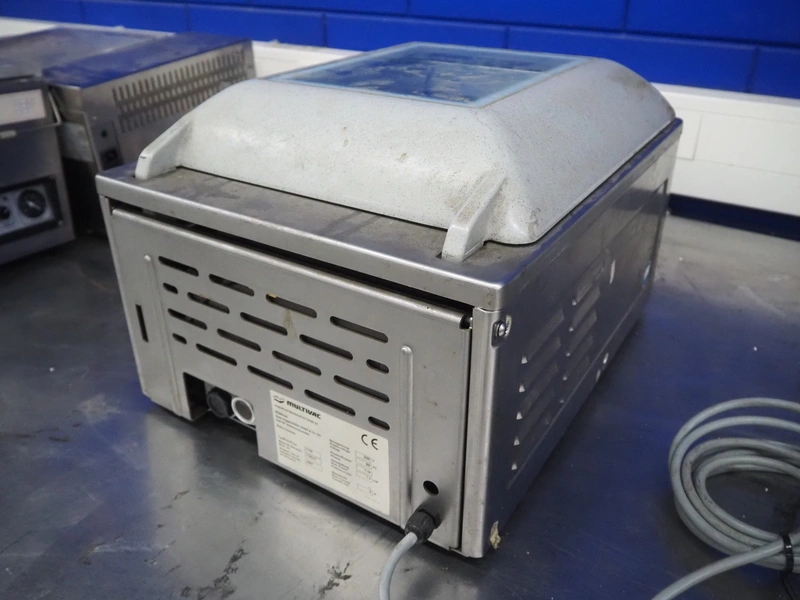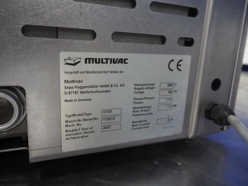 Multivac vacuum machine, model: C100, machine number: 119310, year of construction: 2007, 230 V, 1 Ph, 50 Hz, 4 A, 1.2 kW, seal length: 315 mm, dimensions chamber: 335 mm x 320 mm x 30 mm, total dimensions: 500 mm x 400 mm x 330 mm.