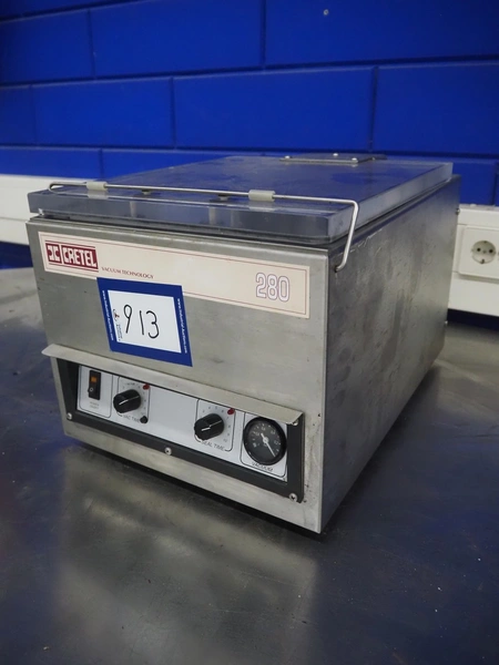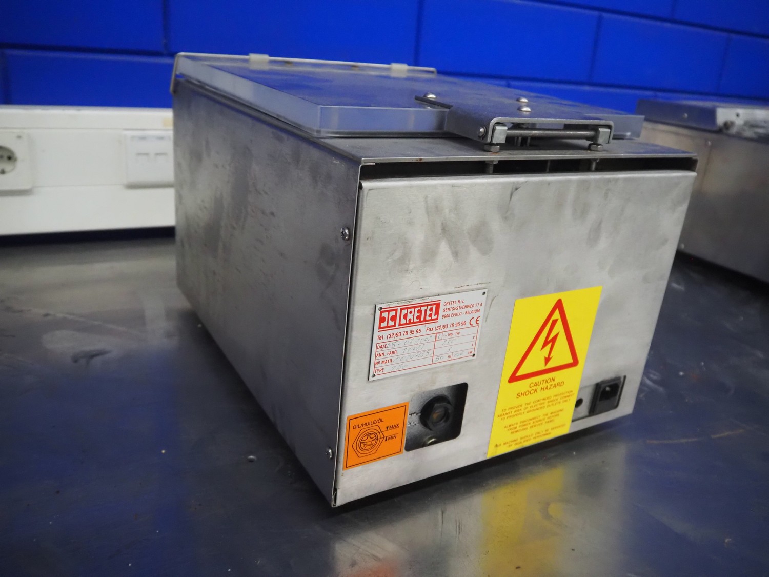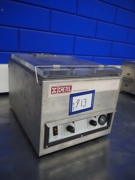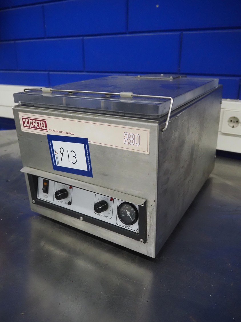 Cretel vacuum machine, type: 280, serial number: 00207335, year of construction: 05-07-2002, 230 V, 1 Ph, 50 Hz, 3 A, 0.6 kW, seal length: 275 mm, dimensions chamber: 280 mm x 345 mm x 45 mm, total dimensions: 320 mm x 460 mm x 280 mm.