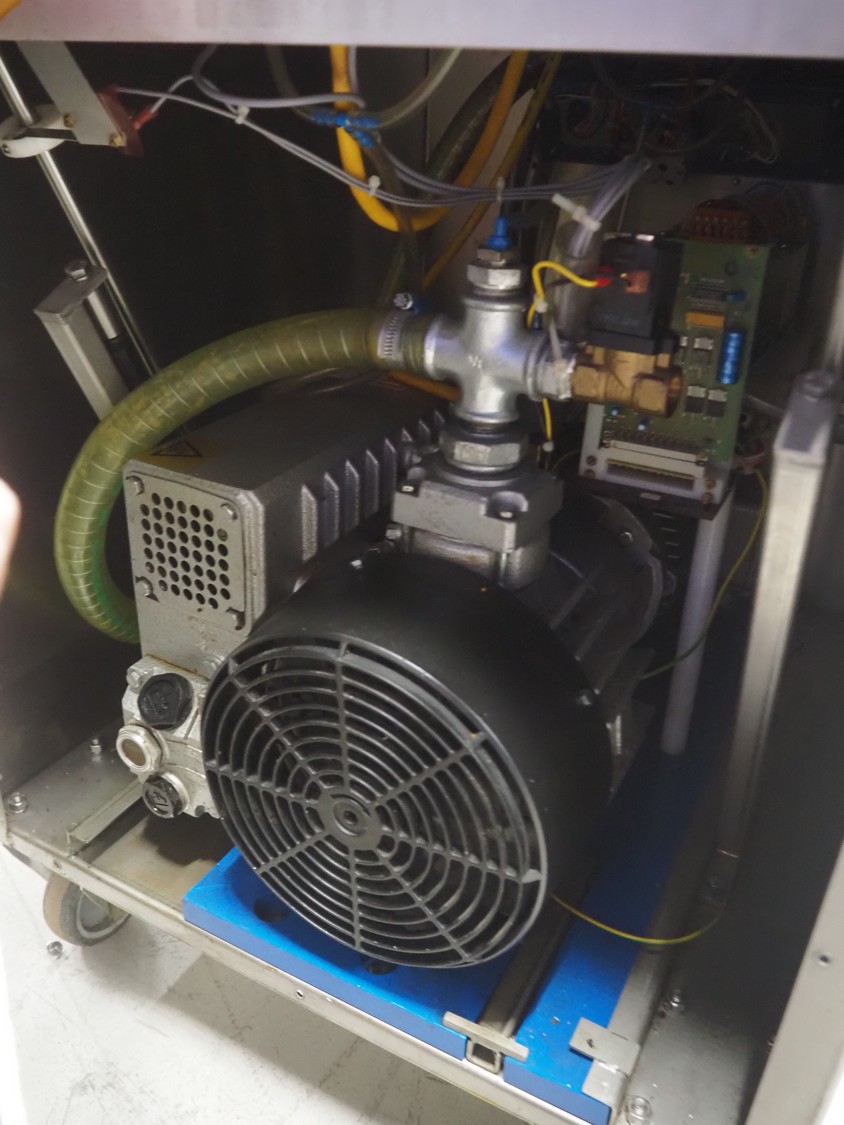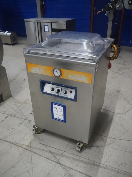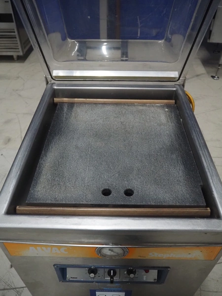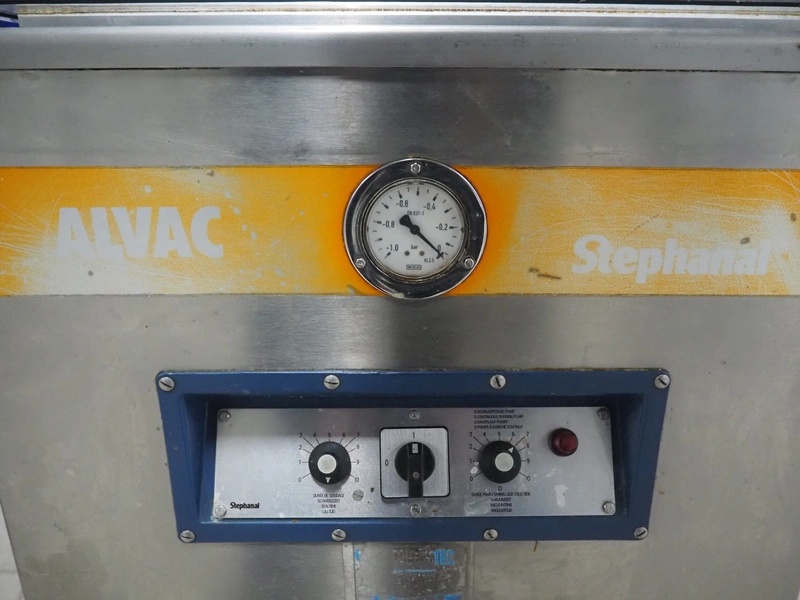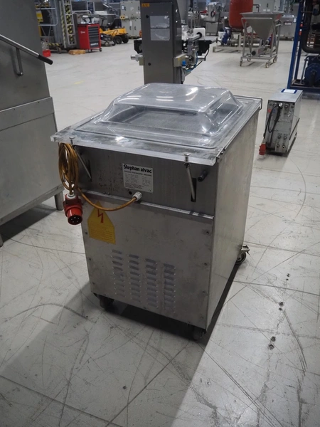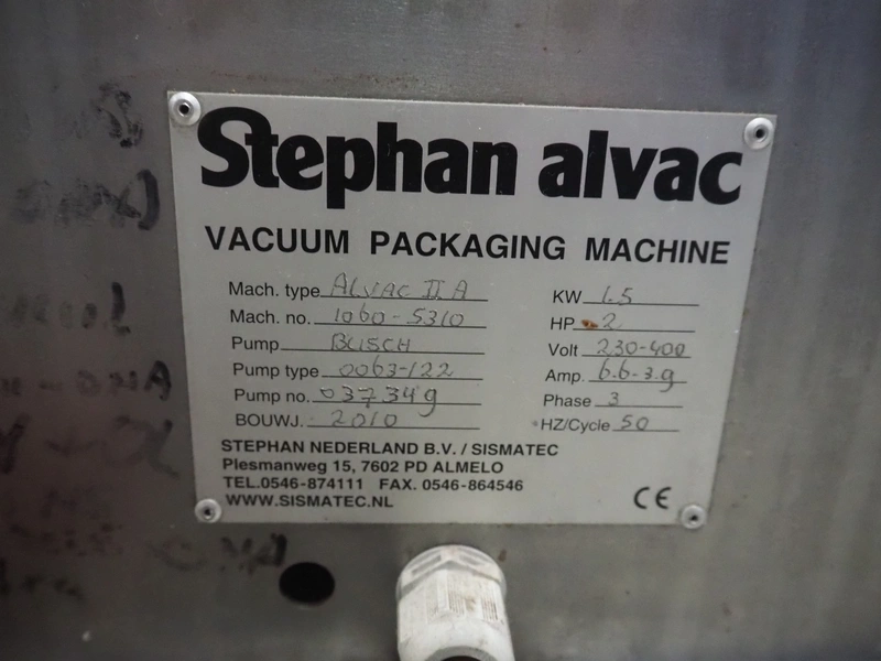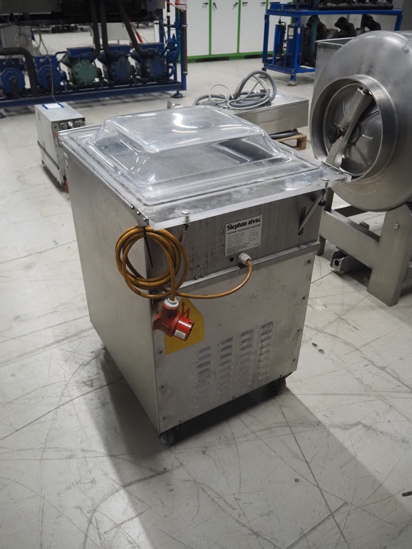 Stephan Alvac mobile vacuum machine, type: Alvac IIA, number: 1060-5310, year of construction: 2010, 230/400 V, 3 Ph, 50 Hz, 6.6/3.9 A, 1.5 kW, seal length: (2x) 500 mm, chamber dimensions: 500 mm x 500 mm, Busch vacuum pump, type: 0063-122, capacity: 63 m³ per hour, total dimensions: 600 mm x 700 mm x 900 mm.