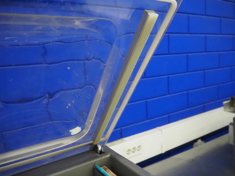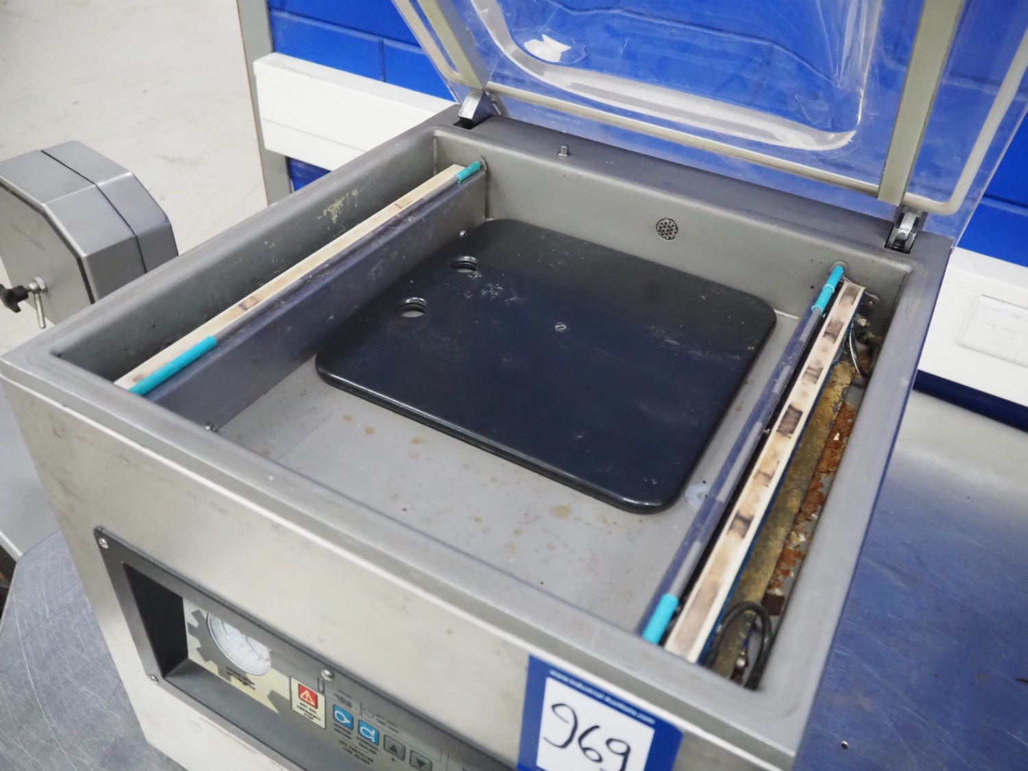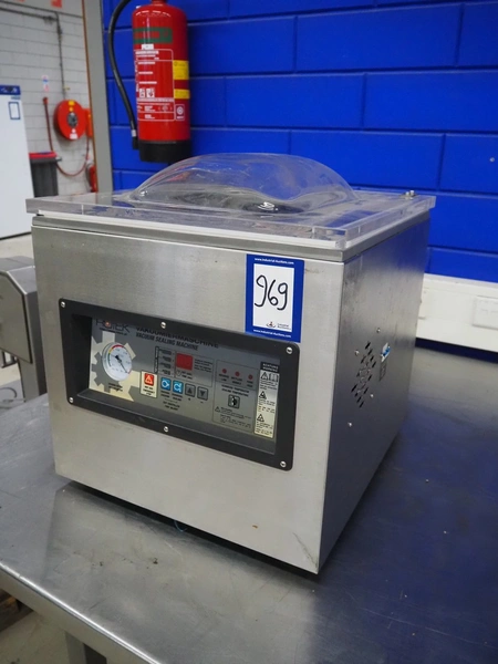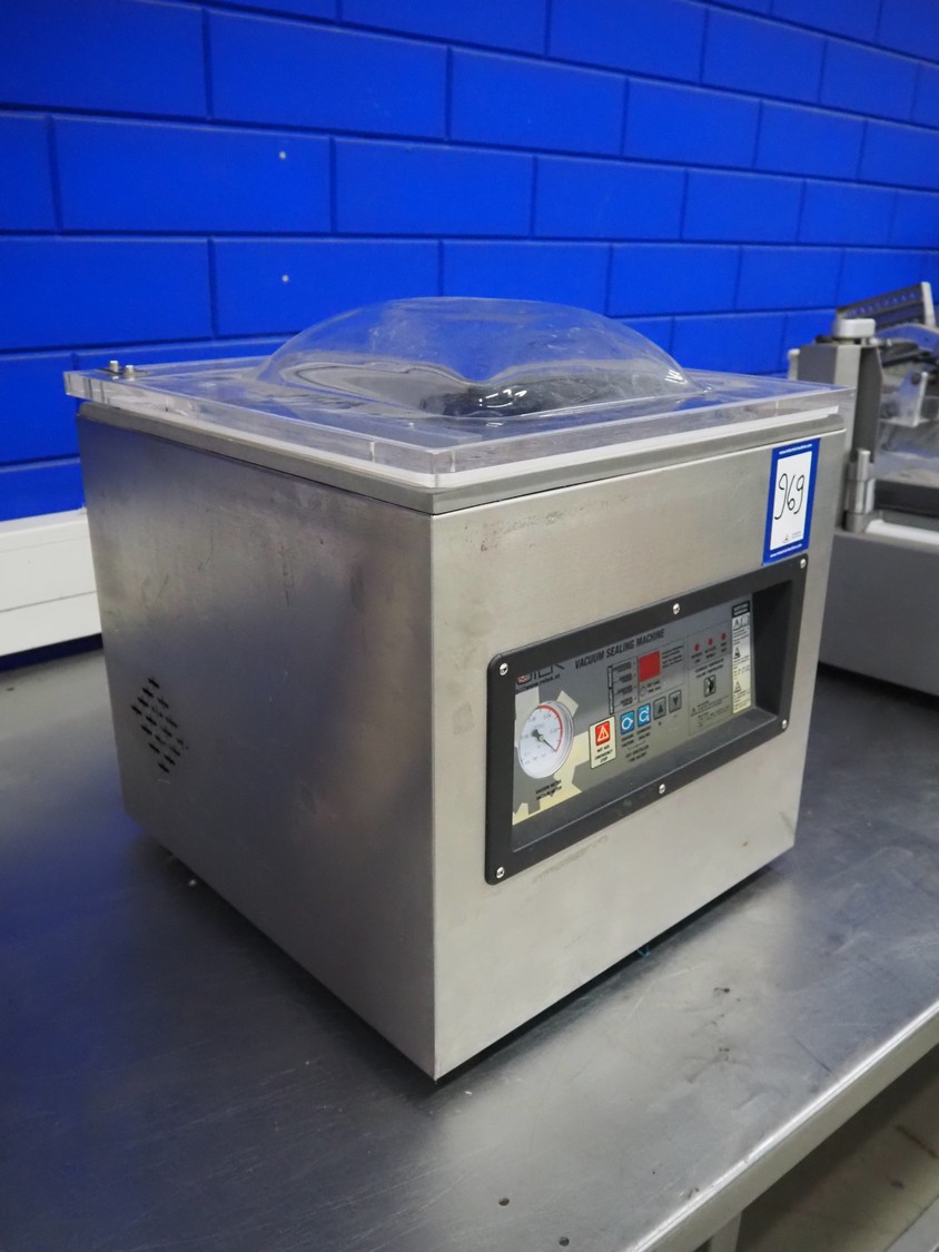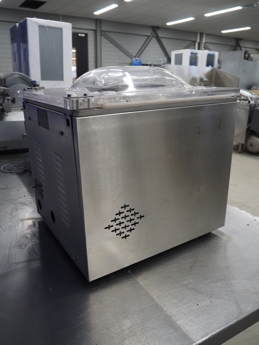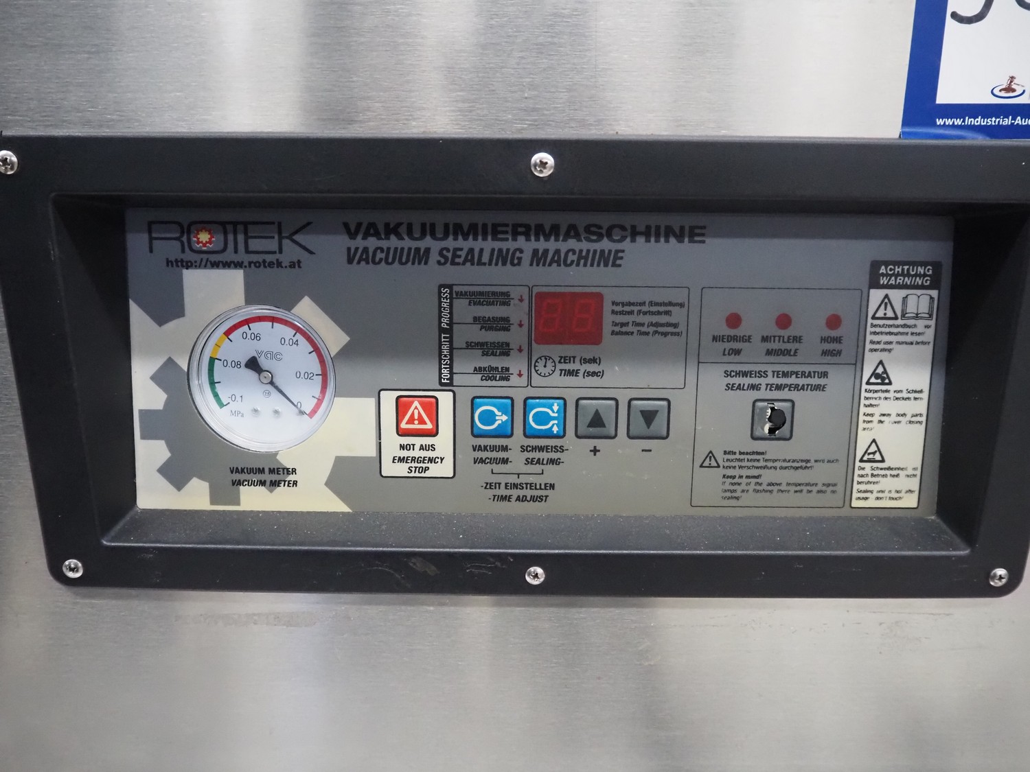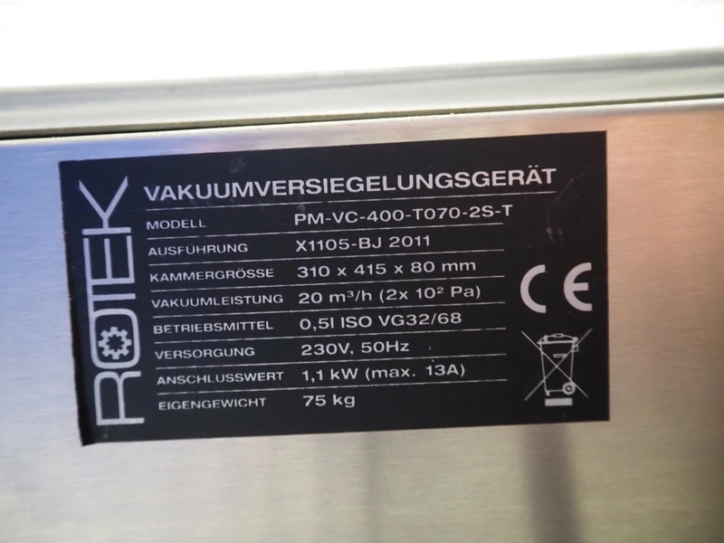 Rotek vacuum machine, model: PM-VC-400-T070-2S-T, number: X1105, year of construction: 2011, 230 V, 50 Hz, 13 A, 1.1 kW, weight: 75 kg, seal length: (2x) 400 mm, chamber dimensions: 310 mm x 415 mm, vacuum pump, capacity: 20 m³ per hour, total dimensions: 550 mm x 500 mm x 600 mm.